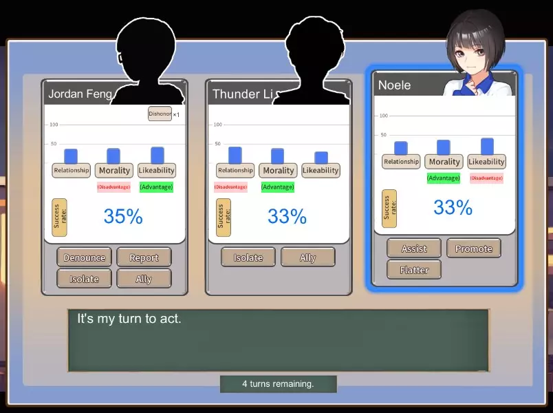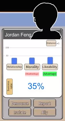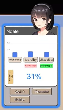协助 - 使用魅力属性,增加成功率和好感度,降低关系值,有几率获得耻辱 晋升 - 使用智商属性,增加成功率和道德值,降低好感度 奉承 - 使用面子属性,增加成功率和关系值,降低道德值,有几率获得耻辱 对对手的可用选项