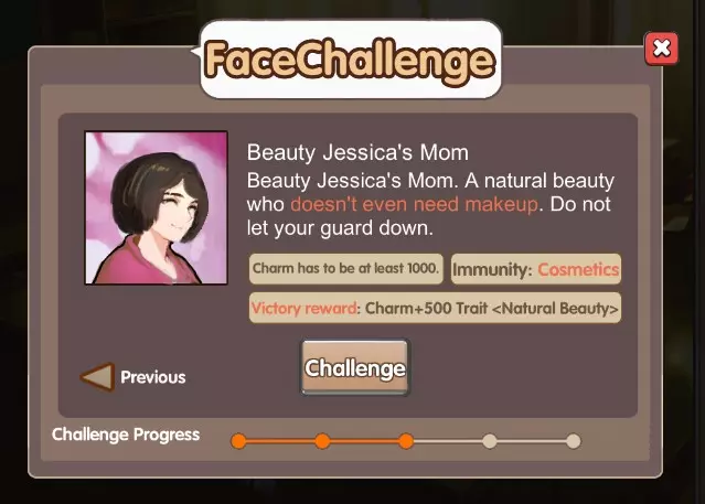 外观挑战“美女杰西卡的母亲” 要求:魅力值超过1000 限制:对外观类特性免疫 奖励:+500魅力值和传奇特性【天生丽质】