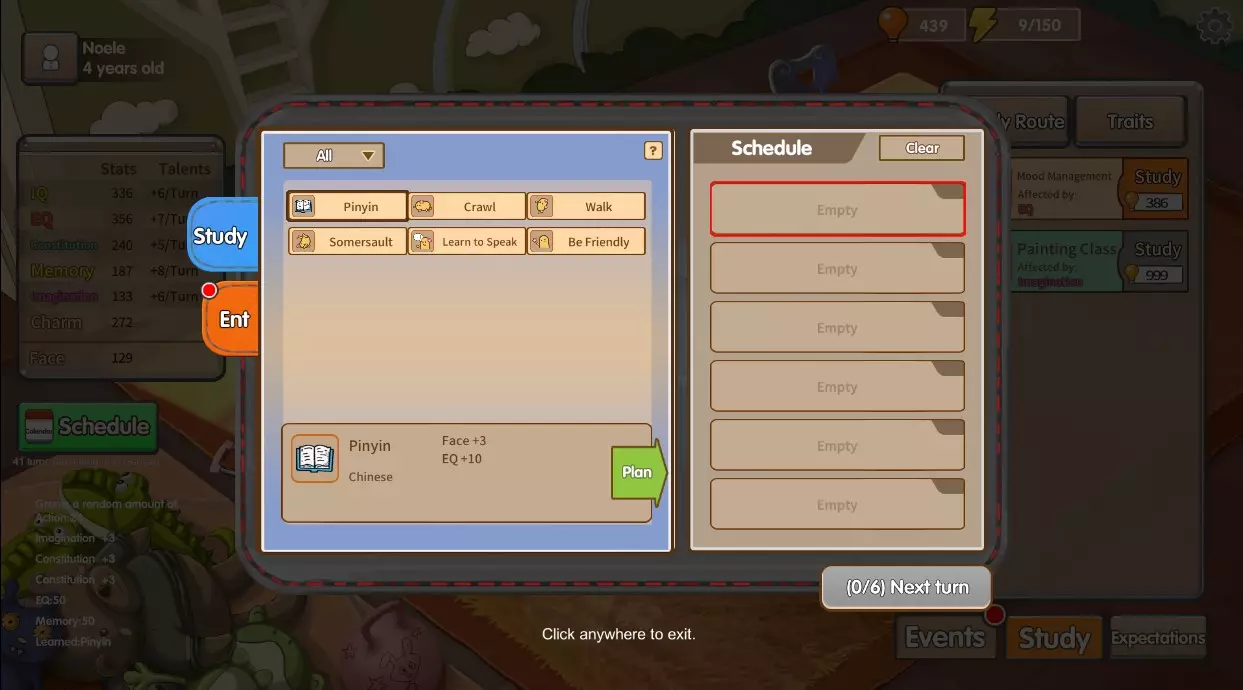 Matt Chi Personality - Creative and Self-Absorbed Interests - Painting and Art Unlocked - After learning "Coloring" Request Calendar Bolded and boxed give Legendary TraitsItalics give Epic Traits If gender is specified it means that trait is only given to that gender, not that it is a gender specific activity Turn Span Purchasable activities 41-38 Resident Community 75% Sofa Trampoline 50% Tablet Games 25% 37-34 Electronic Piano 75% Playdough 50%(M)Playground 25% 33-29 Pay-to-win Games 75% Extra-curriculum 50%(M) Nindoten 25% 28-23 Summer Camp 75% Financial Investment 50% China Travel 25% 22-19 Basketball Tickets 75% Horse Riding 50% Southeast Asia Travel 25% 18-13 Commemorative 75% Idol Concert 50% Choosing Snacks 25% 12-8 Art Movie 75% Luxury Snacks 75% New Phone 25% 7-5 Europe Travel 75%(F) Gym 50%(M) Project Hope 25% 4-0 Rent an Apartment 75% 3 years of Practice 50% Huanggang Exam 25% Gameplay Tips How to spend knowledge SAVE IT UP. It is tempting to buy activities when they only cost 200 and you have 1.5k saved up. DON'T! These little ones add up and towards the end game you want to have a minimum of 2k knowledge to spend. You want to have that knowledge saved up so that you can buy any last minute job skills or chinese/english/math you need after getting the huge stat gains from Huanggang Exam. Remember, when you unlock a skill the next level isn't available till the next day so you can't wait till turn 0 when skills are cheapest. Also, a trait can never cost more than 999, so even without the right stats if you save up your knowledge and only spend it when activities cost 100 or less you can get max profession activities even when buying at full cost! Liberal Arts/Science Only train in Liberal Arts/Science if you plan on focusing that one skill, if you alternate between them you stat gains are canceled out and the singular chinese and math skills give better face points Most important Activity in the game "Huanggang Exam" It gives; +20 satisfaction +5 stress +300 IQ +300 EQ +300 Memory and +300 Imagination It is available through request purchase at 4 turns left. Getting this activity is one of the only times I recommend save-scumming i.e. alt-f4 if you can't unlock it since it is only at 25% Save-Scumming Not as much fun to do but if you decide to use it than be sure you exit to main menu BEFORE trying the risky activity, this will save your game as sometimes the auto-save feature does not work. When you reopen your game you will be at the beginning of your turn, losing any other progress you had made that turn, so save scum first before doing events, mini-games, etc. Romancing Unless you are going for achievements there seems to be no reason to romance multiple people so save your action points! Also, when playing a female don't forget to set your interest for you after school activity, and the other two as they unlock through gameplay for passive relationship increases Challenges When you enter a challenge, the trait pool is actually given to you in the order the stats will be given to you, meaning the top 3 traits will be the first batch you can select from, the second row will be given next. Works from top left to bottom right so refresh if all your best skills are towards the end Getting a good profession This is all about balancing the activities unlocked. Your stats don't actually matter in the end, they just determine activity purchase prices. So even a 10k IQ won't get you in to a good school if you haven't learned basic algebra. You will need to get in to a good college AND have all your profession talents unlocked. This is easy for certain professions like Host or E-sports that only have 7 activities, but difficult for professions like computer science that have 12. You should pick a singular focus and not waste knowledge on other interests so as to save up points and buy high level skills at 999 aka full price. If you need money during play I recommend doing a 10 action job with 12 money gain and spending most of an entire turn doing it. The first few times the gains are small but by the 3rd-5th time the gains in urge will alternate and instead of going up by .1 point it has a chance to increase in increments of .5 Stress reduction The best method is to visit the shop and buy the top stress reduction item. You can only do this twice per turn but it can decrease by a HUGE amount, allowing you to do less recreation and more studying. Not all recreation is the same! Some will not decrease parent satisfaction like summer camp, some can even increase it like High-end tutor or Huanggang Exam. Also, Many of the request activities have pretty impressive stat gains! I've had games where it was less about balancing stress and more about keeping satisfaction up O,o fortunately there is a store item for that as well! Treasure map steps 1 - Crawl(F), Turn Over 2 - Jump shot(F), male missing, lvl 3 athletics 3 - Somersault(F), Run(M) 4 - Writing, lvl 4 chinese 5 - Philosophy 101, lvl 8 liberal arts 6 - Sketching, lvl 4 fine arts 7 - Database 101, lvl 3 computer science 8 - missing 9 - missing While it is cute I don't know what actual rewards are gained from it and I haven't seen any particular benefit to completing it on every generation, please correct me if I'm wrong!! Romance as a Male This section was contributed via unabridged comments from "Akechi Joker". Comments are still available in comment section. Thank you so much for your contribution! I'm on my 5th girl in a row, i may have to save scum to finally get a male -_- Romance as a Male is ♥♥♥♥♥♥♥ DIFFICULT. It is SO PAINFUL and I only recommend attempting to romance people if you're at LEAST a couple of generations in so that your stats can increase well while you're trying to flirt. Unlike when you're a female, as a male you can't have passive relationship gains. You can only gain relationship points through interacting with the girls and, from my experience, they have a lot more "Intimacy Lowered" reactions
