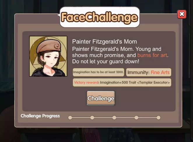 艺术挑战者【画家菲茨杰拉德的母亲】 需求:想象力>1000 限制:对艺术类特性免疫 奖励:+500想象力和传奇特性【圣殿执行官】