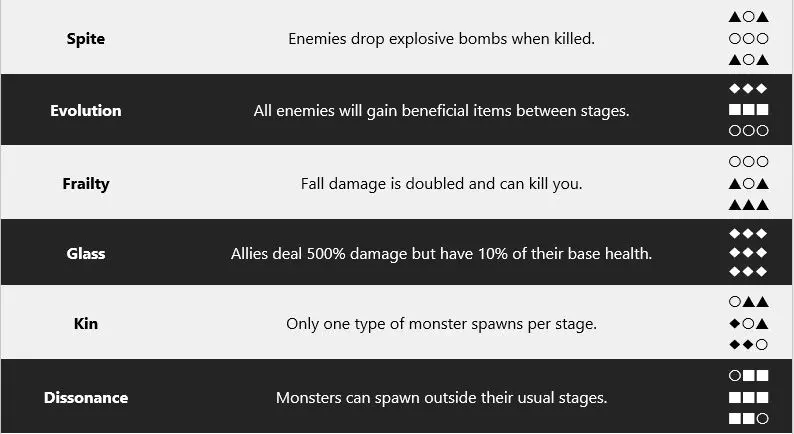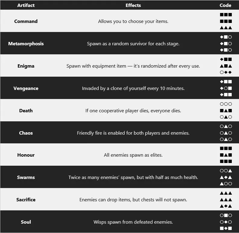神器代码列表 4种形状分别是(1)立方体、(2)三角形、(3)菱形和(4)球体。合成生成区域是你将这4种形状输入到9个象限中以解锁神器的地方。为了方便大家,我已将《雨中冒险2》中的全部16个神器代码整理到以下列表中: