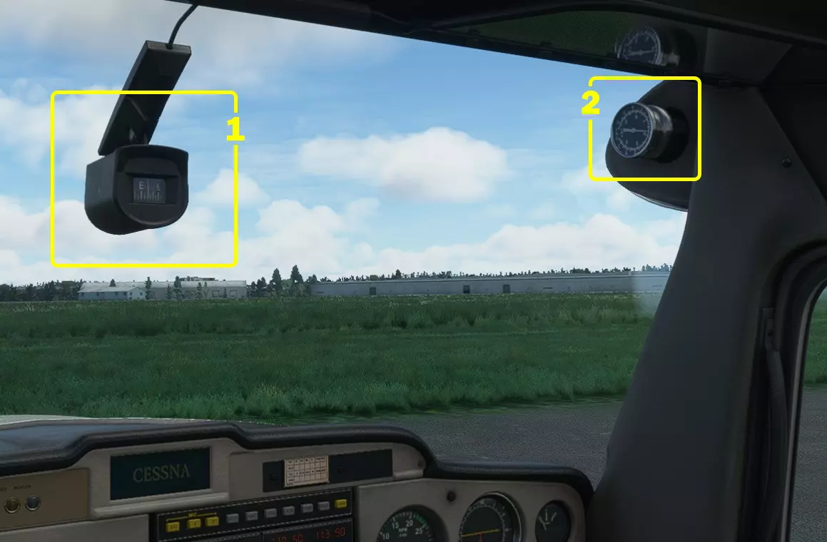 风挡上方的仪表 1:磁罗盘——磁罗盘在地面或平飞时显示飞机航向。飞机倾斜时无法工作,因此飞行中需使用航向指示器。航向指示器会随时间漂移,因此在稳定平飞时应定期根据罗盘校准以显示准确读数。 2:温度计——温度计显示飞机外部温度,单位为摄氏度和华氏度。 下部驾驶舱