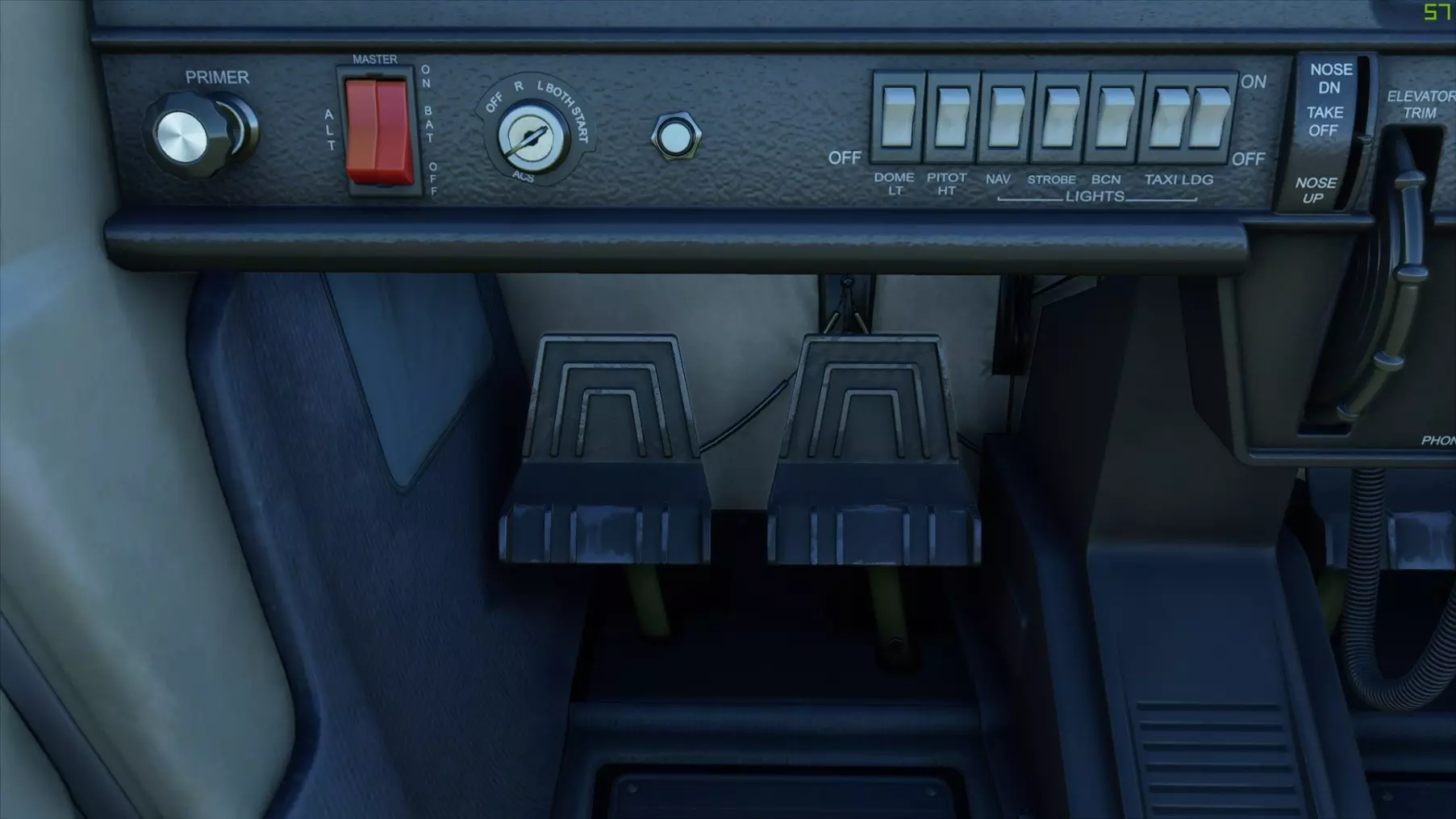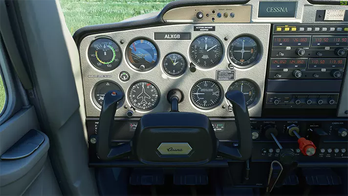这些是方向舵踏板,用于控制飞机的方向舵。 这听起来可能需要学习很多东西,但如果你在模拟器中进行一次自由飞行,应该能很快自己弄明白所有操作。 ——驾驶舱导览—— 本指南的主要内容是对塞斯纳152驾驶舱的深入导览,因此这部分将是最大的章节。 免责声明:我只会介绍Asobo塞斯纳152中可操作的系统,因此本指南会遗漏真实飞机上存在的一些系统。 主面板
