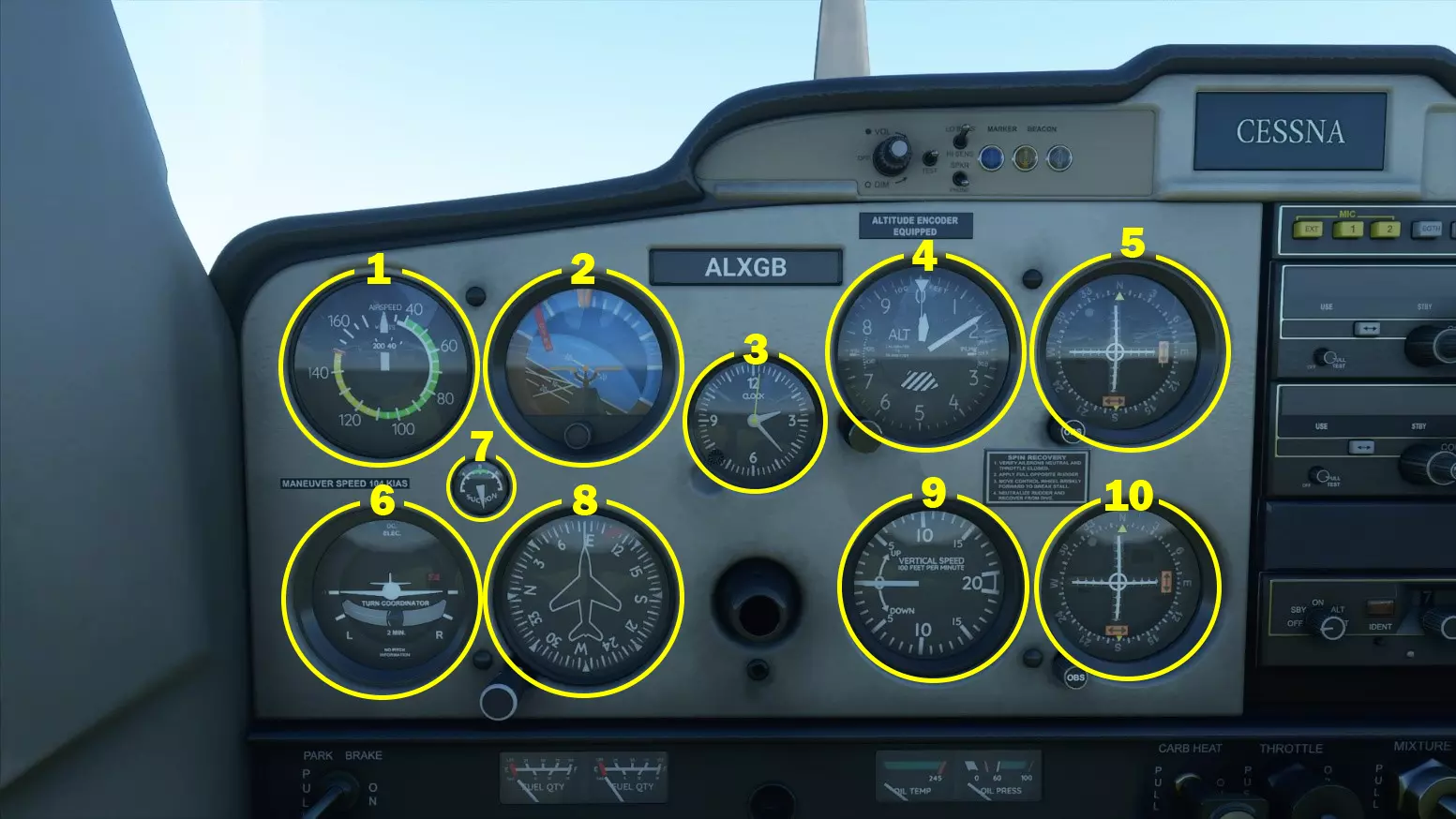 塞斯纳152的主仪表板 1:空速指示器——表盘外侧显示指示空速(单位:节,KIAS),内侧显示英里每小时。白色弧线最高达85节,代表襟翼操作范围,若未完全收起襟翼,请勿超过白色弧线。绿色弧线代表飞机的正常操作速度,黄色弧线代表仅在平稳气流中飞行的速度。红线代表可能发生结构故障前的最大速度。绿色和白色弧线的起点代表失速速度。 2:姿态仪——一种陀螺仪,用于指示飞机的姿态(相对方向)。蓝色区域代表天空,棕色区域代表地面,两者交汇处为地平线。顶部的橙色箭头表示飞机相对于地平线的坡度角。当飞机倾斜时,橙色箭头会从显示屏上半部分的中间向外侧移动,依次经过标记线,分别表示0度、10度、20度、30度、60度和90度坡度角。注意,陀螺仪仅在发动机运行时工作。 3:模拟时钟 4:高度表——显示飞机当前的高度(单位:英尺)。较长的指针代表数百英尺,较短的指针代表数千英尺。塞斯纳152的实用升限为14700英尺,因此建议将飞机保持在该高度以下以获得良好性能。旋钮可用于将高度计校准为外部大气压力,单位可以是英寸汞柱(Hg)或毫巴(mb),以确保仪器读数准确。 5:航道偏离指示器(NAV1)——用于导航,可调谐以接收地面甚高频全向信标(VOR)的频率,并引导飞机飞向信标。它也可以调谐到仪表着陆系统(ILS)频率,使飞行员在能见度不佳时能沿下滑道下降至跑道。在Asobo的塞斯纳152中,这些系统的模拟相当精确,但本指南不会涵盖航道偏离指示器的操作程序。6:转弯协调仪——该仪表上的飞机通过向转弯方向倾斜来显示转弯速率(航向变化率),倾斜程度会根据转弯速率的快慢而变化。重要的是要记住,这不是坡度指示器,不要将其用作坡度指示器。中间带有黑点的管子代表飞机的平衡状态,在正常飞行操作中,良好的做法是使用方向舵将球保持在中心位置,以保持飞机良好的平衡或“协调”状态。在表盘外侧,水平线下方的两个标记代表标准转弯速率。这意味着如果将飞机保持在其中一条线上并将球保持在中心位置,完成360°转弯将需要两分钟。这在书面上可能难以理解,所以我建议你进入模拟器,在空中实际操作体验一下。