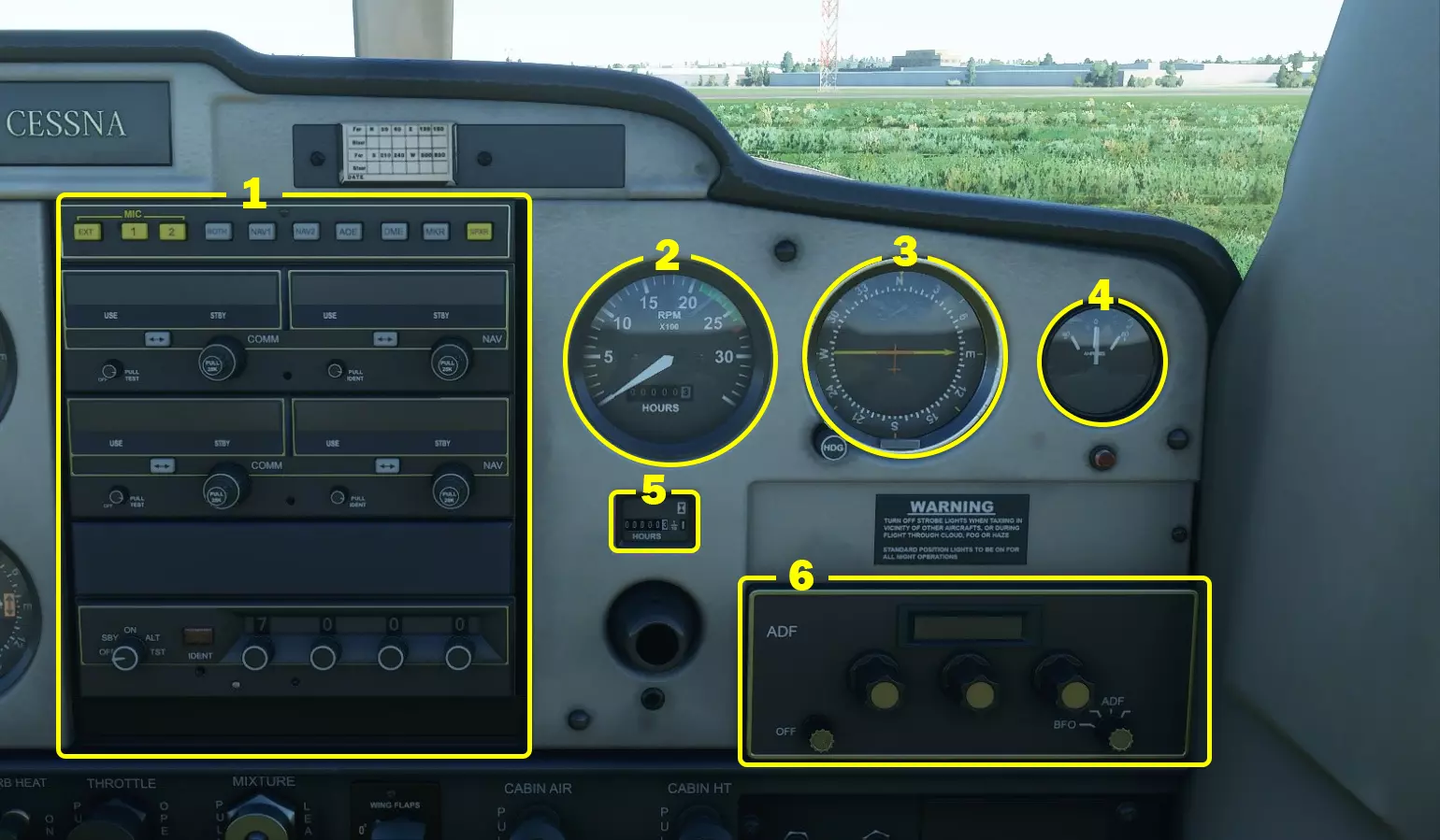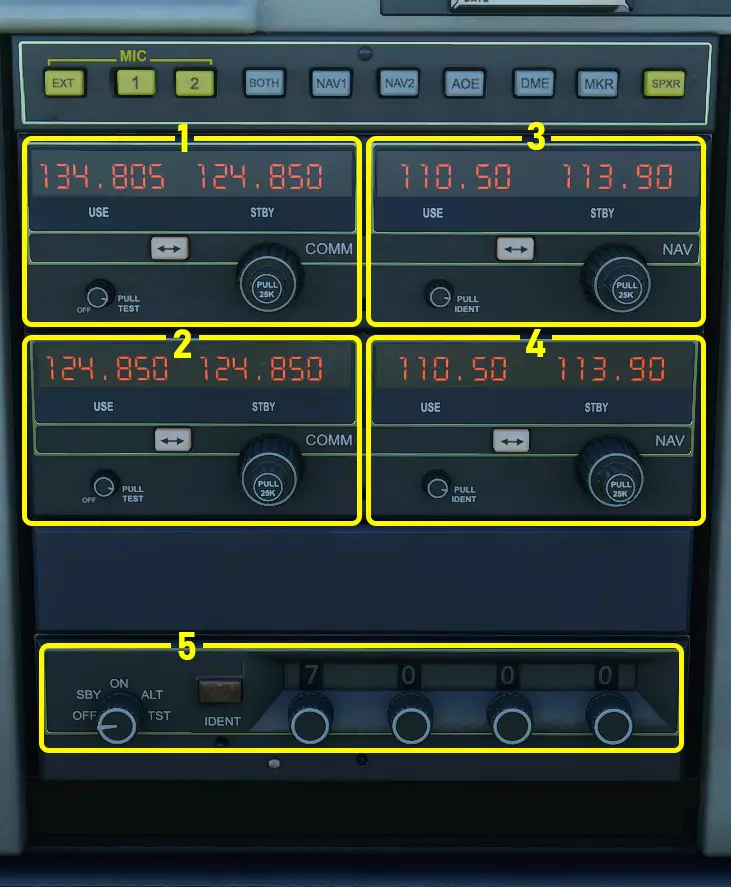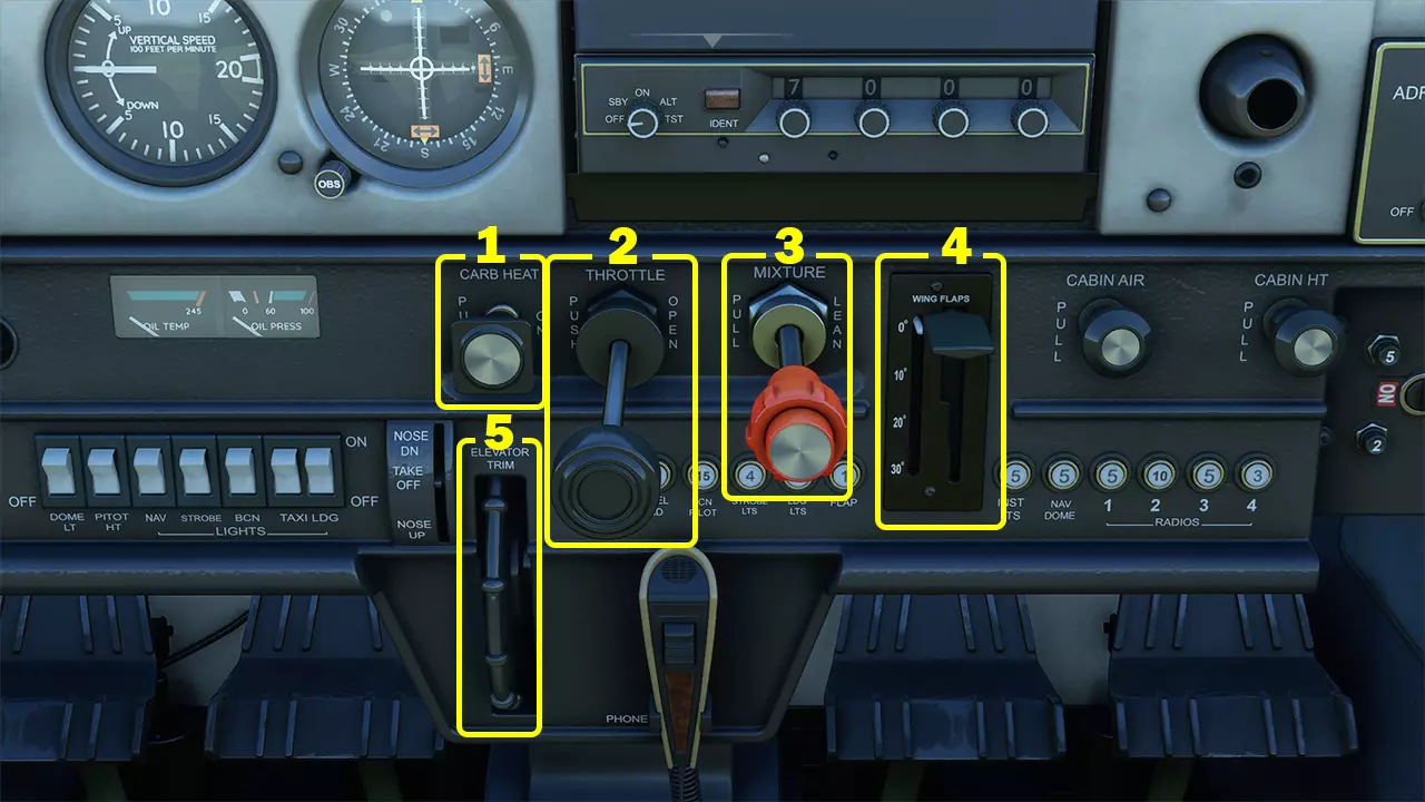 塞斯纳152的无线电面板(或电子通信与导航设备) 1:COMM1——这是用于调谐空中交通管制的主设备。使用时,确保左下角旋钮未指向“关闭”标志,然后转动设备右下角旋钮,直至所需频率(此处为124.850)显示在STBY标签上方。接着按下带有两个箭头的按钮,将STBY频率切换为USE,现在你可以通过ATC选项卡与空中交通管制通话。 2:COMM2——与COMM1功能相同,如需要可同时调谐两个频率。 3:NAV1——用于配合航向偏离指示器1(参见主面板)进行导航。如前所述,我暂时不会介绍如何操作这些功能,但可能会在日后将其添加到指南中。 4:NAV2 - 与NAV1相同,只是它控制航向偏离指示器2。 5:应答机 - 用于向空中交通管制传达你的高度等数据。当需要时,空中交通管制会给你一个4位代码输入应答机,在模拟飞行中,你可以让副驾驶来操作。 上部驾驶舱