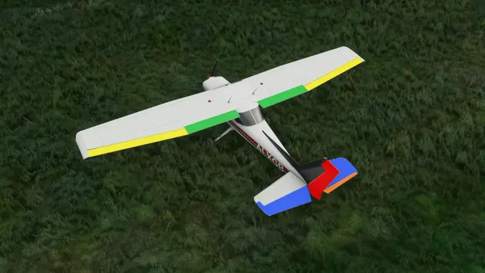 塞斯纳152的活动操纵面,颜色标识如下:黄色、绿色、红色、蓝色和橙色 黄色:副翼 - 用于控制飞机的横滚。向左转动驾驶盘(见下文)会使飞机向左横滚,反之亦然。 绿色:机翼襟翼(襟翼) - 用于使飞机在较低速度下保持空中飞行,通常在着陆时使用。指南的驾驶舱导览部分中有关于如何使用襟翼的说明。 蓝色:升降舵 - 用于控制飞机的俯仰。向自己方向拉动驾驶盘(见下文)会使机头抬起,向远离自己的方向推动则会使机头降低。 红色:方向舵 - 用于改变飞机的偏航。使用方向舵踏板控制(见下文)。向前踩左脚会使飞机向左偏航,反之亦然。 橙色 | 配平 - 用于保持飞机水平飞行,无需手动改变飞机俯仰角。本指南的驾驶舱导览部分有详细说明。