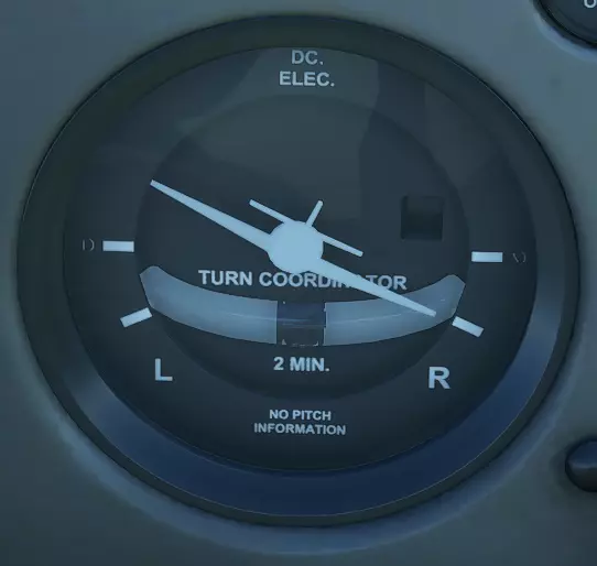 协调使用转弯协调仪进行右转弯 7:吸力表——显示可用于驱动姿态指示器和航向指示器等需要真空运行的仪表的压力。只要指针指向绿色弧线范围内,就有足够的真空度保证仪表正常工作。 8:航向指示器——显示飞机相对于罗盘方位的指向方向。该仪表必须不时手动根据罗盘(参见“上部驾驶舱”)进行校准,以确保指向正确方向。 9:垂直速度指示器——显示飞机是在上升还是下降以及升降速度。如果飞机正在上升,指针将指向显示屏的上半部分;如果飞机正在下降,则指向下半部分。表盘外侧的每个刻度代表每分钟100英尺。该仪表在保持高度时最有用,此时指针应指向表盘左侧的零位。 10:航道偏离指示器(NAV2)——其操作方式与第一个CDI(NAV1)相同。它可以与NAV1配合使用,以执行更复杂的程序,例如定位两个甚高频全向信标范围内的特定点,但本指南不会介绍如何执行此操作。 中央操纵杆