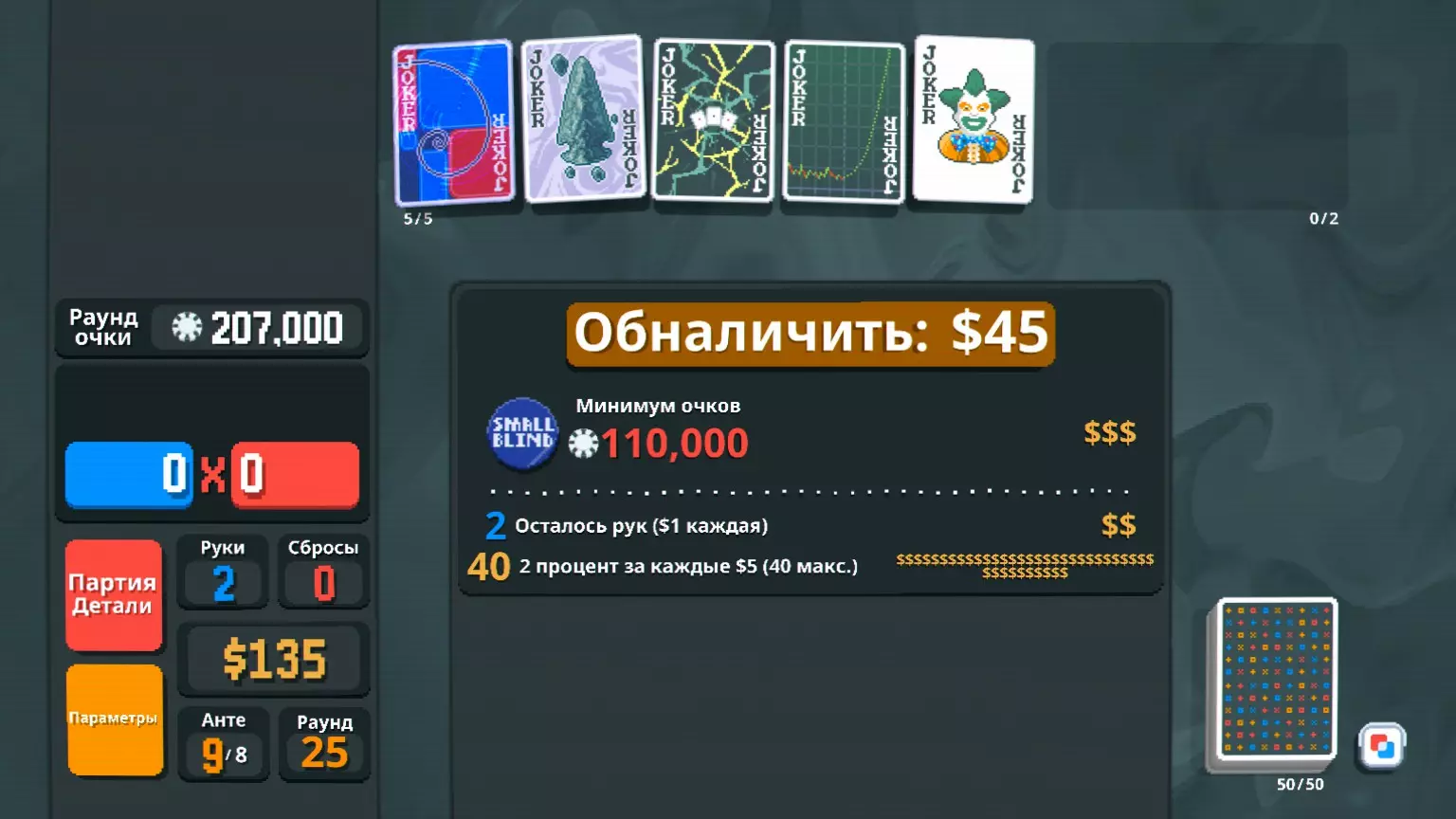 在设置中可以调整游戏速度(发牌、文字显示、场景切换等),最高可达4倍速以加快游戏节奏,也可降至0.5倍速以便查看翻转的卡牌和混合的百搭牌。 解锁所有可用的百搭牌、标签、优惠券、塔罗牌和光谱牌,以发现新的可能性。然后查看这些物品的收集情况,从而制定最佳策略。尝试完成那些能让你了解一些隐藏游戏机制的挑战,这些机制能让游戏过程更轻松。不要局限于一套卡组,尽可能多地尝试不同卡组。建议在完成第一局游戏后再继续阅读,最好是在你毫无头绪或者已经发挥出最大潜力的时候。游戏策略:实际上,几乎任何手牌都能通过第一注。我的第一次胜利是通过一对牌、提升手牌等级的百搭牌以及当手牌由3张或更少卡牌组成时+20的效果实现的。当时没有任何倍数加成(那时我以为10万筹码几乎就是最大数量了)。 在我看来,最糟糕的赌注是第二个。由于在第一个盲注阶段获胜没有奖励,游戏几乎迫使玩家跳过前两个底注,选择理想的标签,否则根本没有钱购买。正是因为这个设定,我对这款游戏的随机感消失了。好吧,我们来谈谈我采用的策略。 游戏刚开始的两个底注阶段,需要积累25-40美元的资金,因为金钱是这款游戏的主要货币。它既可以用来购买物品,也适用于某些【小丑牌】,甚至可以用来更改第三盲注的难度。 在资金不足时,应选择能提供良好开局的【小丑牌】(例如大量筹码、倍数加成),以及具有被动收入的【小丑牌】。只有这样,你才能顺利刷新商店、购买【兑换券】。始终预留25-40美元以获取收益(前提是有筹码储备)。最好玩【同花大顺】或【顺子】,因为它们最容易凑成。合理管理资金。如果你的筹码只剩下一两轮的量,不要把所有钱都用来加注,尽量找到能提高百分比上限的代金券。即使你不是特别需要,也要购买代金券,这样它们就不会在下一轮中重复出现。一定要购买塔罗牌组,它们可以为你增加额外的资金或强化牌组,而且在这些牌组以及光谱牌组中,你有可能获得传说级的百搭牌,它们可不是平白无故就被称为传说级的。其他套装请根据您的需求频率和实用性自行决定是否购买。
