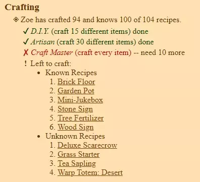 在本指南的这一部分,我会教你使用Stardew Checkup工具。 我玩过4次《星露谷物语》,其中两次完全通关(获得了所有成就)。那时候更容易……随着时间的推移和更新的推出,加入了新的制作物品和鱼类,这些成就的难度有所上升,因为现在需要收集的物品更多了。 在后面的章节中,可能不会统计某些物品,因为我没有机会重新游玩并更新内容。不过,我会教你使用一个工具,帮助你记录还缺少哪些东西。那时候我像这样用表格或清单会更简单,哈哈。什么是星露谷检查器,它有什么用?