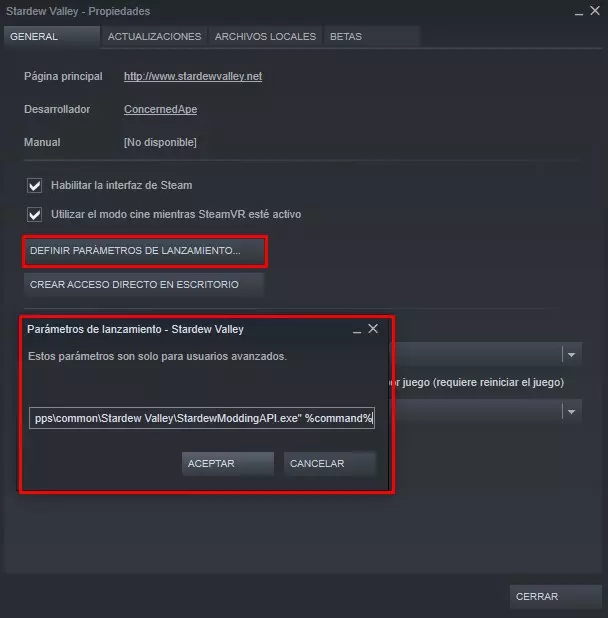 会弹出一个窗口,我们点击按钮,设置启动参数。会打开一个文本框,我们在其中粘贴以下内容: "C: Program Files (x86) Steam steamapps common 星露谷物语 StardewModdingAPI.exe" %command%