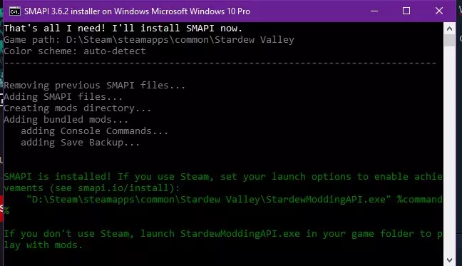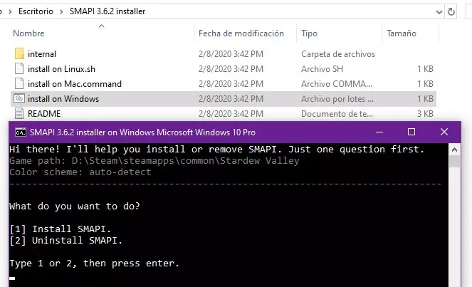 打开生成的文件夹并安装SMAPI。当安装窗口打开时,在文本输入框中输入1,然后按回车键继续。
