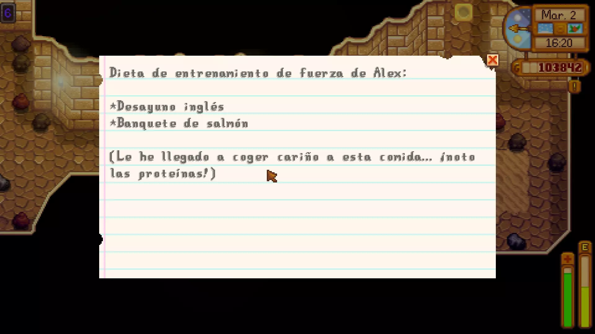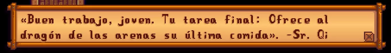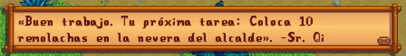 笔记提供信息,有些会列出给NPC的礼物,还有些是带有奖励的谜题。 秘密笔记#1是阿比盖尔日记中的一页。 “我喜欢的东西:雕刻南瓜的香气,枕头下有一块紫水晶,巧克力蛋糕,辣鳗鱼的刺激感,还有妈妈做的蓝莓派(我喜欢吃!)” 秘密笔记#2是山姆的圣诞购物清单。 每个人的最爱 塞巴斯蒂安:冰封的泪滴,生鱼片 潘妮:绿宝石,虞美人 文森特:葡萄,醋栗糖果 妈妈:酥脆鲈鱼,薄煎饼 爸爸:意大利调味饭,烤榛子 我的:仙人掌,枫糖浆糖,披萨 秘密笔记#3是莉亚的笔迹。我理想中的完美晚餐是沙拉、山羊奶酪、松露和葡萄酒。甜点的话,来一份罂粟籽松饼。真美味!如果有人能为我准备这些,我会非常开心。 秘密笔记#4 这是玛鲁的笔记。 我至今最伟大的发明还需要以下材料才能完成! *金锭 *铱锭 *电池 *钻石 *草莓 秘密笔记#5 这是潘妮的信: 我想给每个人他们喜欢的东西! 妈妈:小萝卜、糖渍山药,【绝对不要啤酒】! 贾斯:仙女玫瑰、李子布丁 文森特:粉色蛋糕、葡萄 先生:穆勒:炒韭菜蘑菇 穆勒奶奶:甜菜,郁金香 秘密笔记#6 星果沙龙特别订单 刘易斯镇长:秋日宝藏(高纤维双层面包) 玛妮:南瓜派(多加奶油!) 德米特里厄斯:炖豆子(超辣) 卡罗琳:鱼肉卷饼(加三倍酱料!最好多准备些餐巾纸……) 秘密笔记#7 这是某人日记里的一页…… ……镇上适龄的单身汉没几个……而且没一个是完美的!哈维既紧张又虚弱,但我知道他会是个忠诚专一的丈夫。他喜欢咖啡和黄瓜。 艾利欧特有点做作和戏剧化,但他很有骨气。他喜欢蟹肉蛋糕和石榴。 谢恩一团糟,还很不合群但我觉得他坚硬的外表是一种防御机制,用来向世界隐藏他的温柔。他喜欢啤酒、披萨和辣椒。 秘密笔记#8给海莉和艾米丽 希望你们一切都好!我们给你们寄了你们最喜欢的礼物:给海莉的粉色蛋糕和向日葵,给艾米丽的宝石和羊毛。 ——爱你们的爸爸妈妈 秘密笔记#9亚历克斯的力量训练饮食: 英式早餐 三文鱼盛宴 (我开始喜欢这食物了……我感觉到蛋白质了!) 秘密笔记#10有人在骷髅洞穴的第100层等你……当你达到骷髅洞穴100层时,会播放一段过场动画。在此期间,齐先生会告诉你使用梯子是一种更快下去的方式,但这属于作弊行为。他会认可你通过“光荣的方式”到达100层所付出的努力。无论如何,他都会奖励你一瓶【铱蛇奶】,它能永久增加你25点生命值。 秘密提示#11