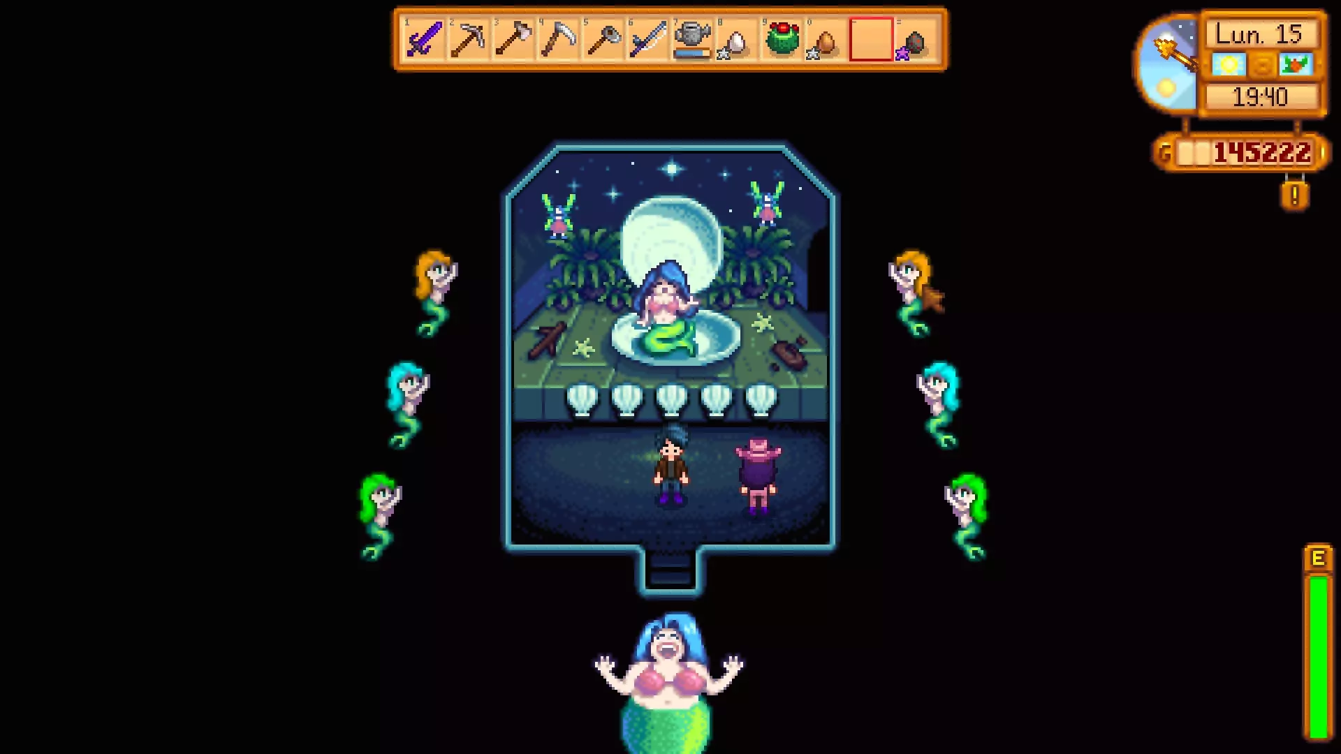 注意:如果你购买了JOJA会员,此物品将不会出现。 秘密提示#15 美人鱼表演:1-5-4-2-3 在冬季夜市期间,进入最右侧的小船即可开始美人鱼表演。