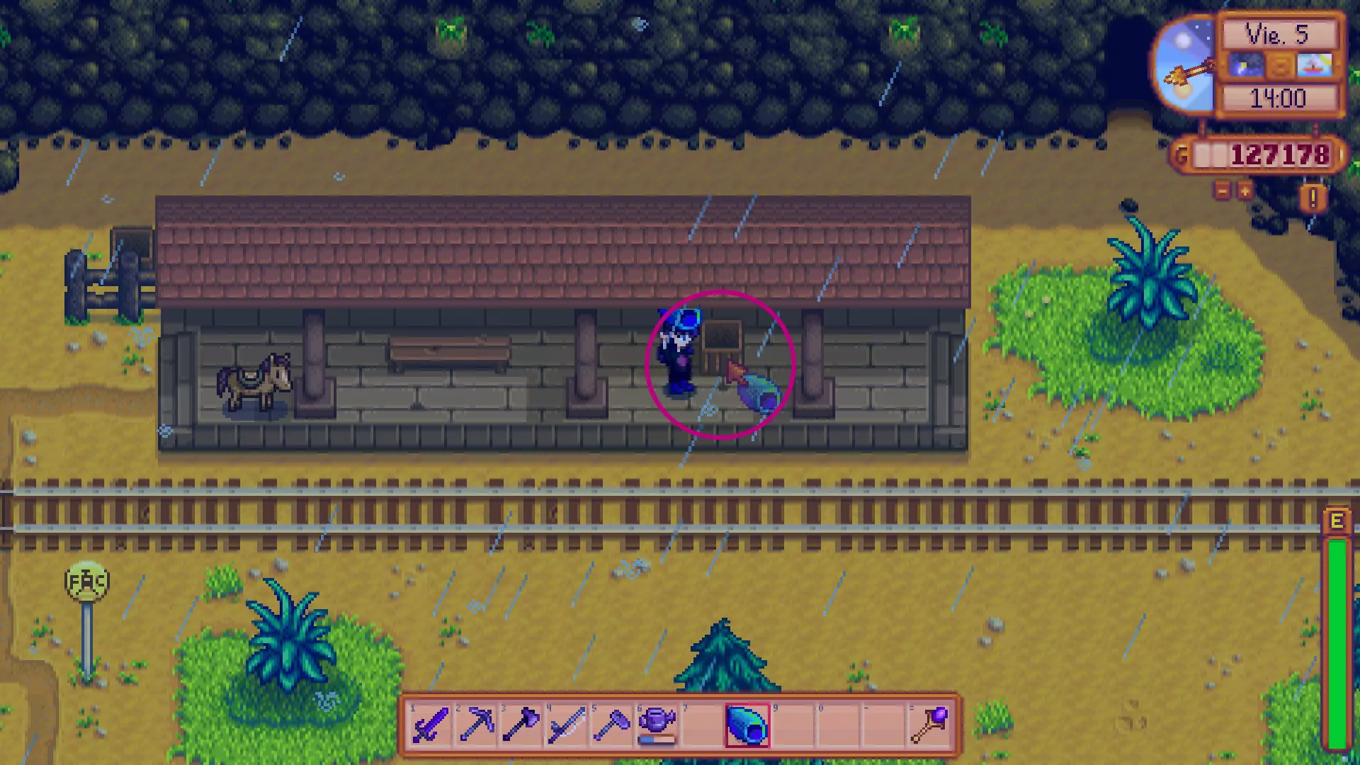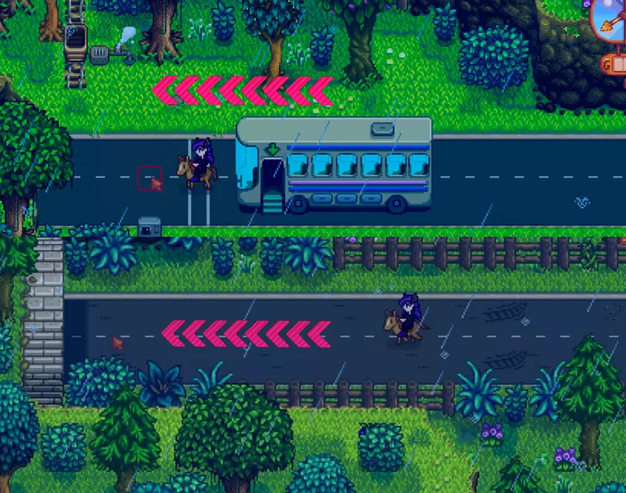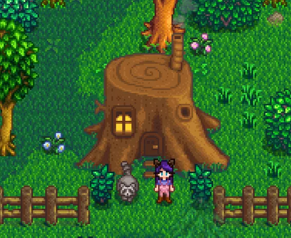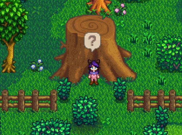 第二天早上,我们需要前往玛妮的牧场左侧,会注意到现在有一个带有问号(?)符号的树桩。与它互动后,会提示我们需要