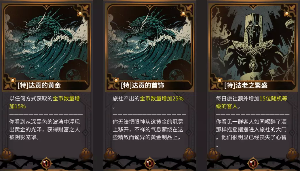 墨鱼煲 试菜食材:奇怪蟹鱼螺信息素10 制作食材:奇怪的肉×5,蟹肉×3,鱼肉×2,螺肉×2,虾肉×2 成本:4000 餐厅售价:4800 利润:800 灵魂碎片:5 探索方向:北 提供体力:50 【特】神谕 【特】神谕共有10个。【特】神谕出现的条件为:将相应的普通神谕升至5星,如果拥有另一个特定的神谕则可能刷出【特】神谕。 【特】神谕的触发条件需要一个一个排除过于麻烦,不更新触发条件。【特】神谕组合: 【特】达贡的黄金:达贡的金沙 【特】达贡的首饰:达贡的眼泪 【特】法老之繁盛:炼金术士之血 【特】法老之高贵:拉莱耶的幻影 【特】豪横之龙:奢耀之龙 【特】多产:门之主的祝福 【特】贪欲之龙:威压之龙 【特】欺瞒之龙:怒吼之龙 【特】蔓生孢子连株:复活节岛的雕像 【特】象神伟力:群山的赠予
