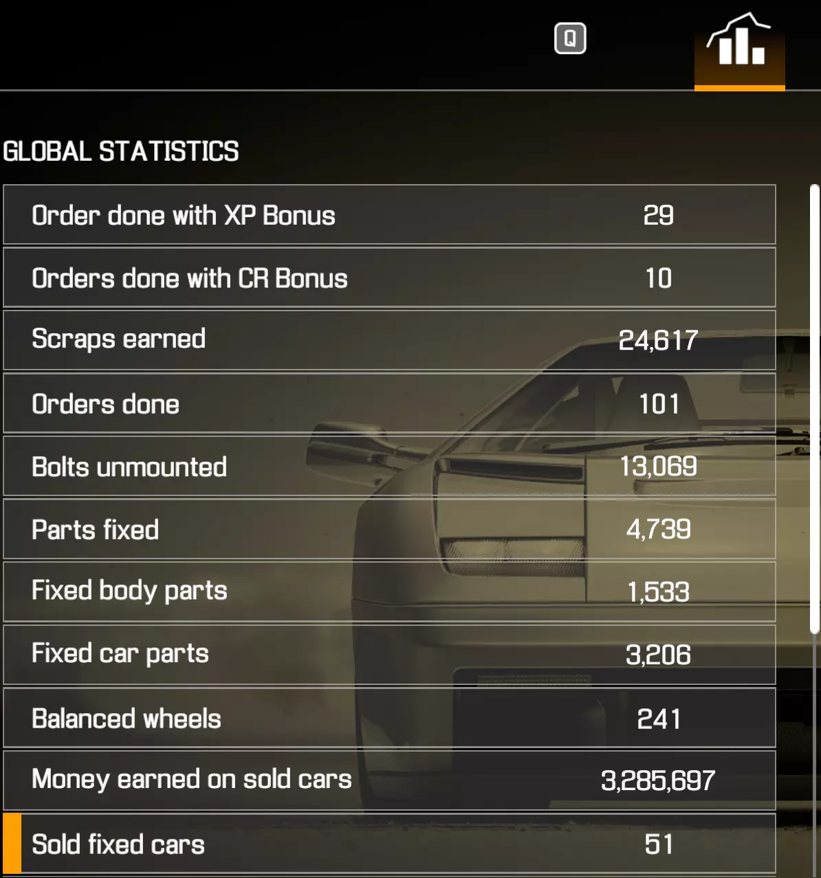 翻新并出售50辆汽车 睡觉-吃饭-翻新-重复 【Trader】成就需要连续数天不断重复同样的操作,是个令人痛苦的刷取过程。 你必须拆除汽车的每一个部件,并用100%状态的部件重新组装汽车。 你可以从主菜单->附加内容->全局统计->已售出的修复车辆中查看当前进度(注意:据其他玩家反映,你需要在一个存档中修复50辆汽车)