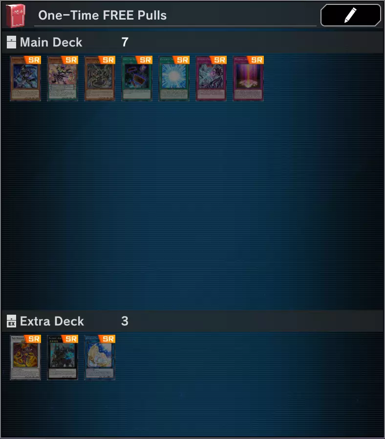 拥有足够的SR卡牌和材料了吗?需要UR卡牌来分解吗?通过这个方法,你将获得21个一次性免费卡包,有机会获得可分解的UR卡牌! 获取免费抽卡机会,请按照以下步骤操作: 创建一个卡组,标题可以类似“免费UR”或其他类似名称。