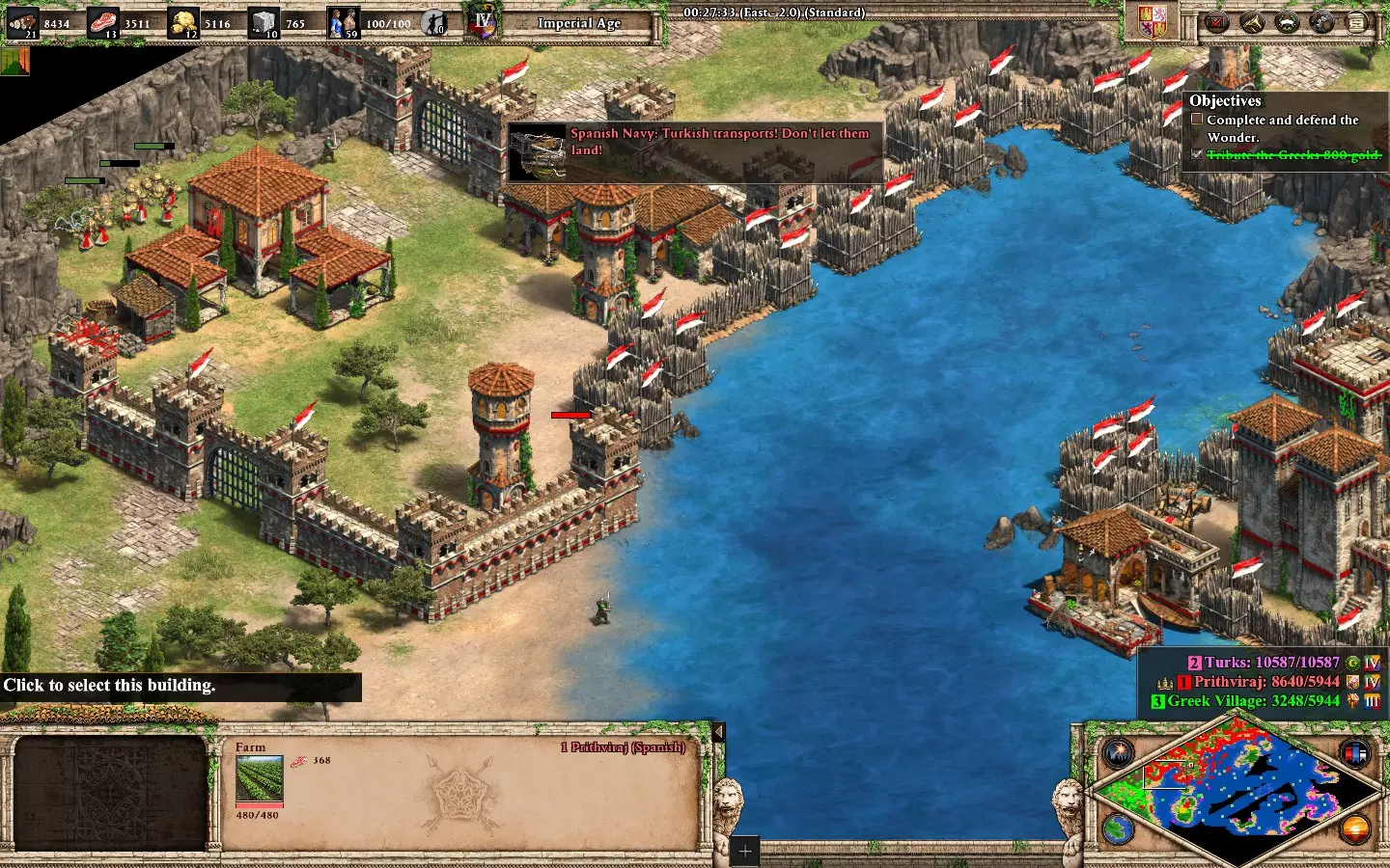 危机管理 完成“帝国之果”关卡,且不要求中等或高额贡金。 地图在你完成奇观目标后开始,所以慢慢来收集资源,准备舰队和防御。两侧塔楼上部署散兵足以防御,直到你从贡金中获得足够黄金。你会缺乏黄金,所以准备好用廉价单位进行防御。 记得在奇观的计时器结束前选择“低贡金”。你会收到少量黄金,这能降低盟友叛乱的几率(即使几率低,他们也可能变成敌人)。 准备一支强大的海军开始推进敌人的基地。在盟友因可能叛乱而变成敌人之前迅速行动,这会减少贡金数量。获胜该地图后你将获得成就:Within the Long Walls