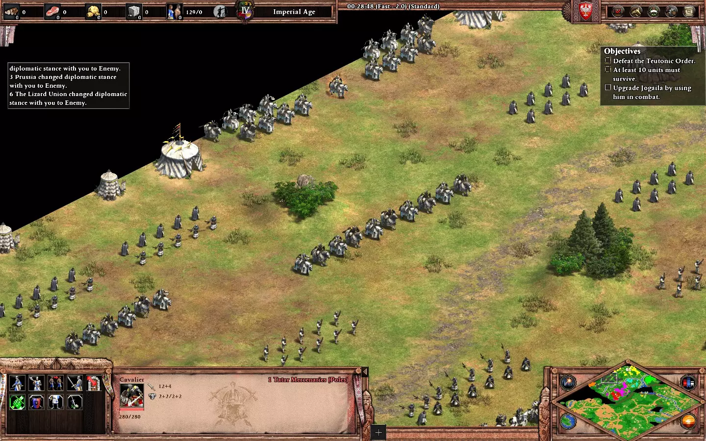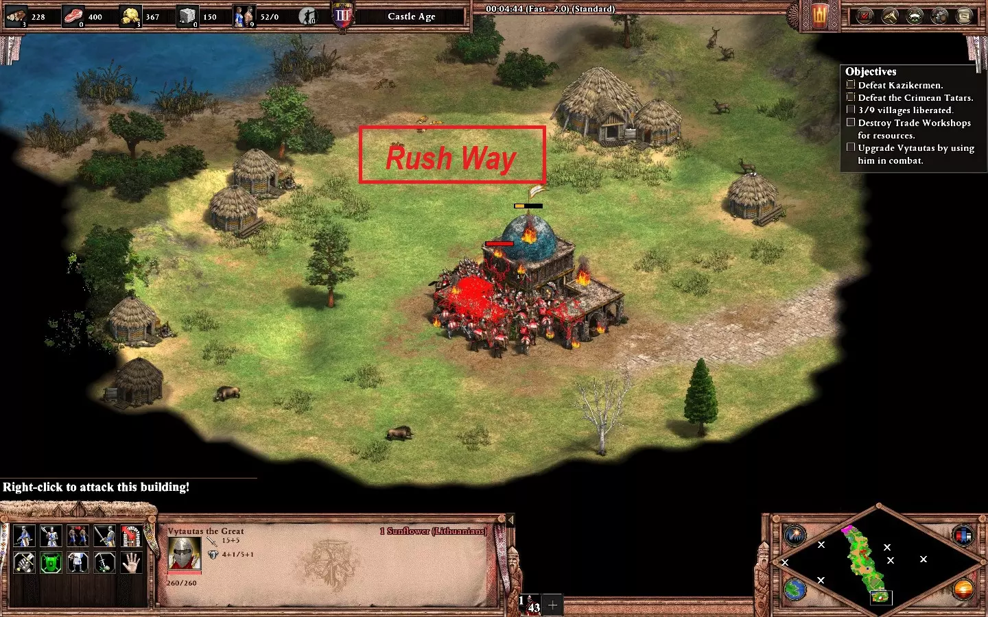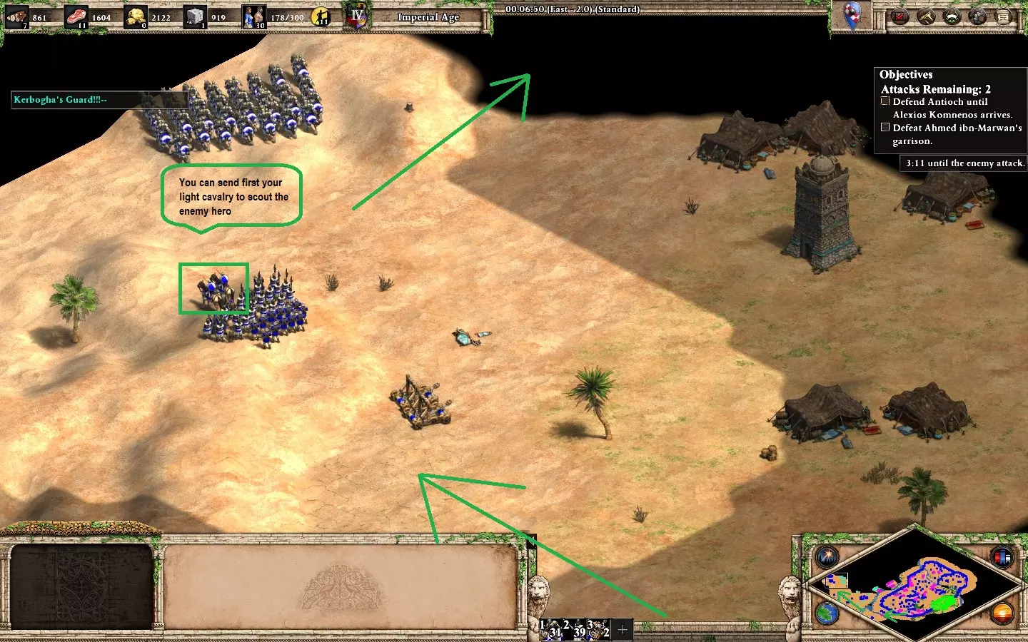 更多危险,更多荣耀 在【让王子决定】任务中始终支持克莱托斯。 地图分为三个区域,你必须保护营地直到前进道路畅通。每条路线都有敌人等待;游戏会提示你想要选择的路线。【克莱托斯】路线难度最高。 到达营地后要迅速行动。优先尽快建造所有用于增加人口和训练的建筑,仔细分配村民和推车以获取资源。 强烈建议每次到达营地位置时保存游戏,以防被敌人袭击。暂停或减慢游戏速度来检查村民,因为你需要指挥他们采集资源。敌人会分波次从不同区域同时攻击你的基地,需要三支小型军队进行防御。弓箭手是这张地图中最强的单位,因为大多数敌方单位都是步兵。 每个区域的资源都很稀缺,要平衡单位的生产。将你的军事建筑调整为【低资源消耗-慢速生产】模式。 出售补给车(你有4辆)以获得额外村民是可选操作,但建议在第二和第三区域进行,这对经济发展有帮助,而且这些村民会转化为步兵来通过下一条路径。在最后一个区域,你需要在营地坚守,直到拥有足够强大的军队,然后推进并摧毁敌人的城镇中心以赢得这张地图。如果你选择了所有克莱图斯路线,就能解锁成就。