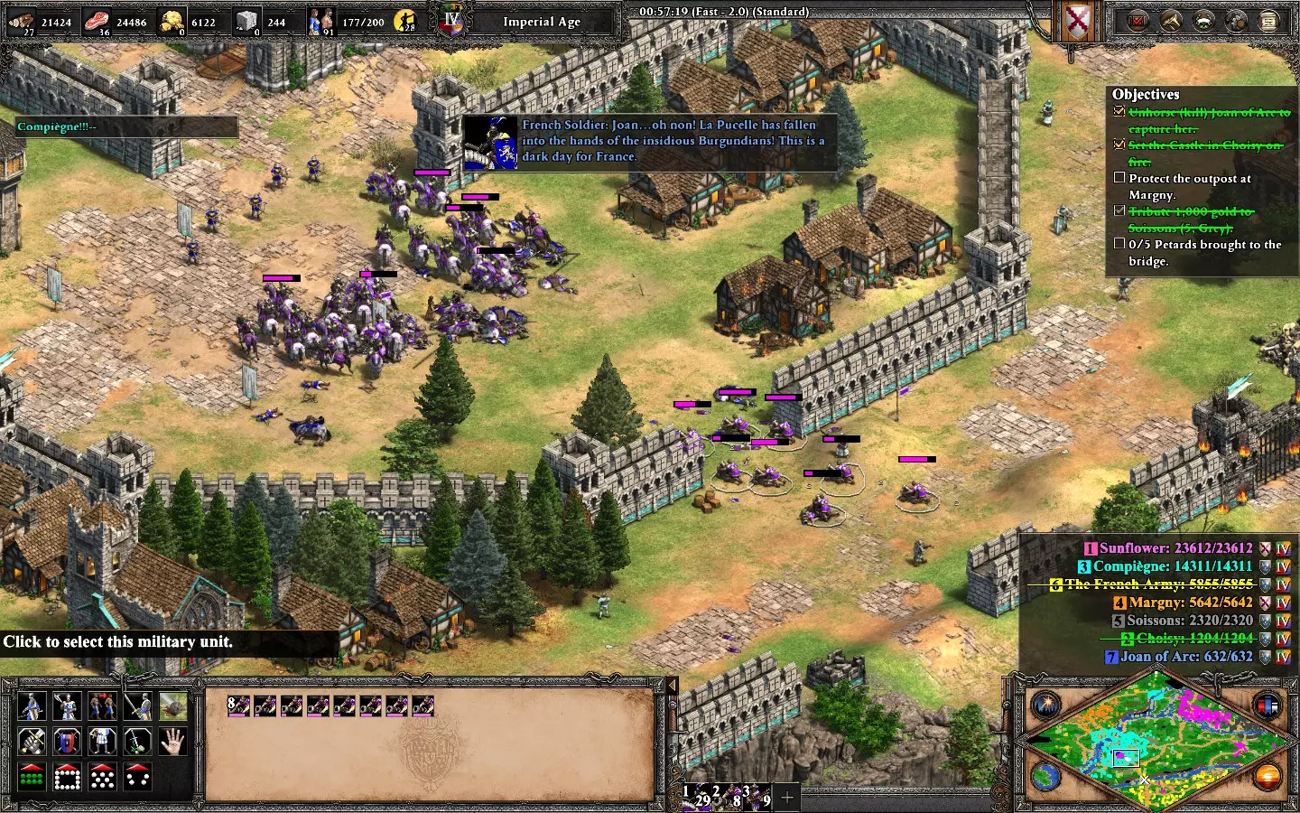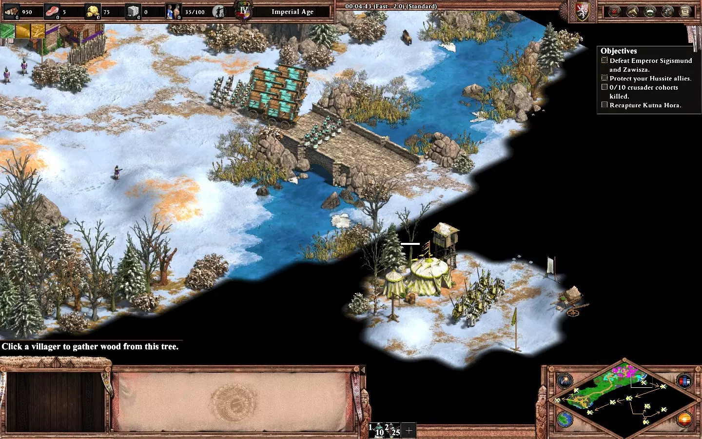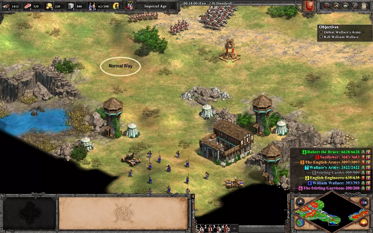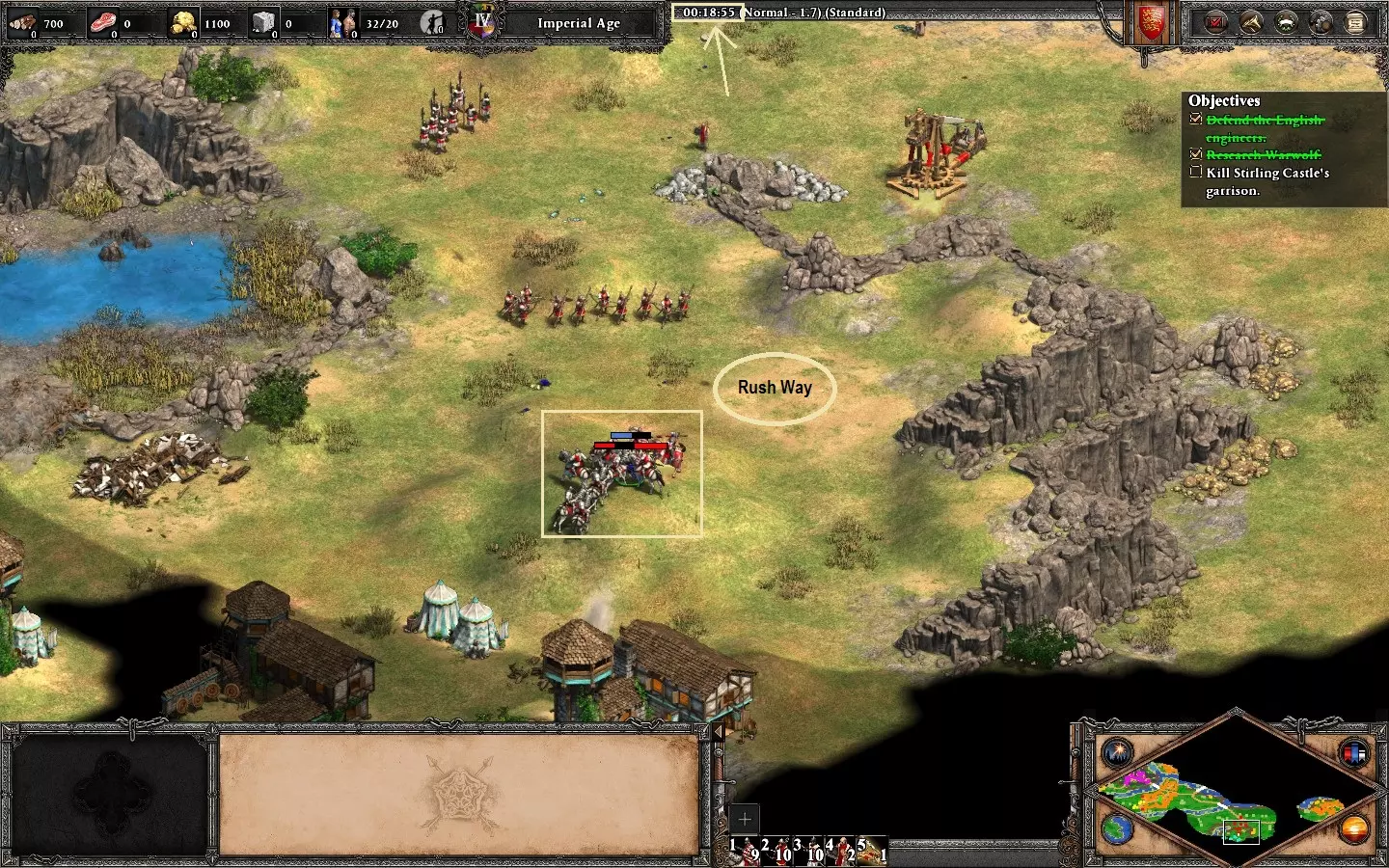 更多危险,更多荣耀 在【让王子决定】任务中始终支持克莱托斯。 地图分为三个区域,你必须保护营地直到前进道路畅通。每条路线都有敌人等待;游戏会提示你想要选择的路线。【克莱托斯】路线难度最高。 到达营地后要迅速行动。优先尽快建造所有用于增加人口和训练的建筑,仔细分配村民和推车以获取资源。 强烈建议每次到达营地位置时保存游戏,以防被敌人袭击。暂停或减慢游戏速度来检查村民,因为你需要指挥他们采集资源。敌人会分波次从不同区域同时攻击你的基地,需要三支小型军队进行防御。弓箭手是这张地图中最强的单位,因为大多数敌方单位都是步兵。 每个区域的资源都很稀缺,要平衡单位的生产。将你的军事建筑调整为【低资源消耗-慢速生产】模式。 出售补给车(你有4辆)以获得额外村民是可选操作,但建议在第二和第三区域进行,这对经济发展有帮助,而且这些村民会转化为步兵来通过下一条路径。在最后一个区域,你需要在营地坚守,直到拥有足够强大的军队,然后推进并摧毁敌人的城镇中心以赢得这张地图。如果你选择了所有克莱图斯路线,就能解锁成就。