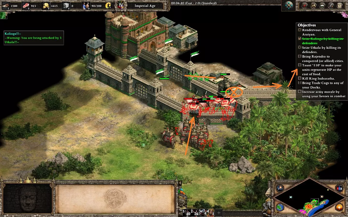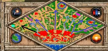 当计时器达到12分钟或你占领了两个塔楼位置后,敌人会开始分批尝试逃跑。在紫色计时器结束且友军开始攻城前,最多允许95/99(共200)名敌人逃脱。 卡泰亚人会选择不同路线逃跑,你需要准备好军队,并建造带有治疗升级的塔楼/前哨站来保护这些路径。 在地图初期阶段,优先防守主要路线,直到你拥有足够的单位去占领最后一个地点以获取建筑/村民。你获得的大部分资源来自击杀敌方单位,偶尔也可通过消灭试图前往红色基地的灰色巡逻队(紫色箭头所示)获取资源。 建议使用塔楼来侦察敌人队伍,若有军队保护,还可引诱敌人。西侧路线由蓝绿色势力防守(图片中黑色箭头所示)。游戏进行到某个阶段时,播报员会提示他们将使用主路径之外的其他路线。此时你需要分兵并建造大量防御塔以确保安全。训练、修复单位并消灭敌人的波次,直到紫色敌人出现(游戏内约45分钟),即可解锁成就。