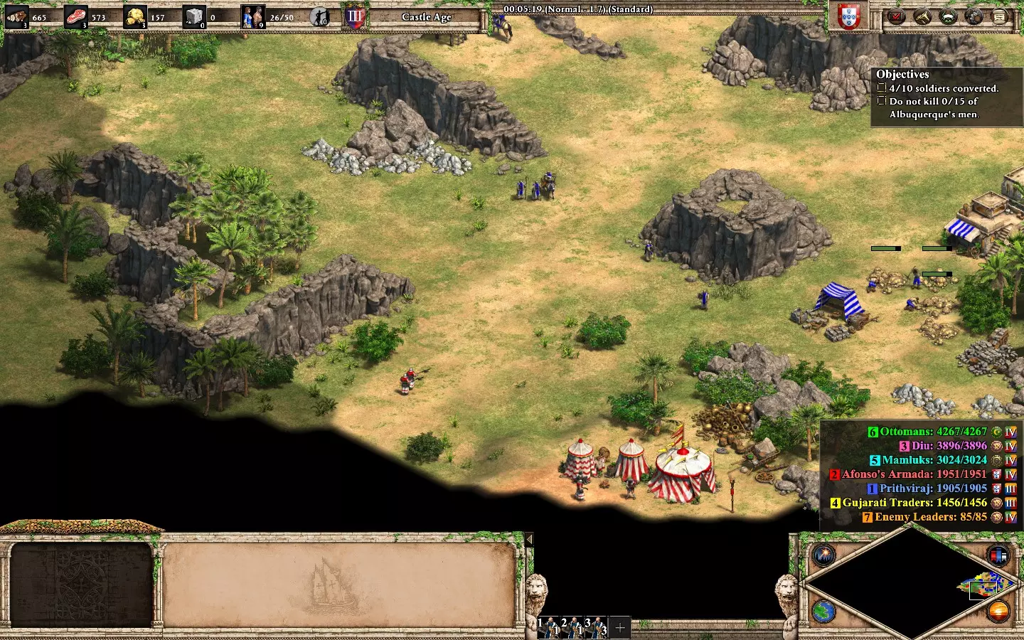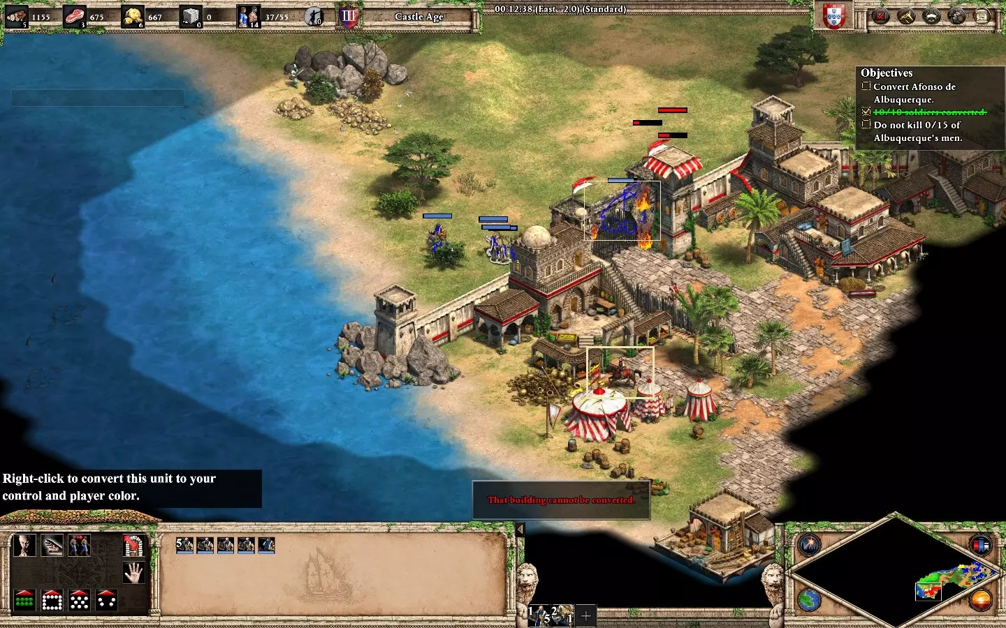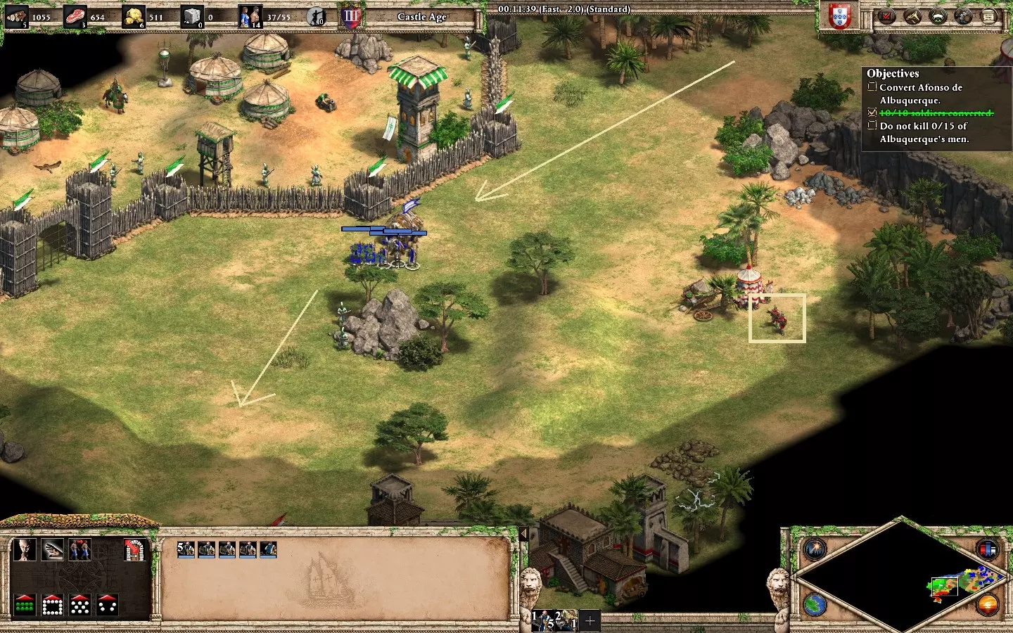 朋友们,同胞们,请听我说。在弗朗西斯科·德·阿尔梅达的第五个任务“血脉传承”中,不击杀任何葡萄牙单位的情况下感化阿方索·德·阿尔布克尔克。第一部分:感化10个敌人。这不需要采取激进的玩法,你只需探索基地附近的环境。需要记住的要点:当你的僧侣待命时要小心,因为敌方单位在视野范围内时显然会倾向于攻击你。慢慢来,不要进行冒险操作。不需要建造城墙、前哨站或城镇中心。你的基地附近共有10个敌人,分为5组,每组2个: 西北方向有2名戟兵(不会移动) 基地南部有1名戟兵和1名火绳枪兵(同样不会移动) 南部基地附近有2名戟兵在巡逻(靠近上述两名敌人) 1名戟兵和1名弩手在敌人静止区域之间巡逻 西北方向静止戟兵附近有2名征服者在巡逻(大约在第6分钟出现) 开始时,当阿方索对话时,尝试迅速将僧侣移至西北方向并侦查敌人。不要立即转化。等待(戟兵和弩手)巡逻组出现并离开该区域后,再快速转化戟兵。之后,返回直到恢复信仰,然后转化在该区域巡逻的敌人(使用你的传教士治疗正在受到伤害的僧侣)。