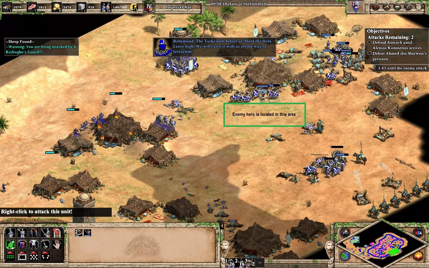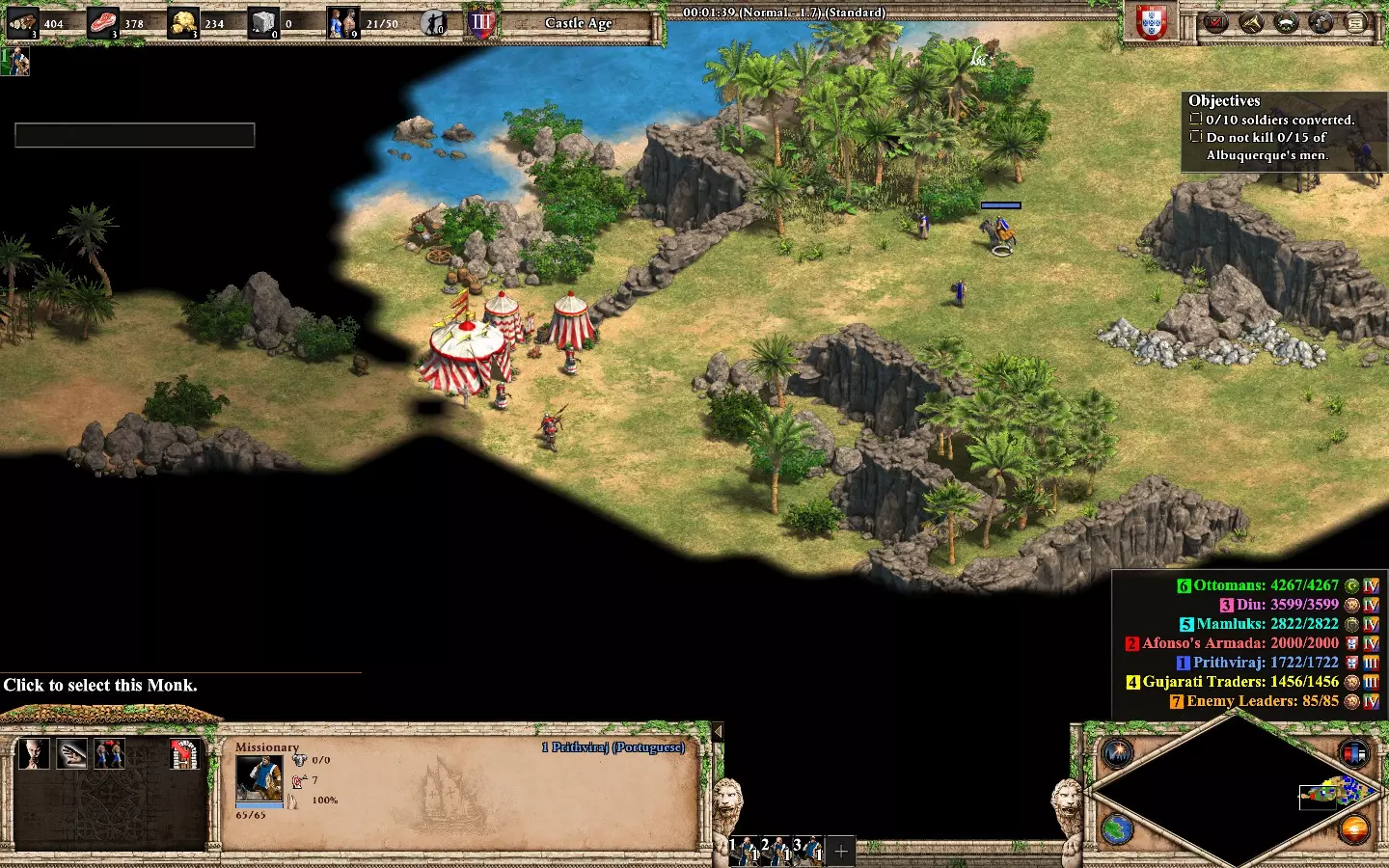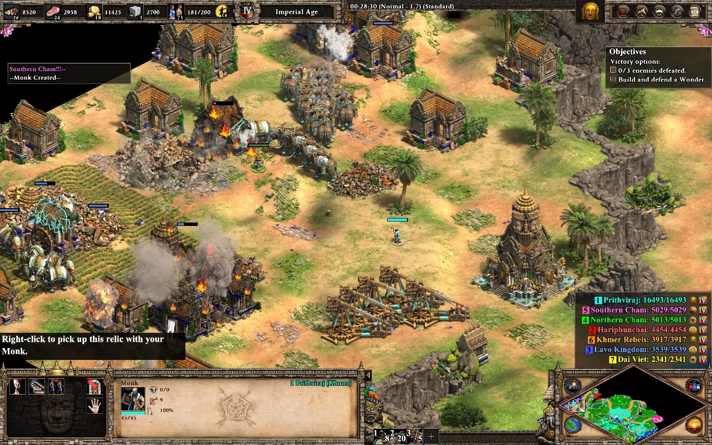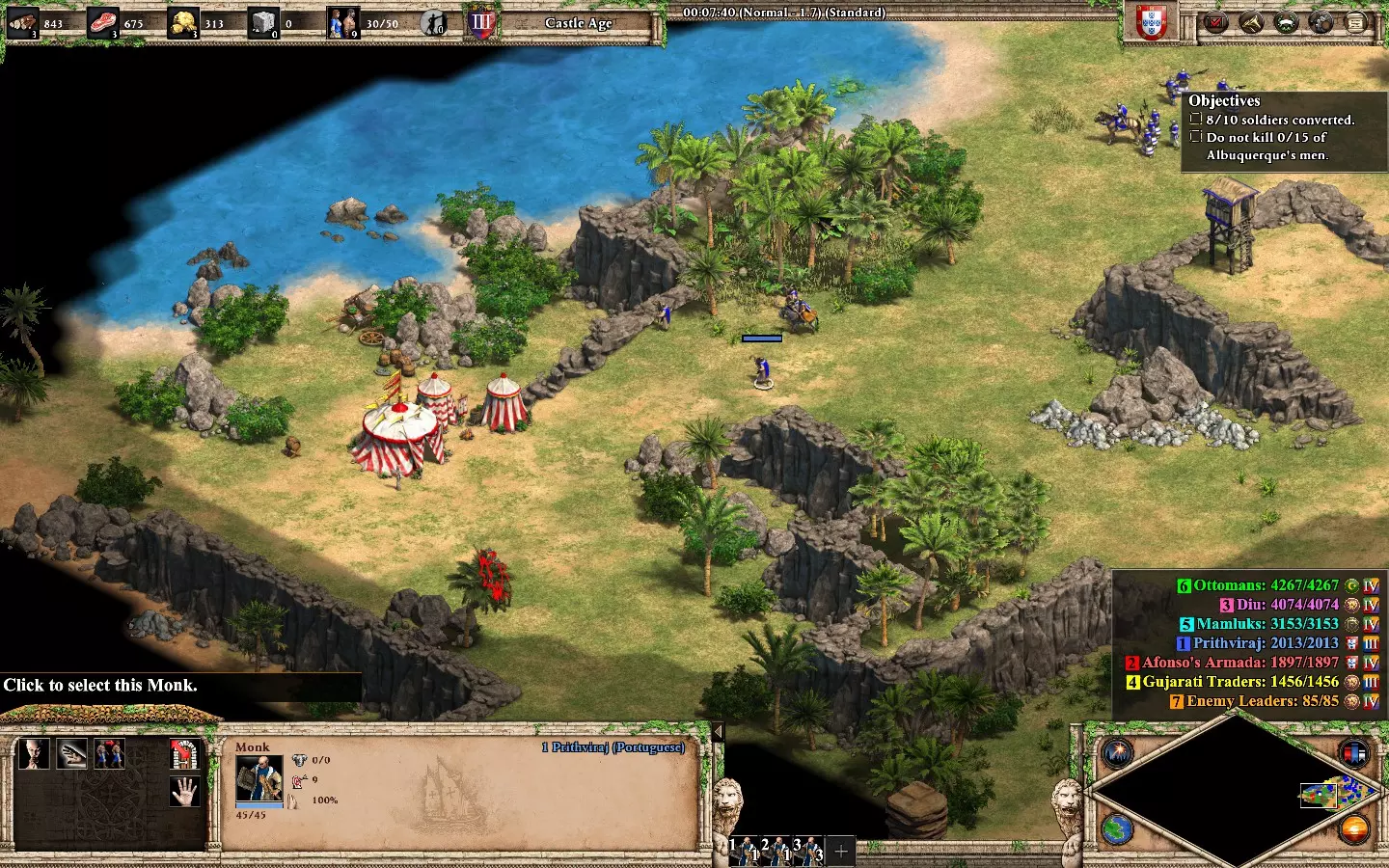 最后,剩下的2个敌人在你的基地西北方向。它们会在大约6分钟后出现。 我建议再训练2名僧侣进行治疗(征服者的伤害很高)。转化他们,你就能完成任务了。