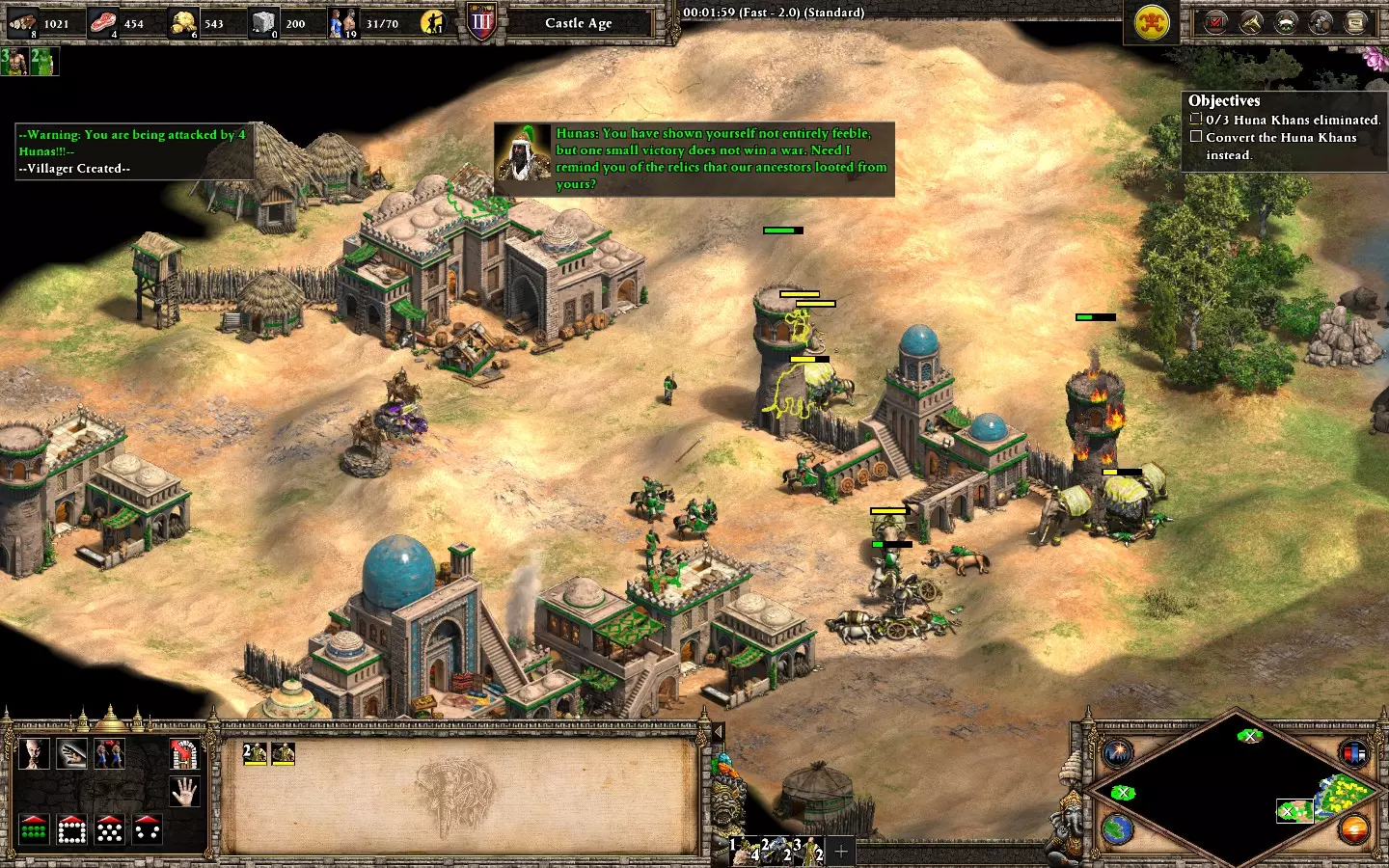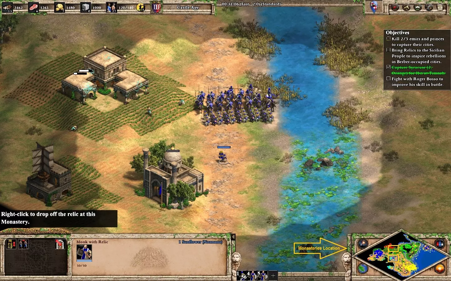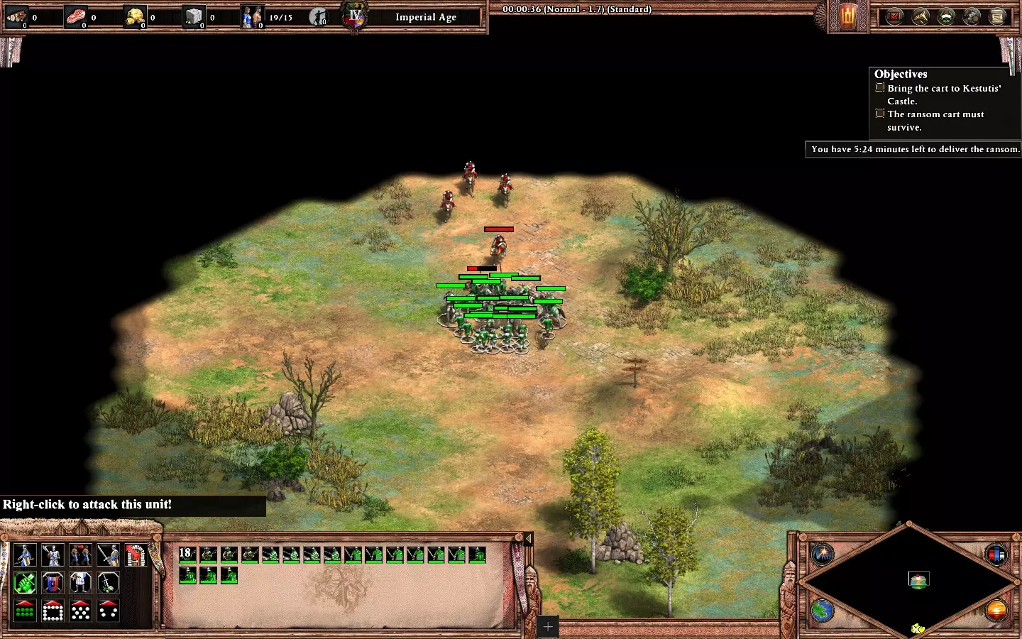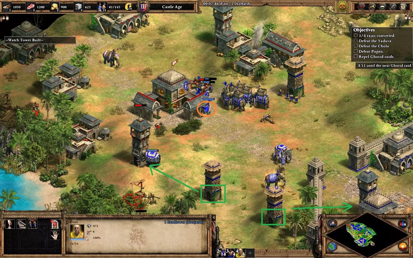 最后,剩下的2个敌人在你的基地西北方向。它们会在大约6分钟后出现。 我建议再训练2名僧侣进行治疗(征服者的伤害很高)。转化他们,你就能完成任务了。