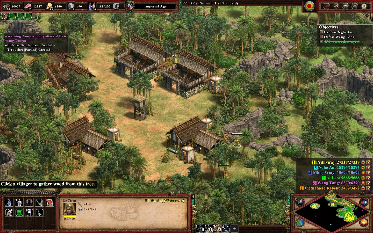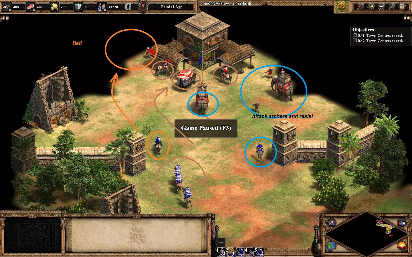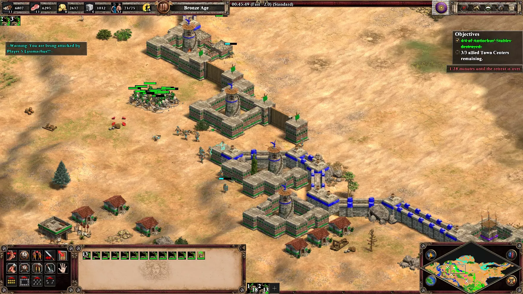 【非希腊悲剧】在第五个黎利任务“三路奇袭”中,不损失任何一名英雄获胜。你将初始拥有4名英雄、2个基地(西北和东南)以及北部一个与2个蓝色基地相连的小型营地。西北基地有2名英雄,小型营地有1名,东南基地有1名。 开始时专注发展经济,生产村民,目前优先收集石头和食物。尝试在每个基地建造城堡以确保英雄安全。如果认为有必要,可以额外建造一座城堡,同时在东南基地建造一些城墙。 提示: - 初期隐藏英雄(尤其是营地后方的黎添)。 - 优先发展东南基地。这里有你需要的所有资源,并且你会不断受到紫色和青色势力的攻击。 西北基地应仅用于建造农场和金矿(如有必要)。一座城堡和一小支军队足以防守该基地。 在每个基地组建小型军队以抵御持续不断的攻击: - 小型营地和西北基地 -> 弓箭手/战象 - 东南基地 -> 骑士/弓箭手(有时,紫色势力会用 trebuchet 攻城锤攻击,青色势力会用 bombar 加农炮攻击)