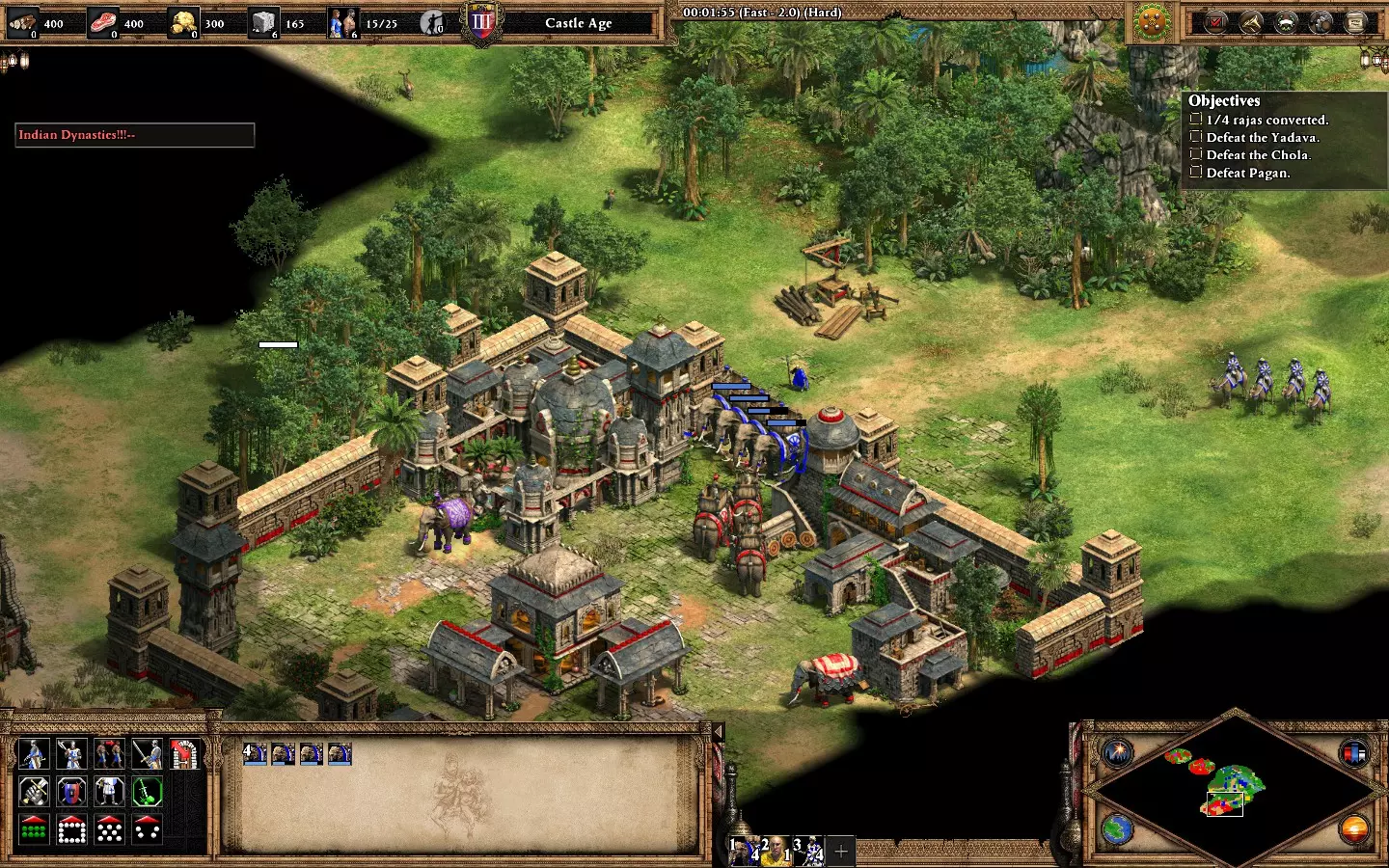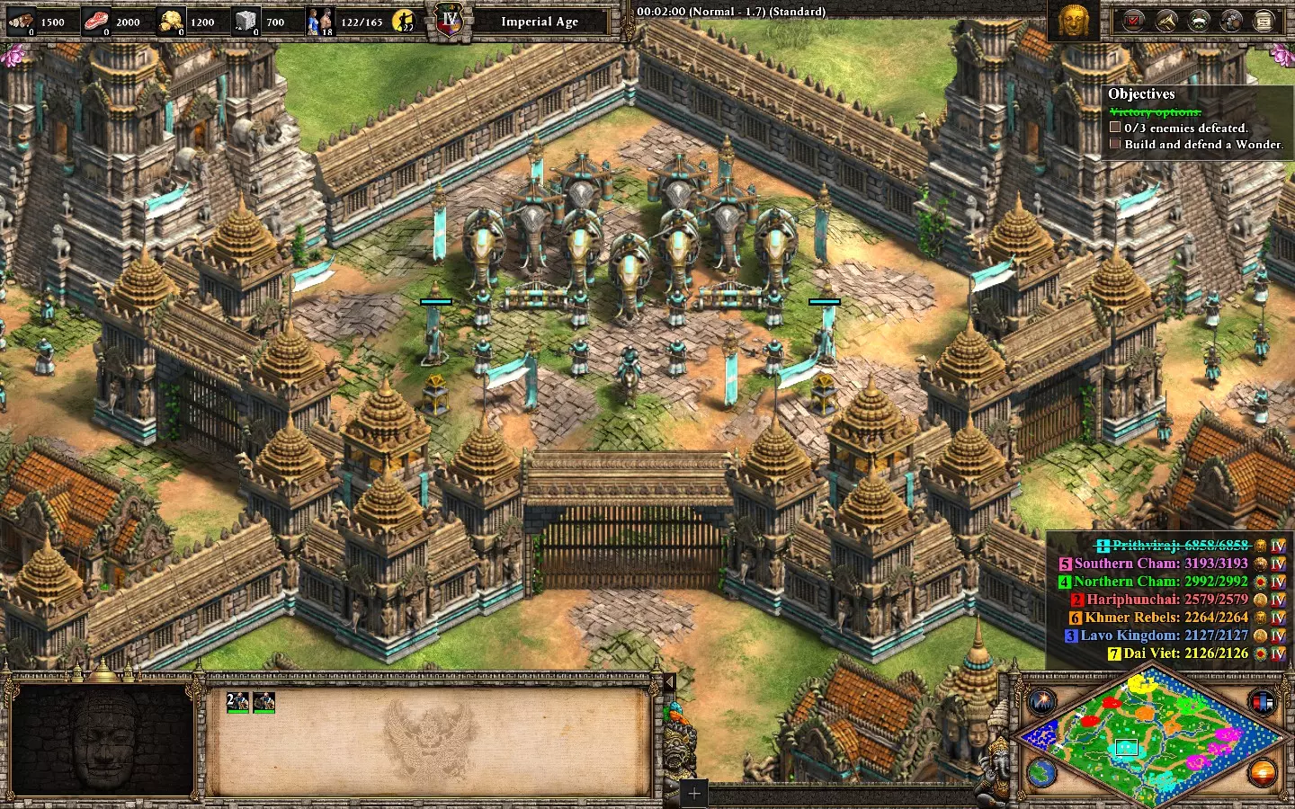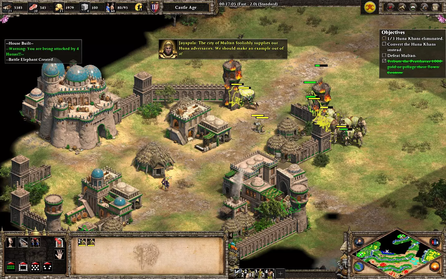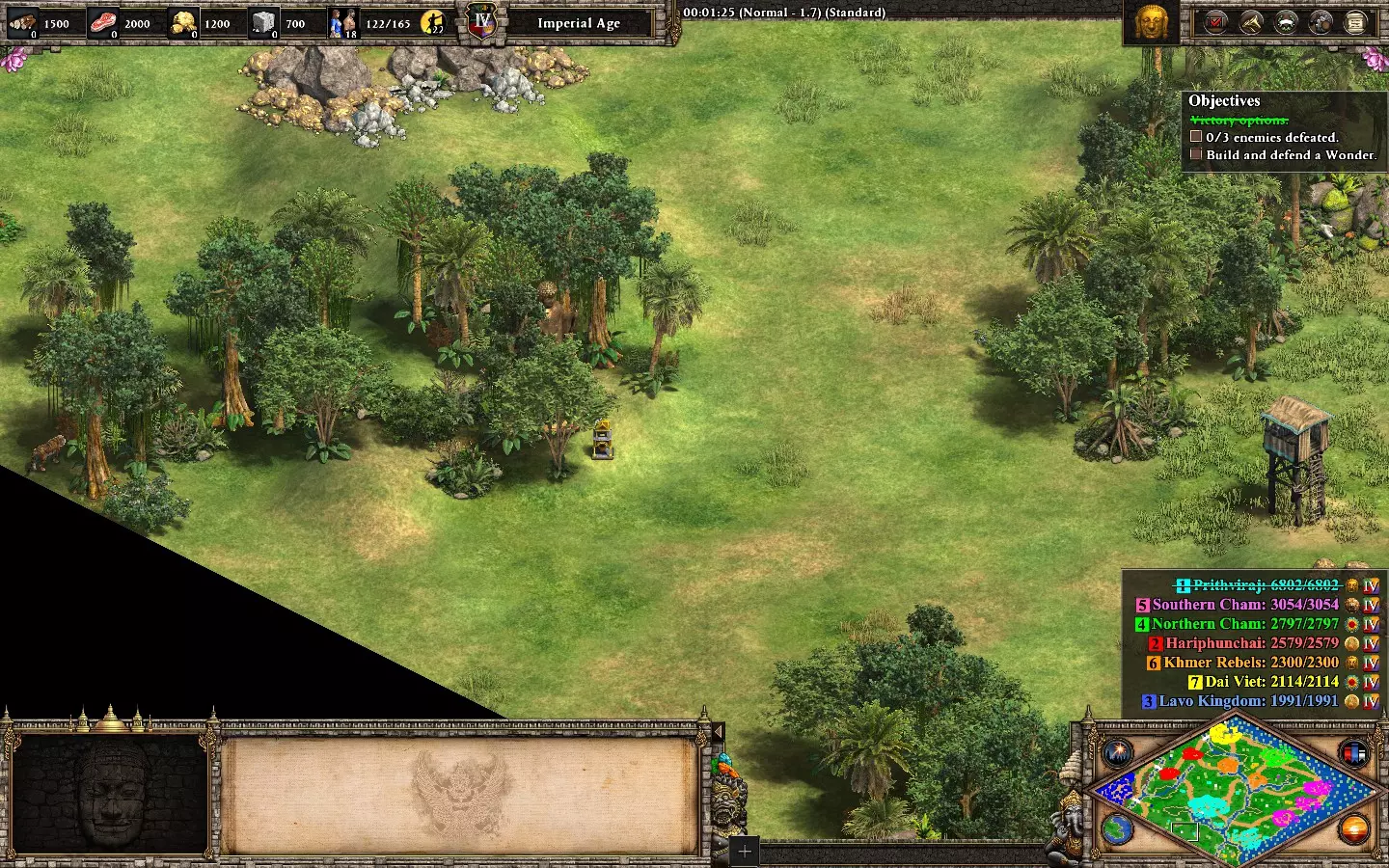 【非希腊悲剧】在第五个黎利任务“三路奇袭”中,不损失任何一名英雄获胜。你将初始拥有4名英雄、2个基地(西北和东南)以及北部一个与2个蓝色基地相连的小型营地。西北基地有2名英雄,小型营地有1名,东南基地有1名。 开始时专注发展经济,生产村民,目前优先收集石头和食物。尝试在每个基地建造城堡以确保英雄安全。如果认为有必要,可以额外建造一座城堡,同时在东南基地建造一些城墙。 提示: - 初期隐藏英雄(尤其是营地后方的黎添)。 - 优先发展东南基地。这里有你需要的所有资源,并且你会不断受到紫色和青色势力的攻击。 西北基地应仅用于建造农场和金矿(如有必要)。一座城堡和一小支军队足以防守该基地。 在每个基地组建小型军队以抵御持续不断的攻击: - 小型营地和西北基地 -> 弓箭手/战象 - 东南基地 -> 骑士/弓箭手(有时,紫色势力会用 trebuchet 攻城锤攻击,青色势力会用 bombar 加农炮攻击)