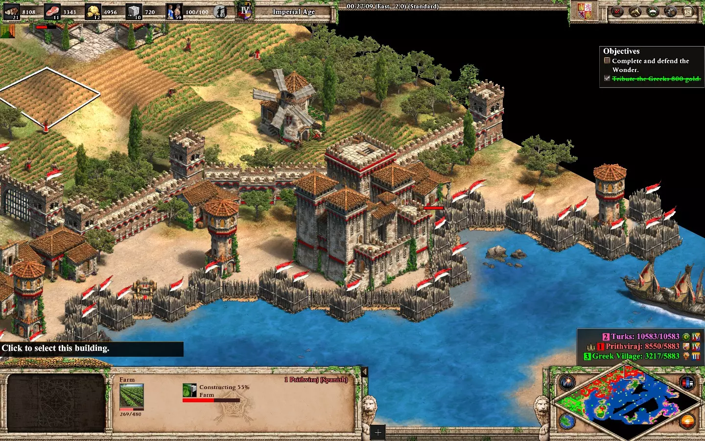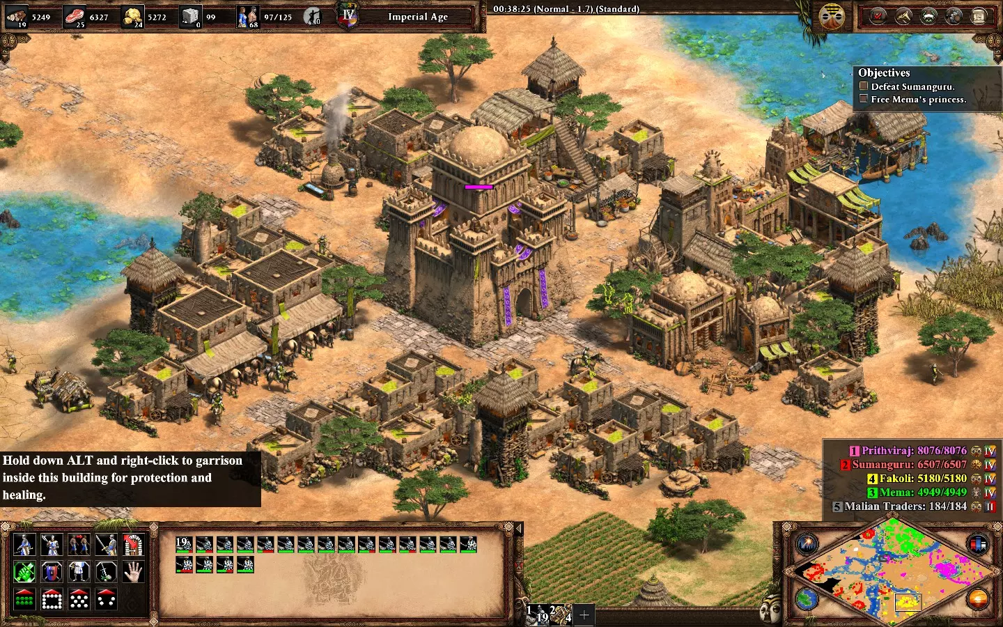 注意:必须解救公主才能获得该成就。完成任务后,你将能够创建gbetos(她会赠予你15个gbetos)。 大约在26-28分钟左右,Fakoli(黄色)会要求1000金币的贡品,之后需要保护他城镇中的一座城堡。完成这些后,他会成为你的盟友。 我建议先完成这个步骤,再去解救公主。