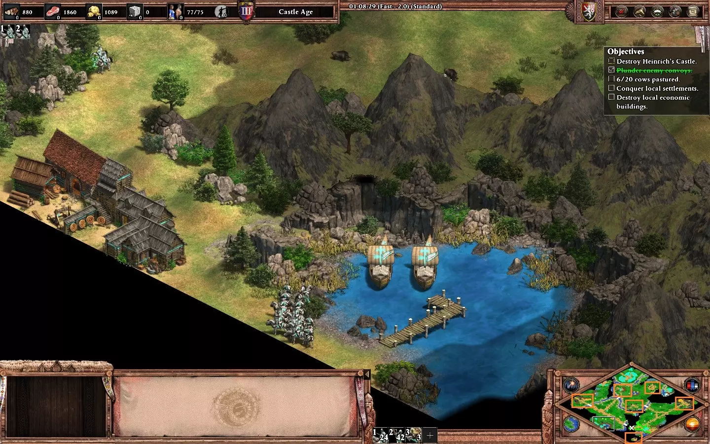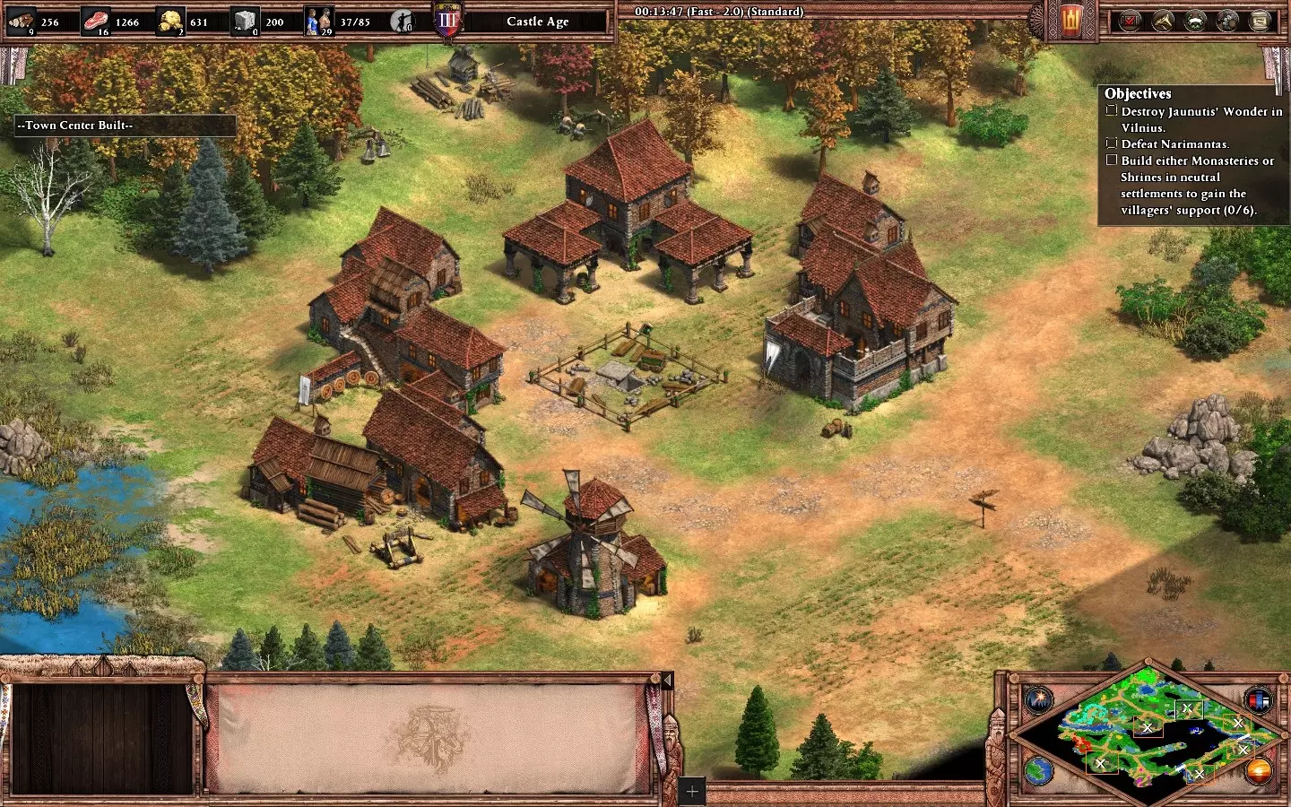 【成就:Roar like a Lion】:在困难难度下完成第五个松迪亚塔任务“狮穴”。 【姐妹的帮助】: 你从东部的基地开始,拥有大量资源。将村民分开建造2个城镇中心(1个靠近石矿,另1个靠近金矿)。 持续生产村民并专注于发展经济。用轻骑兵探索地图,你会在基地附近找到更多金矿和石矿。 建造一座城堡和少量骑士来防御基地。如果你担心后期木材不足,派遣你的民兵和1名村民在河边的小基地建造2座塔楼(必要时可稍后再建一座城堡)。当你进入帝王时代后,开始攻击他的塔楼(共5座),然后等待接收后续任务(22-28分钟)。