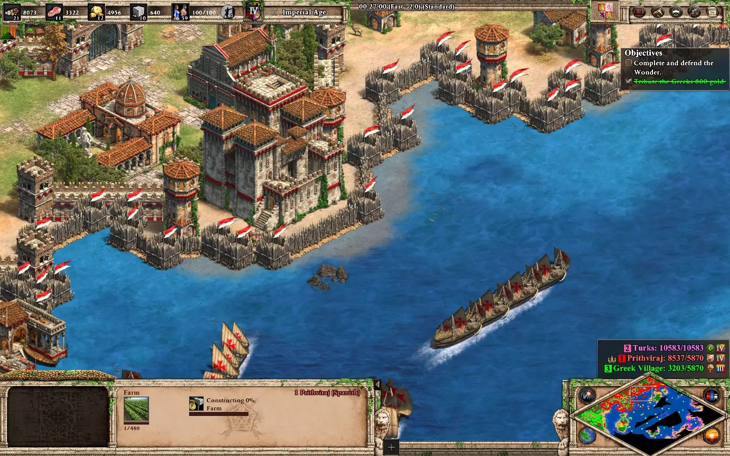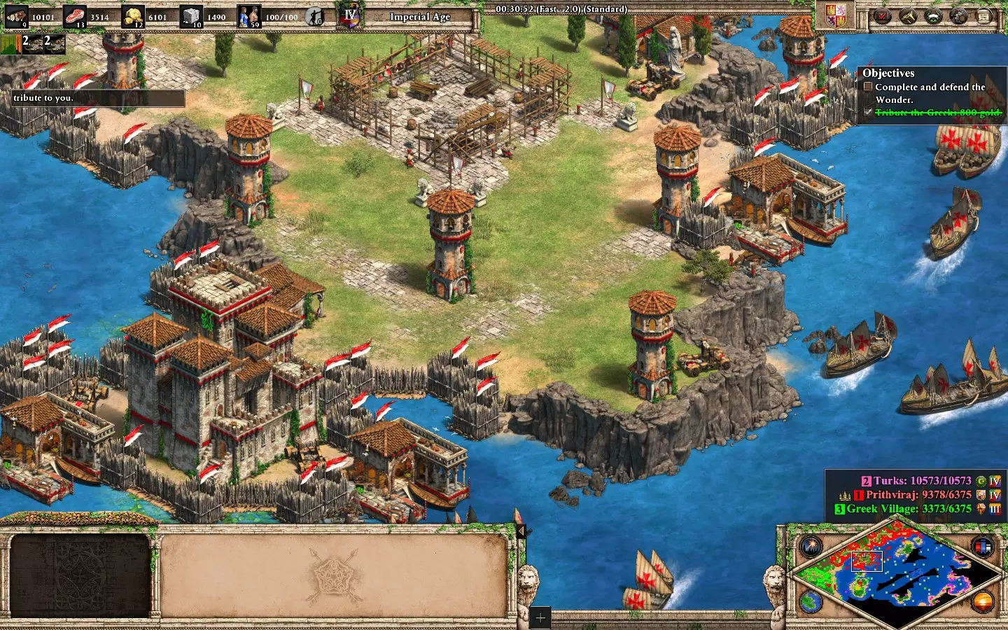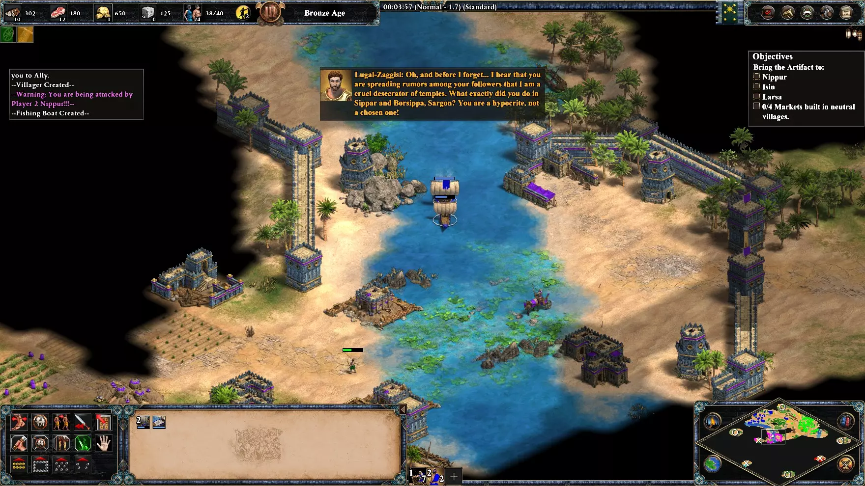 兵马未动粮草先行:在【奇里乞亚之门】中于25分钟内收集所需资源。 兵马未动粮草先行:如果你习惯速经济发展,这个成就会变得简单。 地图开始后立即大量生产村民和渔船,让村民采集木材,渔船分配采集食物和黄金,直到你拥有更好的经济后再改变玩法。你可能需要90到110个村民/渔船才能在25分钟内达成目标(我20分钟就完成了)。 准备一支舰队和混合军队来保护你的基地免受敌人攻击,尤其是要防范专注于你食物/黄金点资源的海盗。当橙色势力出现时,准备更多单位,因为他们会持续发动大规模单位进攻。没什么好说的,因为这是该地图的首要目标:获取资源并保护你的基地,直到解锁成就。战役 | 编年史:亚历山大大帝