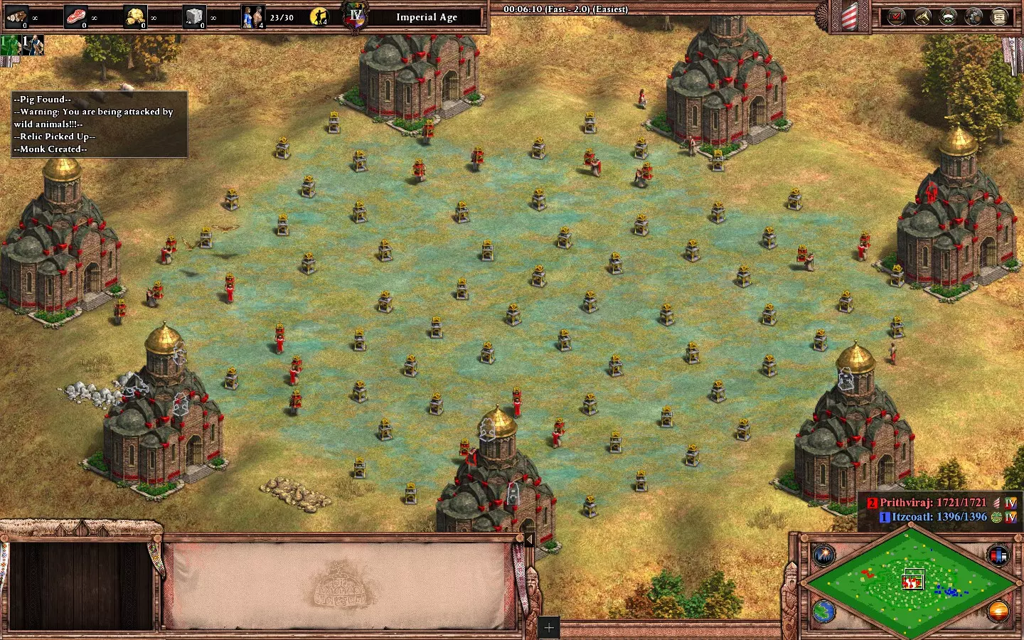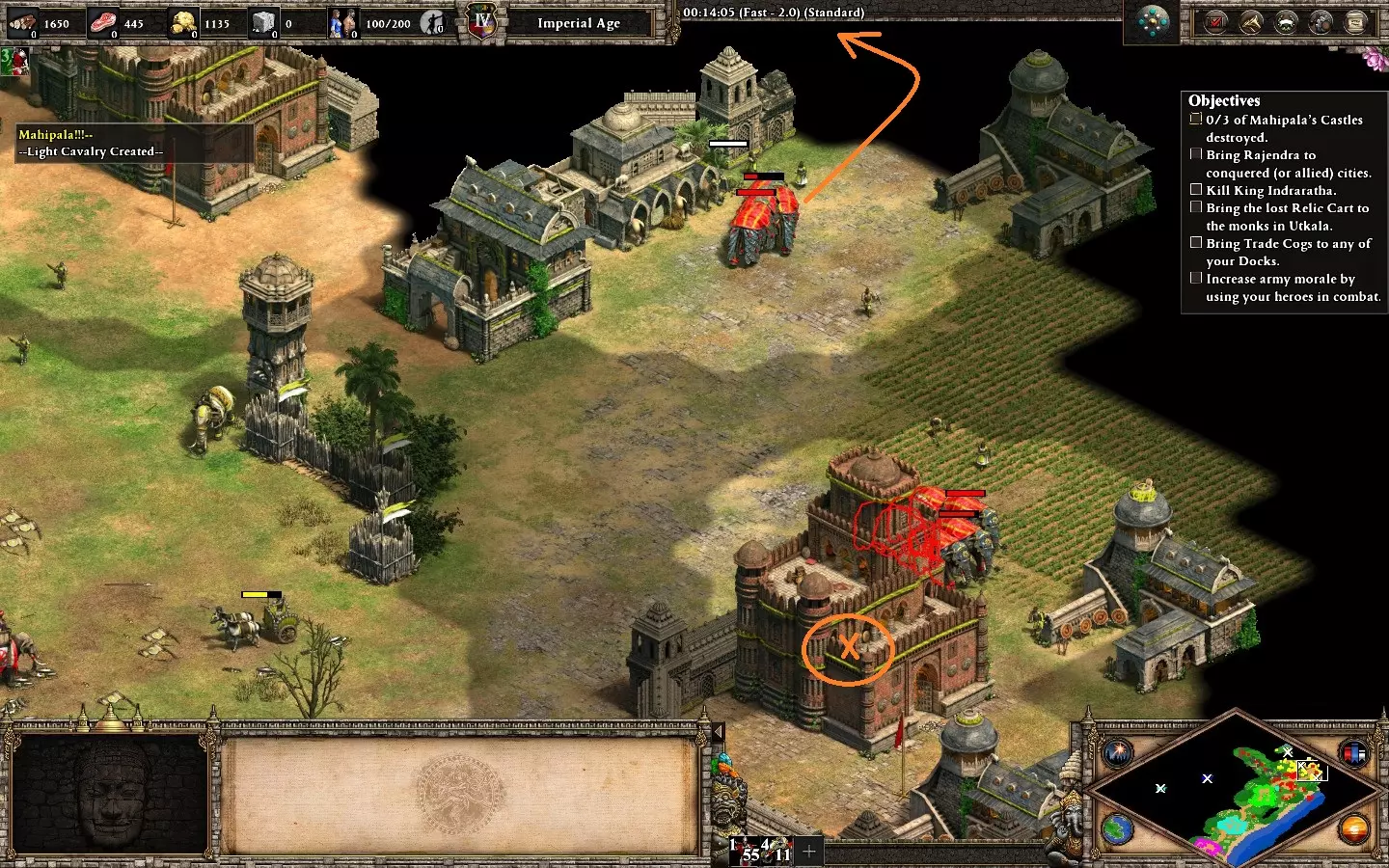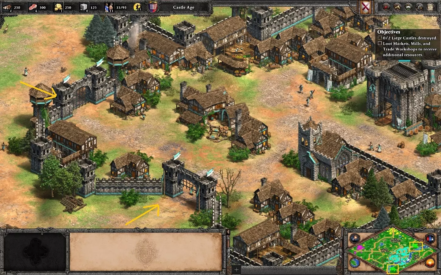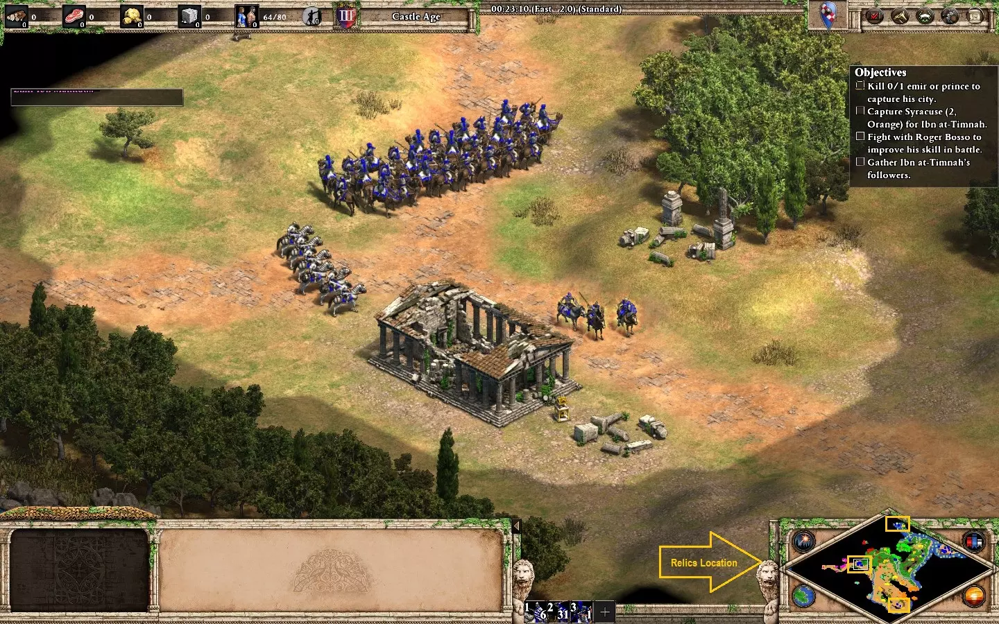 (5-6)其中两个在你的基地附近,该基地有两座城堡。我建议用轻骑兵防守圣物,直到你的僧侣能够去收取(开局时,蓝色方会派遣僧侣来收集圣物)。
