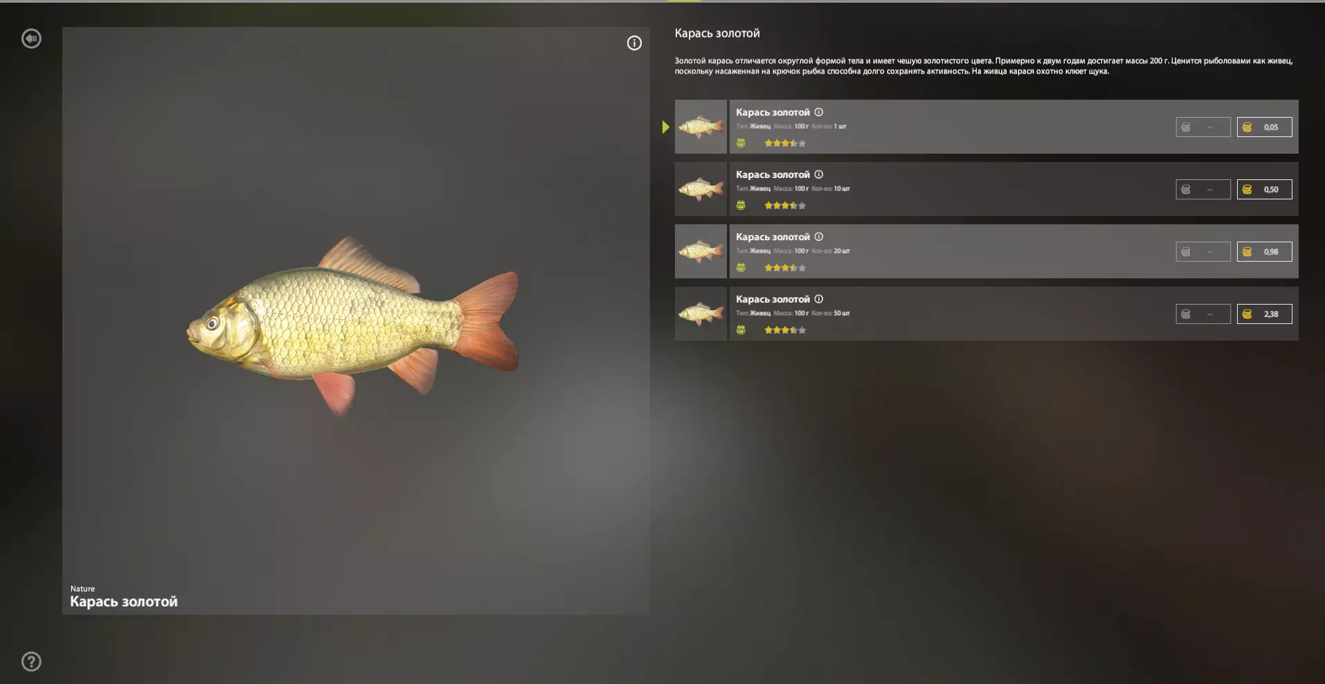 商店中鱼饵的价格。 重要的是要说明,大多数人真正感兴趣的是新鲜的99-100%活饵,这意味着应该发布帖子,不要在找到买家后才将鱼转化为活饵,而是制作30条买家需要的鱼,然后出售完全新鲜的活饵。 即使鱼缸里的鱼已经不新鲜了,活饵也会是100%,但不要让鱼的新鲜度降到1%,那样的鱼已经无法制成活饵了。即使是几乎变质的红鱼,只要鱼缸里还残留至少2%的新鲜度,也能让它100%恢复活力。专业刀具