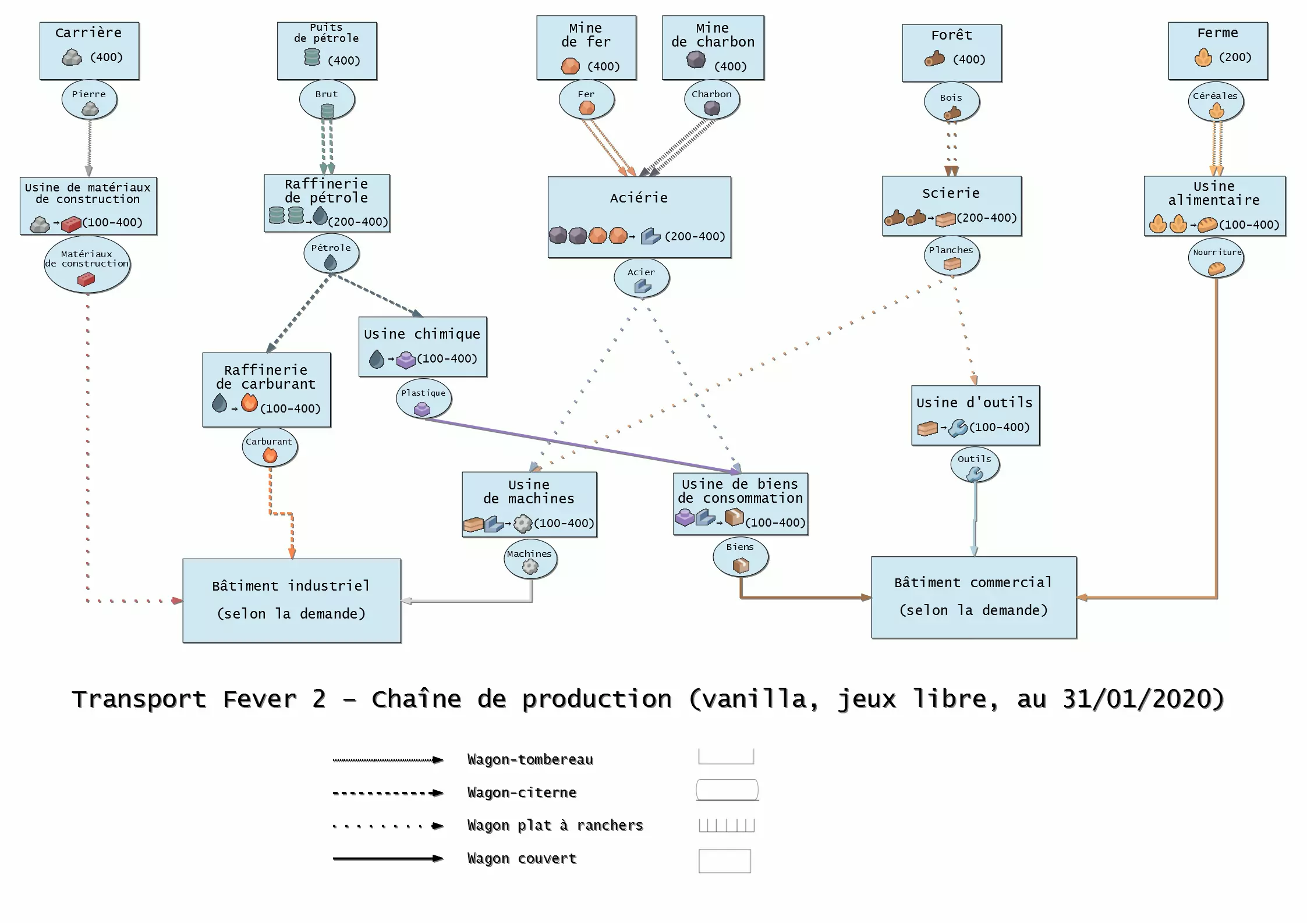 从原材料来源到最终用户的物流流程图。 请注意,在战役的某些任务中,会提供特殊产品及其相关产业,而在自由游戏模式中则没有。 括号中的数字表示该产业的最小和最大产量。这指的是该产业的产品产量,而非其生产所需的原材料量!例如,一座炼油厂可能需要两座石油钻井的产量。 因此,箭头的数量对应生产所需的原材料比例:即从石油钻井到炼油厂有两个箭头。然后需要将两口油井的产量运输到炼油厂,以使其达到最大产量。 如果您发现错误,请告知我。 这个法语版本是我基于twothreenine的原始作品制作的。 Planche