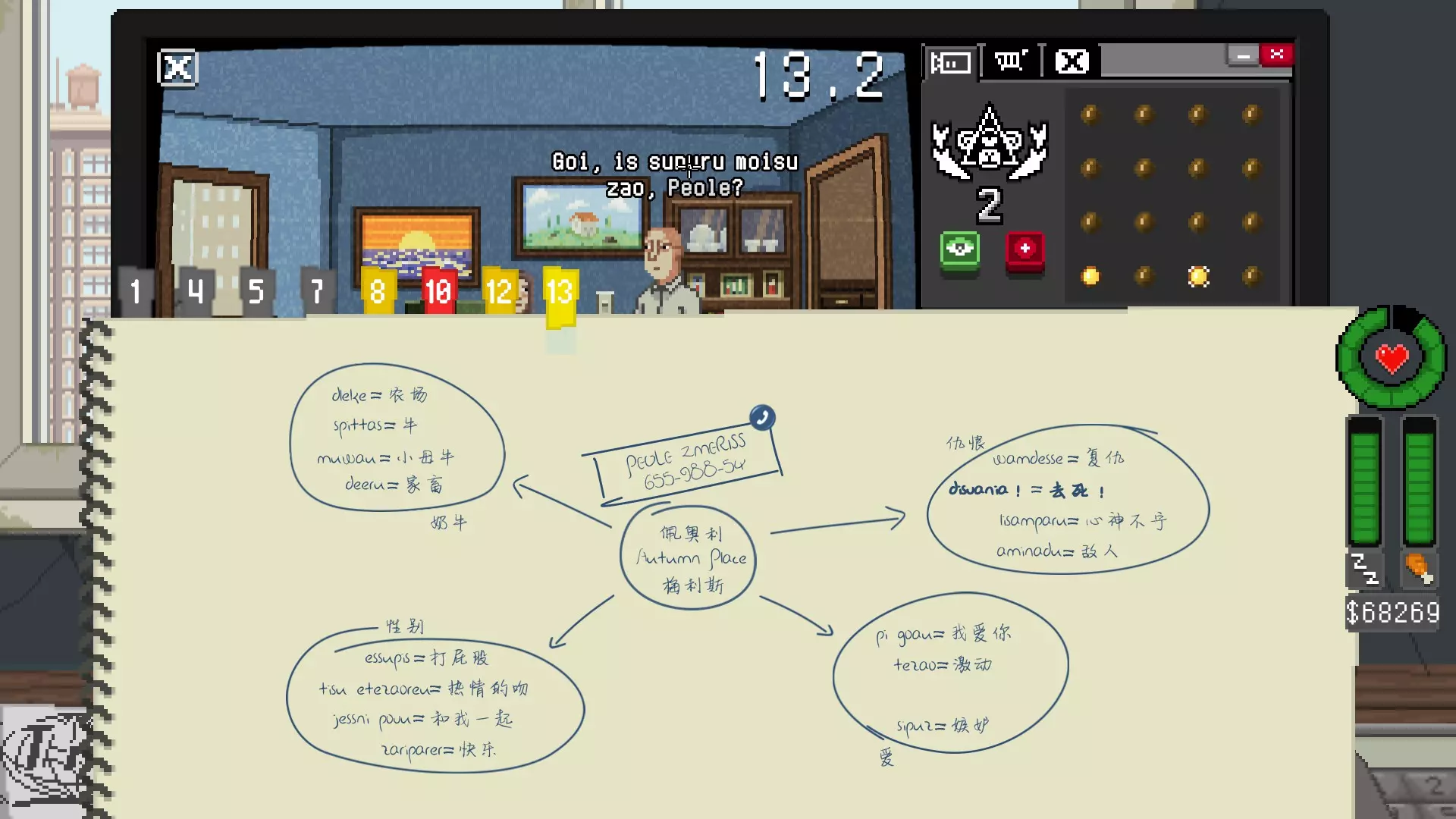 自由群猴 他们聚集在具有领导力、攻击力最强的首领猴周围。 结局二: 奥古斯特·汉克尔+过去太可怕了! 11. 富家千金 卡萨迪+艾莉丝=卡萨迪艾莉丝+科迪路34号 保单....保险公司 谨慎+保险公司=甜蜜的谨慎+676-567-56 目前只打出来的一个结局: 连续两晚给艾莉丝的地址送酒过去,她会再次酗酒。这时你拨打保险电话要求赔偿金她会直接给你,但之后无论要不要赔偿金都会事故身亡。 12.赌博热线 45高速公路+沙漠=拉斯杜纳斯 赛事狙击=635-145-49 之后可以拨打电话并选择赛事狙击进行下注 结局一: 在22:00点击右上角的时钟,反馈给俱乐部 赌博站会被关闭 结局二: 再四次大额下注后下注会停止, 只要参与过VIP下注之后可以在最终结局里看到【VIP赛事】被合法化 也就是俄罗斯轮盘赌 13.学外语 这位女人每次打电话或者看电视剧的时候都会学习【外语】 反复监听之后可以得到四个词组的分类