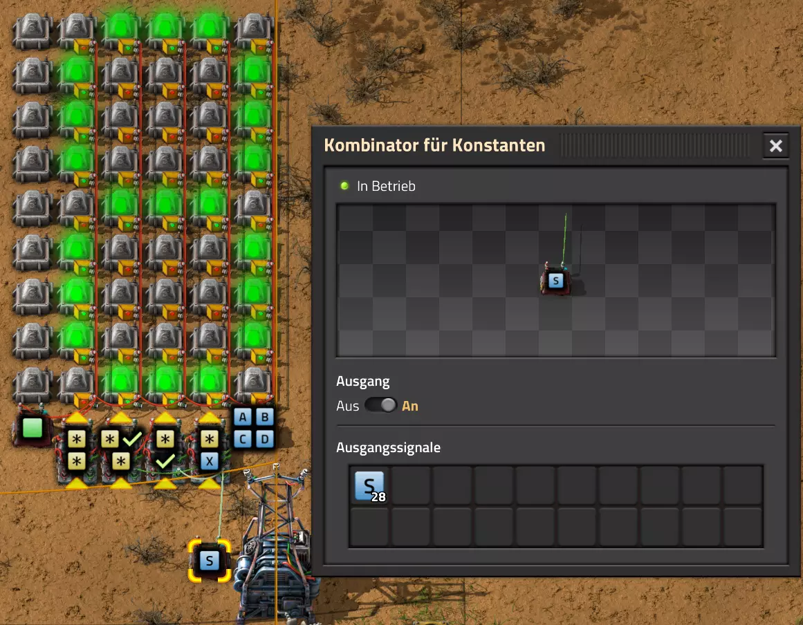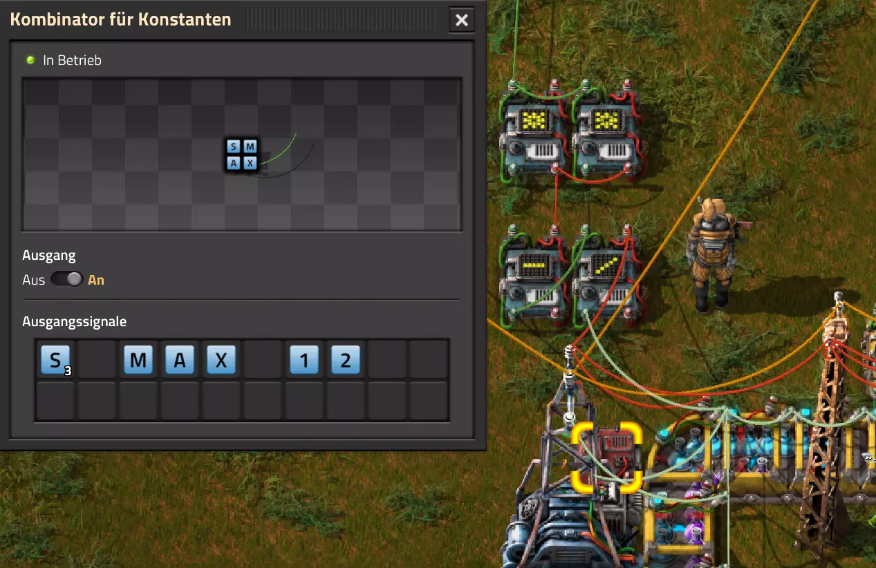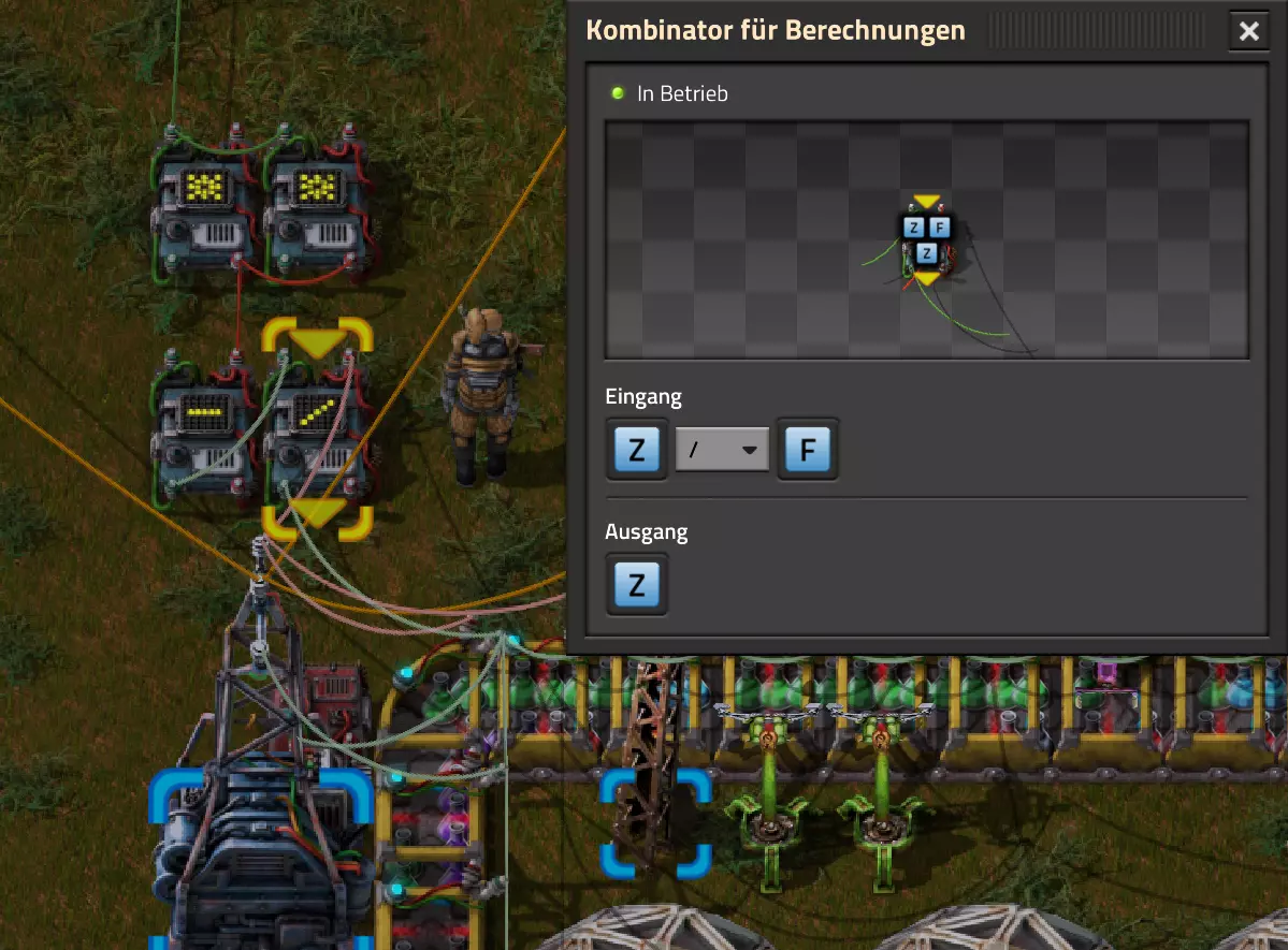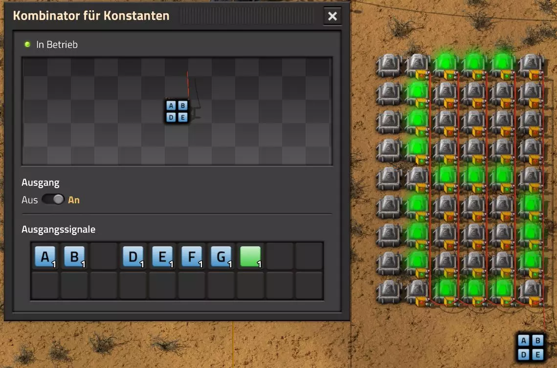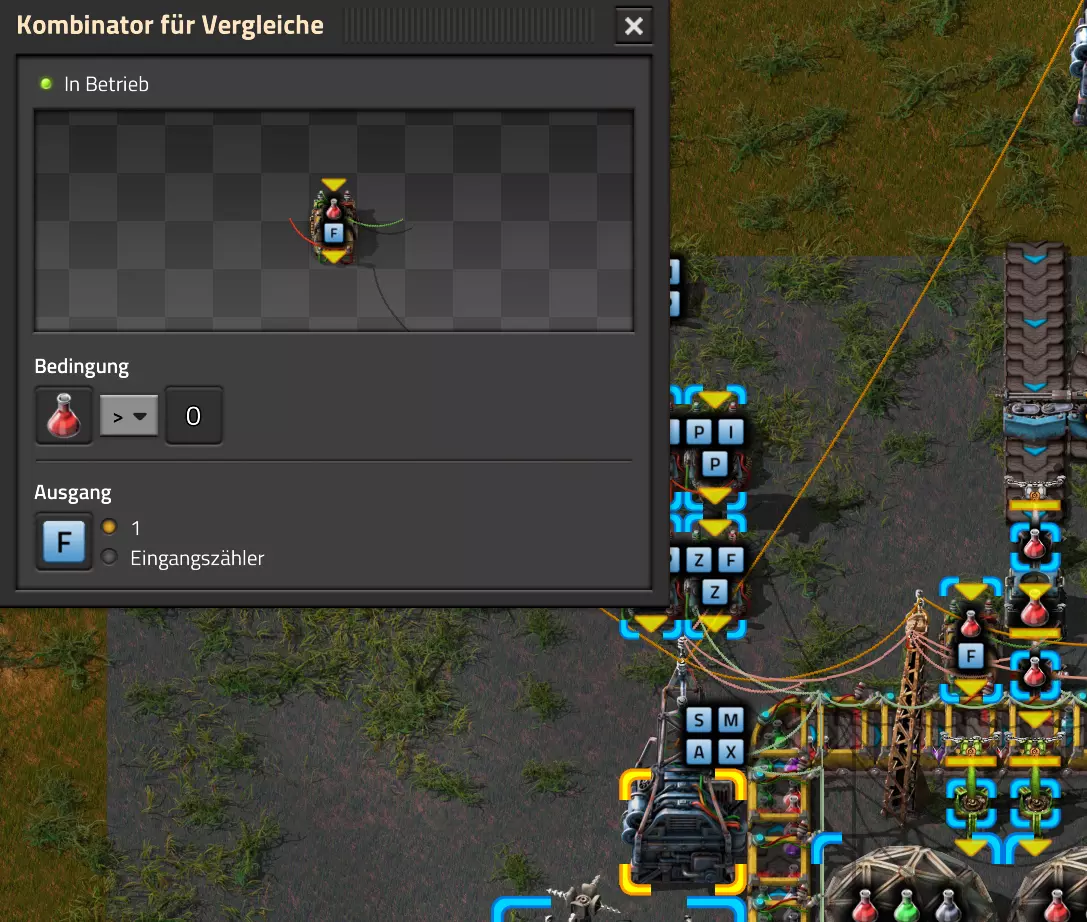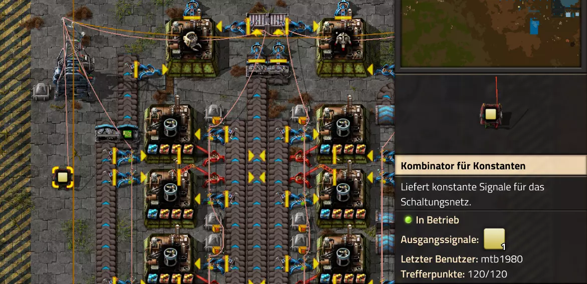 Nachtrag zur Blaupause: Ich hatte mich schon gefreut, dass der Code der Blaupause hier reingepasst hätte. Wenn der unsinnige Steam-Schimpfwortfilter in den Guides nicht mal wieder zugeschlagen hätte. Einige Passagen wurden mit Herzchen ersetzt -.- Daher auch hier wieder der Link zu einem Google-Doc: https://docs.google.com/document/d/1kGbdtH0igx5T_QMFc8MOjfhNyeQ3IJ4LIqh8s_tC6vk/edit?usp=sharing Video: Display-Schaltungen Video: Angepasste Display-Schaltung für Spielzeitanzeige Ich habe das Netz weiter nach Ideen durchforstet und stieß auf ein Video, bei dem es um die Anzeige der eigentlichen Spielzeit ging. Daher hab ich das kurzerhand übernommen, mein Video findest Du hier: In meinem Video verwende ich eine von mir veröffentlichte Tabelle, diese kannst Du hier herunterladen: https://1drv.ms/x/s!AoXhJ5_uZEt1j5VJFk91u9ZqoSAuEg?e=Tzx3tL Das Originalvideo war von Azorae mit dem Titel "Factorio - How to make a Digital Display and Game Clock", hier das Originalvideo: Guide-Playlist PlaylistBeachte bitte folgendes: Playlists werden von Steam nicht korrekt im Steam-Browser übertragen (beziehungsweise auf der Steam-Website nicht korrekt abgespielt): es wird immer nur das erste Video abgespielt. Öffne daher die Playlist in einem richtigen Browser nach Wahl. Die komplette YouTube-Playlist findest Du hier: https://www.youtube.com/watch?v=M8p5x1Z5Gdo&list=PLHcncrCCN2W5VAeaeb2bESmjmVw0klAli Einzel-Video-AufstellungFür die reinen Steam-User hier nochmal alle Einzelvideos aufgereiht; soweit ich das mitbekommen hab, kann Steam keine Playlists abspielen: (Update 2024: Änderungen seit meiner Basisversion des Guides) (Zusatz: Erz- und Ölfeld-Alarme wenn leer) (#6) (#8) (#12) Projekte: (Zusatzvideo zu Bahnübergänge) (Zusatzvideo zu Tankbefüllungen) (Ölverarbeitung) (Forschungsanlage 2 v3) (Forschungsanlage 3 v1) (Robo-Fertigung) Zeitschaltungs-Videos: (Einleitung zu Ticks) (Zeitschaltung bauen: Tage, Stunden, Minuten, Sekunden) (Berechnung und Hilfe zur Bitmaske, Vorbereitung für Displayschaltung) Dazugehörige Microsoft Excel Arbeitsmappe: https://1drv.ms/x/s!AoXhJ5_uZEt1j5VEGjgfHBEaet2vJw (Video zur Displayschaltung und verschiedene Anwendungen) (Displayschaltung mit echter Spielzeitanzeige) Versionsänderungen 11/2024:Neue Inhalte: Abschnitt für Forschungsanlage 3 (v1) eingebaut, speziell an "Space Age" DLC angepasst Video zu Forschungsanlage 3 (v1) eingebaut Video zu neuen Schaltungselementen eingebaut, welche seit der Guide-Erstellung dazugekommen sind Inhalte angepasst: Information bezüglich der neuen Funktionen seit der Guide-Erstellung bei verschiedenen, bisher bestehenden Kombinatoren eingebaut 06/2022:Neue Inhalte: Video zu angepassten Displays angefügt - die echte Spielzeit anzeigen Zusatzvideo zu Bahnübergängen eingebaut Neuen Abschnitt für Erzabbau-Infos eingebaut, enthält nur Video und keine schriftliche Anleitung. Grüße gehen raus an @Sneak0r! Video zum Projekt "Displayschaltung" eingefügt: Displays Video von SeeNo zu "Forschung 1" eingefügt (seine Idee!) Videos zum Projekt "Displayschaltung" eingefügt: Referenzschaltung (inkl. Support-Material) Video "Zeitzähler-Schaltung" eingefügt Video "Einleitung Ticks" eingefügt Video zum Projekt "Robo-Fertigung" eingefügt Video zum Projekt "Forschung 2 (v3)" eingefügt Video zum Projekt "Ölverarbeitung" eingefügt Neuer Abschnitt: "Da fehlt noch was?" eingebaut, direkt über den Kommentaren Inhalte angepasst: Hinweis auf SeeNo's Video zur Forschung 1 im Einleitungstext zum Abschnitt eingefügt Versionsänderung überarbeitet: Anzeige auf Monatsblöcke umgestellt 05/2022:Neue Inhalte: Video über dem Ölverarbeitungsbeispiel eingefügt, warum ich bei Tanks immer den Durchschnitt rechne 08/2021:Neue Inhalte: Video zur Füllstandsanzeige Spezial eingebaut (Beispiel Lampen Füllstandsanzeige) Video zur FlipFlop-/RS-/SR-Schaltung eingebaut (Auto-Abschaltung) Inhalte angepasst: Bei den YouTube-Videos die Kommentar-Funktion aktiviert 07/2021:Neue Inhalte: Video zu Lautsprecher und Alarmen eingebautVideo zur Einstellung von Filtergreifarmen eingebaut Video zu den Basis-Kombinatoren erstellt Video zu den Stern-Variablen erstellt Video zu Greifarm-Einstellungen und Lampen erstellt Video-Playlist für alle Guide-Videos eingesetzt Neuen Bereich zu Ansichtsoptionen in Factorio nach dem vergleichenden Kombinator eingefügt Video zur Einleitung bereitgestellt Neue Beispiele eingefügt: Automatisierte, teilintelligente Roboter-Fertigung eingebaut Neue Beispiele eingefügt: Display-Stückzahl-Anzeige (groß) eingebaut Timer-Anzeige hh:mm:ss (kompakt) eingebaut Bahnübergänge sichern Abschnitt über Detailinfo zu den Gruppenvariablen hinzugefügtVorwort ergänzt: Neuen Abschnitt angelegt mit Hinweis, dass nicht jedes Problem mit einer Schaltung optimal gelöst werden sollte ;) Beispiele für verschiedene Forschungskomplexe eingebaut SR-Latch (Flipflop) Schaltung hinzugefügt -> Anlagenteile abschalten Inhalte angepasst: Einige Rechtschreib- und Satzfehler behoben Einleitung ergänzt Playlist-Abschnitt überarbeitet, im Steam-Guide lässt sich keine Playlist direkt abspielen. Daher zusätzlich alle bisherigen Einzelvideos zusätzlich einzeln nochmal angeführt Hinweis zu Bildern in der Einleitung hinzugefügt (Bild-Collagen) Überschriften der Beispiele umgeschrieben und gekürzt für bessere Lesbarkeit in der Seitenspalte Mehrere Rechtschreibfehler korrigiert, Einleitungsabsatz mit Splitter-Beispiel überarbeitet Einige Materialwortfehler ersetzt (habe ab und an Rohöl statt Schweröl geschrieben) Übersicht bei Versionsänderungen neu aufgebaut 06/2021:Neue Inhalte: Abschnitt für Zeitschaltung eingebaut Filtereinstellung eingebaut Beispielprojekt Kisten gleichmäßig befüllen eingebaut Abschnitt für verbesserte Ölversorgung fertiggestellt Lampen-Schaltungen fertiggestellt Beleuchtungsskala für Füllstände (Projektbeispiele) eingebaut Beispiele für Hinweismitteilungen eingebaut Miditorio-Abschnitt (Musik in Factorio) eingesetzt G