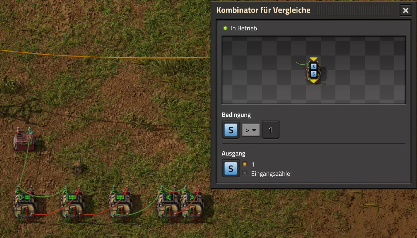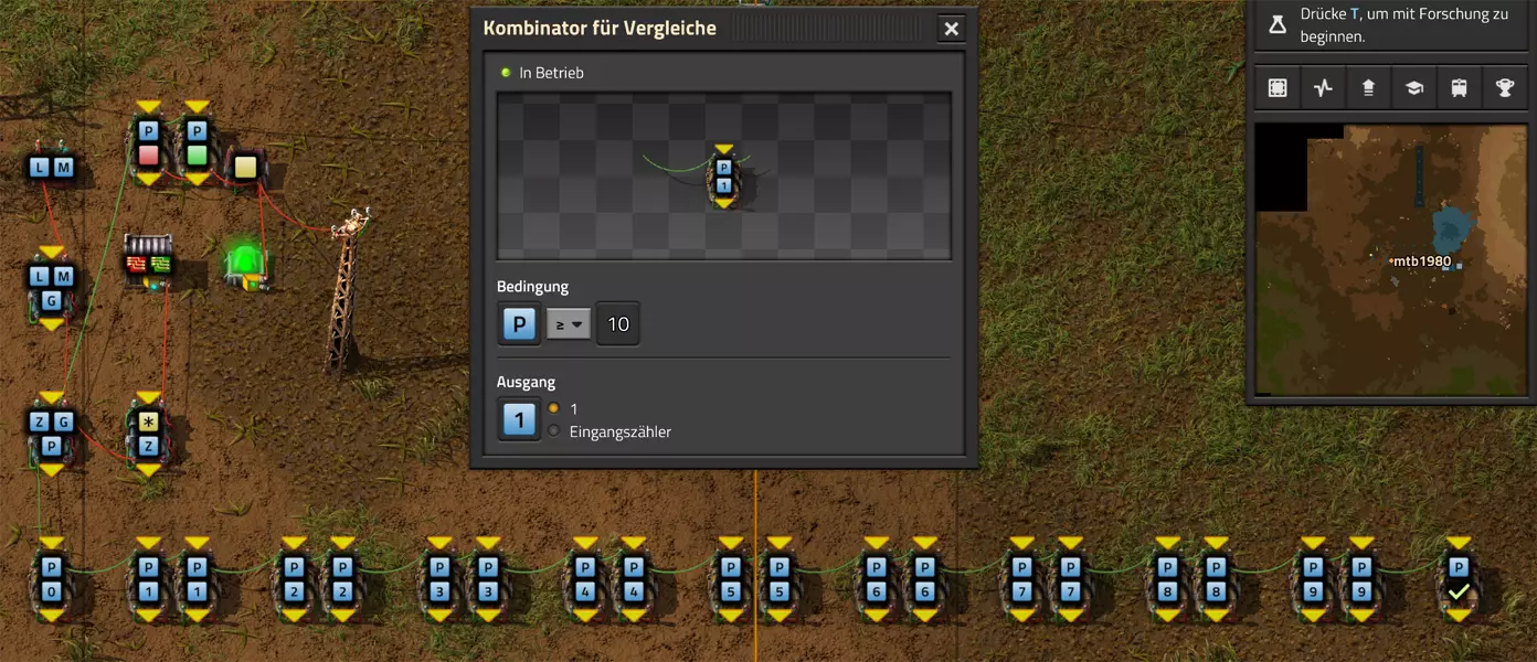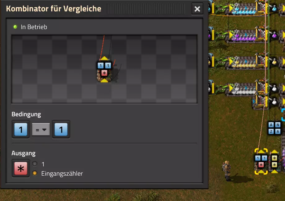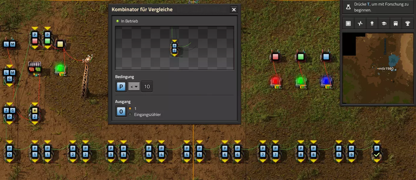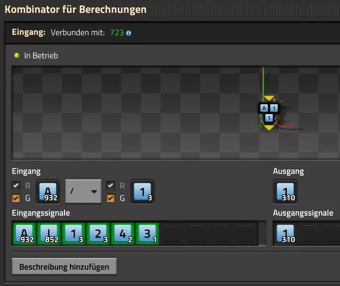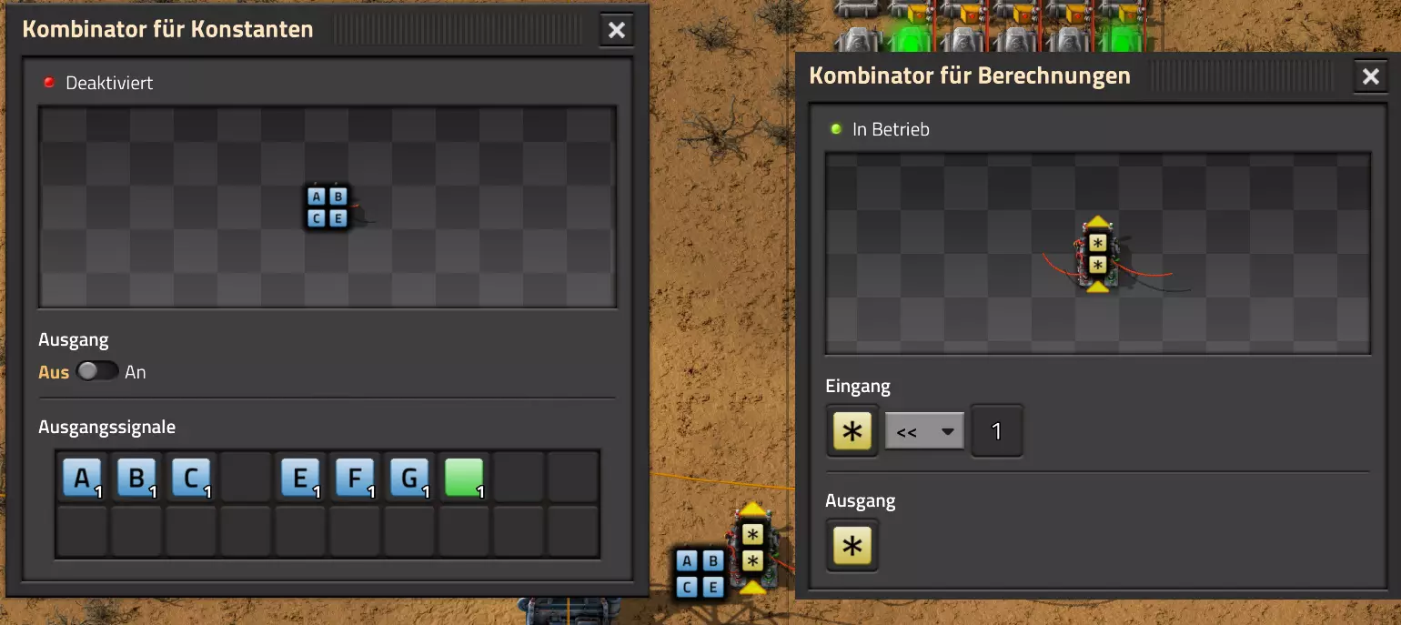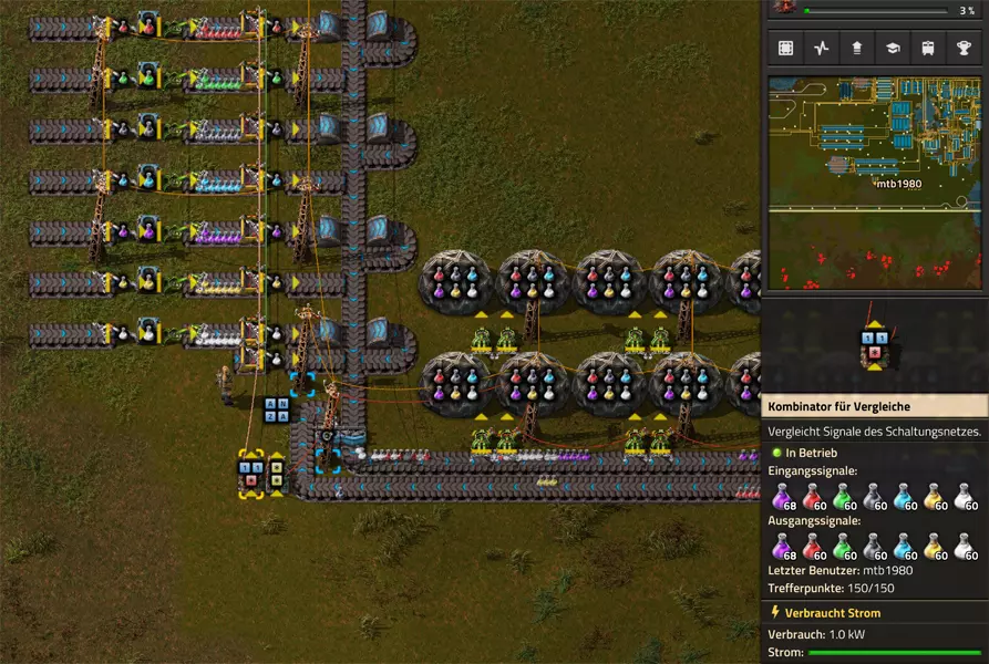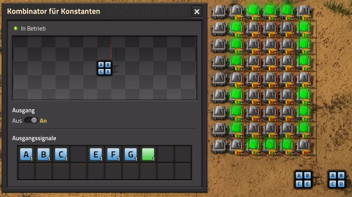 Nachtrag zur Blaupause: Ich hatte mich schon gefreut, dass der Code der Blaupause hier reingepasst hätte. Wenn der unsinnige Steam-Schimpfwortfilter in den Guides nicht mal wieder zugeschlagen hätte. Einige Passagen wurden mit Herzchen ersetzt -.- Daher auch hier wieder der Link zu einem Google-Doc: https://docs.google.com/document/d/1kGbdtH0igx5T_QMFc8MOjfhNyeQ3IJ4LIqh8s_tC6vk/edit?usp=sharing Video: Display-Schaltungen Video: Angepasste Display-Schaltung für Spielzeitanzeige Ich habe das Netz weiter nach Ideen durchforstet und stieß auf ein Video, bei dem es um die Anzeige der eigentlichen Spielzeit ging. Daher hab ich das kurzerhand übernommen, mein Video findest Du hier: In meinem Video verwende ich eine von mir veröffentlichte Tabelle, diese kannst Du hier herunterladen: https://1drv.ms/x/s!AoXhJ5_uZEt1j5VJFk91u9ZqoSAuEg?e=Tzx3tL Das Originalvideo war von Azorae mit dem Titel "Factorio - How to make a Digital Display and Game Clock", hier das Originalvideo: Guide-Playlist PlaylistBeachte bitte folgendes: Playlists werden von Steam nicht korrekt im Steam-Browser übertragen (beziehungsweise auf der Steam-Website nicht korrekt abgespielt): es wird immer nur das erste Video abgespielt. Öffne daher die Playlist in einem richtigen Browser nach Wahl. Die komplette YouTube-Playlist findest Du hier: https://www.youtube.com/watch?v=M8p5x1Z5Gdo&list=PLHcncrCCN2W5VAeaeb2bESmjmVw0klAli Einzel-Video-AufstellungFür die reinen Steam-User hier nochmal alle Einzelvideos aufgereiht; soweit ich das mitbekommen hab, kann Steam keine Playlists abspielen: (Update 2024: Änderungen seit meiner Basisversion des Guides) (Zusatz: Erz- und Ölfeld-Alarme wenn leer) (#6) (#8) (#12) Projekte: (Zusatzvideo zu Bahnübergänge) (Zusatzvideo zu Tankbefüllungen) (Ölverarbeitung) (Forschungsanlage 2 v3) (Forschungsanlage 3 v1) (Robo-Fertigung) Zeitschaltungs-Videos: (Einleitung zu Ticks) (Zeitschaltung bauen: Tage, Stunden, Minuten, Sekunden) (Berechnung und Hilfe zur Bitmaske, Vorbereitung für Displayschaltung) Dazugehörige Microsoft Excel Arbeitsmappe: https://1drv.ms/x/s!AoXhJ5_uZEt1j5VEGjgfHBEaet2vJw (Video zur Displayschaltung und verschiedene Anwendungen) (Displayschaltung mit echter Spielzeitanzeige) Versionsänderungen 11/2024:Neue Inhalte: Abschnitt für Forschungsanlage 3 (v1) eingebaut, speziell an "Space Age" DLC angepasst Video zu Forschungsanlage 3 (v1) eingebaut Video zu neuen Schaltungselementen eingebaut, welche seit der Guide-Erstellung dazugekommen sind Inhalte angepasst: Information bezüglich der neuen Funktionen seit der Guide-Erstellung bei verschiedenen, bisher bestehenden Kombinatoren eingebaut 06/2022:Neue Inhalte: Video zu angepassten Displays angefügt - die echte Spielzeit anzeigen Zusatzvideo zu Bahnübergängen eingebaut Neuen Abschnitt für Erzabbau-Infos eingebaut, enthält nur Video und keine schriftliche Anleitung. Grüße gehen raus an @Sneak0r! Video zum Projekt "Displayschaltung" eingefügt: Displays Video von SeeNo zu "Forschung 1" eingefügt (seine Idee!) Videos zum Projekt "Displayschaltung" eingefügt: Referenzschaltung (inkl. Support-Material) Video "Zeitzähler-Schaltung" eingefügt Video "Einleitung Ticks" eingefügt Video zum Projekt "Robo-Fertigung" eingefügt Video zum Projekt "Forschung 2 (v3)" eingefügt Video zum Projekt "Ölverarbeitung" eingefügt Neuer Abschnitt: "Da fehlt noch was?" eingebaut, direkt über den Kommentaren Inhalte angepasst: Hinweis auf SeeNo's Video zur Forschung 1 im Einleitungstext zum Abschnitt eingefügt Versionsänderung überarbeitet: Anzeige auf Monatsblöcke umgestellt 05/2022:Neue Inhalte: Video über dem Ölverarbeitungsbeispiel eingefügt, warum ich bei Tanks immer den Durchschnitt rechne 08/2021:Neue Inhalte: Video zur Füllstandsanzeige Spezial eingebaut (Beispiel Lampen Füllstandsanzeige) Video zur FlipFlop-/RS-/SR-Schaltung eingebaut (Auto-Abschaltung) Inhalte angepasst: Bei den YouTube-Videos die Kommentar-Funktion aktiviert 07/2021:Neue Inhalte: Video zu Lautsprecher und Alarmen eingebautVideo zur Einstellung von Filtergreifarmen eingebaut Video zu den Basis-Kombinatoren erstellt Video zu den Stern-Variablen erstellt Video zu Greifarm-Einstellungen und Lampen erstellt Video-Playlist für alle Guide-Videos eingesetzt Neuen Bereich zu Ansichtsoptionen in Factorio nach dem vergleichenden Kombinator eingefügt Video zur Einleitung bereitgestellt Neue Beispiele eingefügt: Automatisierte, teilintelligente Roboter-Fertigung eingebaut Neue Beispiele eingefügt: Display-Stückzahl-Anzeige (groß) eingebaut Timer-Anzeige hh:mm:ss (kompakt) eingebaut Bahnübergänge sichern Abschnitt über Detailinfo zu den Gruppenvariablen hinzugefügtVorwort ergänzt: Neuen Abschnitt angelegt mit Hinweis, dass nicht jedes Problem mit einer Schaltung optimal gelöst werden sollte ;) Beispiele für verschiedene Forschungskomplexe eingebaut SR-Latch (Flipflop) Schaltung hinzugefügt -> Anlagenteile abschalten Inhalte angepasst: Einige Rechtschreib- und Satzfehler behoben Einleitung ergänzt Playlist-Abschnitt überarbeitet, im Steam-Guide lässt sich keine Playlist direkt abspielen. Daher zusätzlich alle bisherigen Einzelvideos zusätzlich einzeln nochmal angeführt Hinweis zu Bildern in der Einleitung hinzugefügt (Bild-Collagen) Überschriften der Beispiele umgeschrieben und gekürzt für bessere Lesbarkeit in der Seitenspalte Mehrere Rechtschreibfehler korrigiert, Einleitungsabsatz mit Splitter-Beispiel überarbeitet Einige Materialwortfehler ersetzt (habe ab und an Rohöl statt Schweröl geschrieben) Übersicht bei Versionsänderungen neu aufgebaut 06/2021:Neue Inhalte: Abschnitt für Zeitschaltung eingebaut Filtereinstellung eingebaut Beispielprojekt Kisten gleichmäßig befüllen eingebaut Abschnitt für verbesserte Ölversorgung fertiggestellt Lampen-Schaltungen fertiggestellt Beleuchtungsskala für Füllstände (Projektbeispiele) eingebaut Beispiele für Hinweismitteilungen eingebaut Miditorio-Abschnitt (Musik in Factorio) eingesetzt G