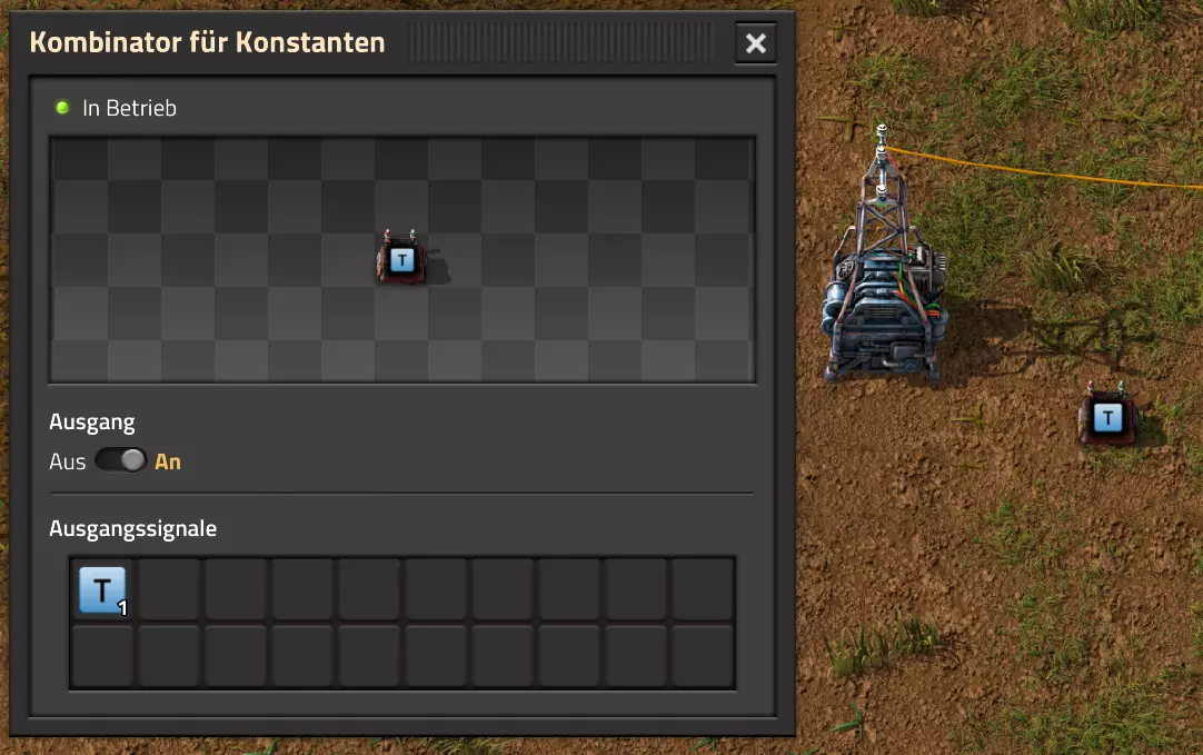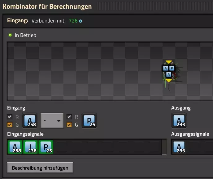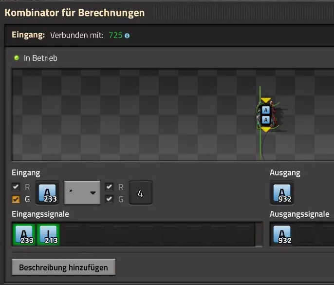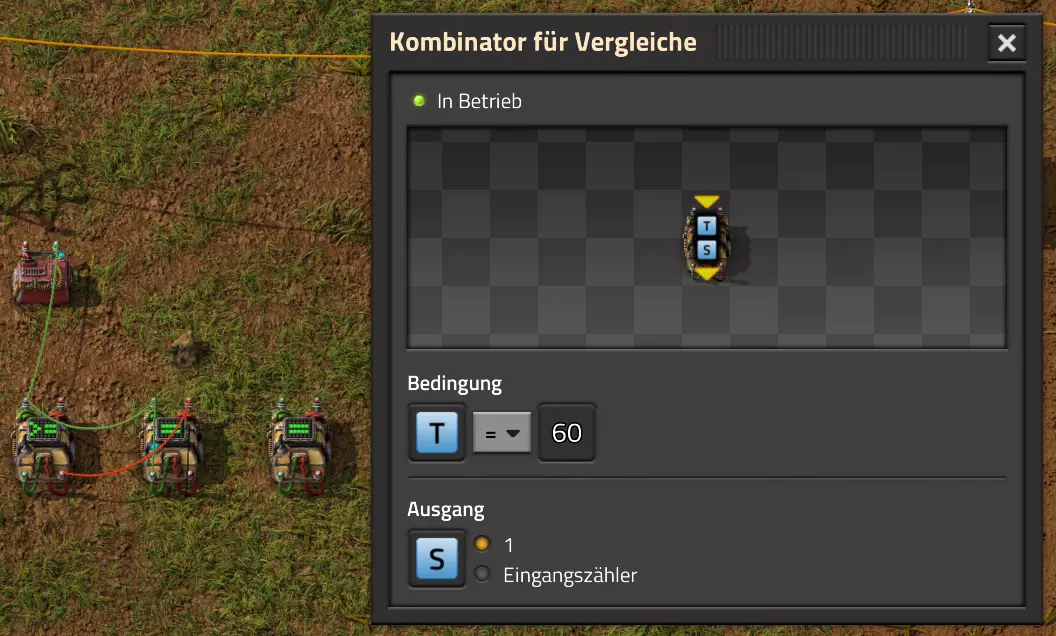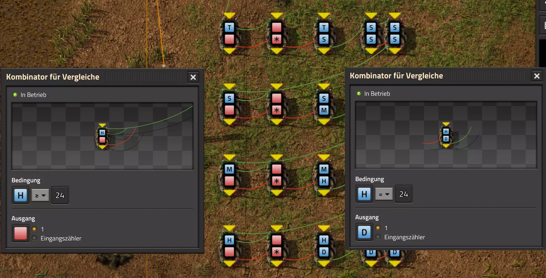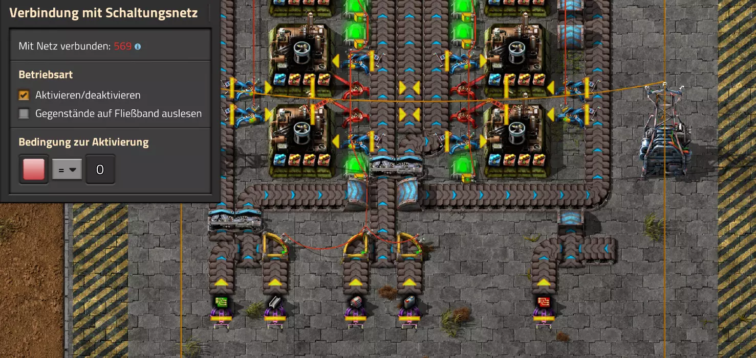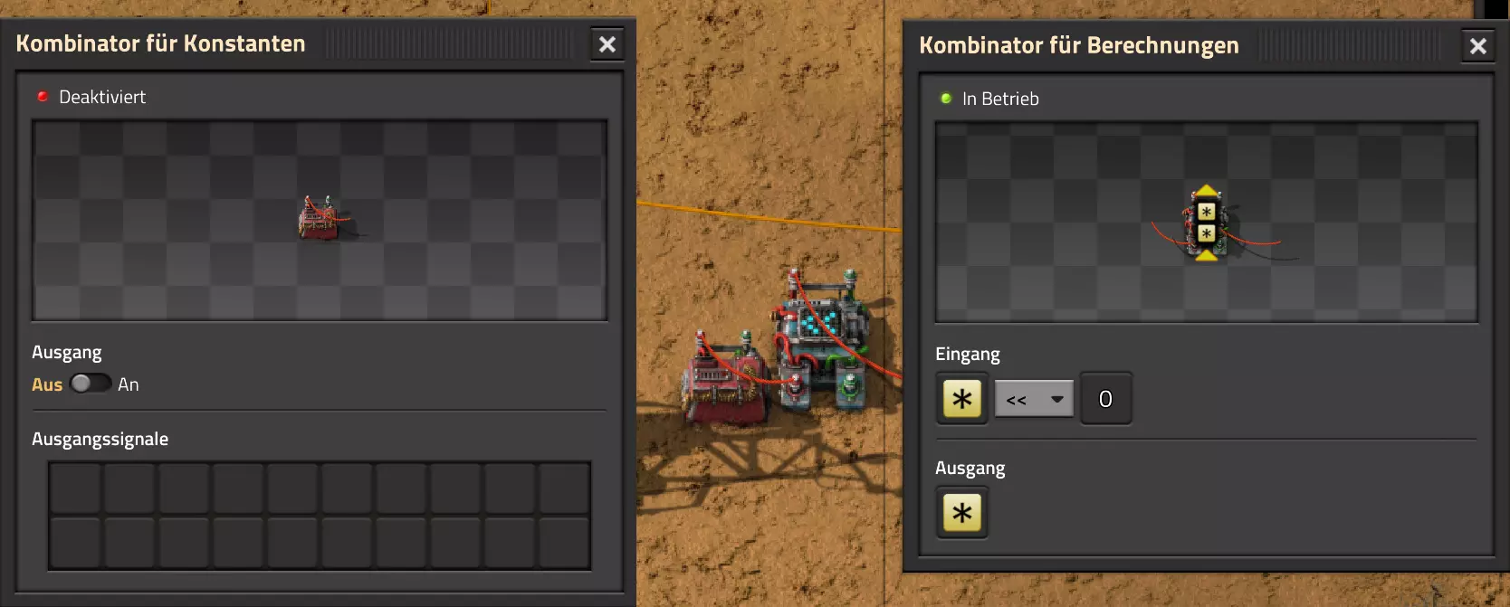Nachtrag zur Blaupause: Ich hatte mich schon gefreut, dass der Code der Blaupause hier reingepasst hätte. Wenn der unsinnige Steam-Schimpfwortfilter in den Guides nicht mal wieder zugeschlagen hätte. Einige Passagen wurden mit Herzchen ersetzt -.- Daher auch hier wieder der Link zu einem Google-Doc: https://docs.google.com/document/d/1kGbdtH0igx5T_QMFc8MOjfhNyeQ3IJ4LIqh8s_tC6vk/edit?usp=sharing Video: Display-Schaltungen Video: Angepasste Display-Schaltung für Spielzeitanzeige Ich habe das Netz weiter nach Ideen durchforstet und stieß auf ein Video, bei dem es um die Anzeige der eigentlichen Spielzeit ging. Daher hab ich das kurzerhand übernommen, mein Video findest Du hier: In meinem Video verwende ich eine von mir veröffentlichte Tabelle, diese kannst Du hier herunterladen: https://1drv.ms/x/s!AoXhJ5_uZEt1j5VJFk91u9ZqoSAuEg?e=Tzx3tL Das Originalvideo war von Azorae mit dem Titel "Factorio - How to make a Digital Display and Game Clock", hier das Originalvideo: Guide-Playlist PlaylistBeachte bitte folgendes: Playlists werden von Steam nicht korrekt im Steam-Browser übertragen (beziehungsweise auf der Steam-Website nicht korrekt abgespielt): es wird immer nur das erste Video abgespielt. Öffne daher die Playlist in einem richtigen Browser nach Wahl. Die komplette YouTube-Playlist findest Du hier: https://www.youtube.com/watch?v=M8p5x1Z5Gdo&list=PLHcncrCCN2W5VAeaeb2bESmjmVw0klAli Einzel-Video-AufstellungFür die reinen Steam-User hier nochmal alle Einzelvideos aufgereiht; soweit ich das mitbekommen hab, kann Steam keine Playlists abspielen: (Update 2024: Änderungen seit meiner Basisversion des Guides) (Zusatz: Erz- und Ölfeld-Alarme wenn leer) (#6) (#8) (#12) Projekte: (Zusatzvideo zu Bahnübergänge) (Zusatzvideo zu Tankbefüllungen) (Ölverarbeitung) (Forschungsanlage 2 v3) (Forschungsanlage 3 v1) (Robo-Fertigung) Zeitschaltungs-Videos: (Einleitung zu Ticks) (Zeitschaltung bauen: Tage, Stunden, Minuten, Sekunden) (Berechnung und Hilfe zur Bitmaske, Vorbereitung für Displayschaltung) Dazugehörige Microsoft Excel Arbeitsmappe: https://1drv.ms/x/s!AoXhJ5_uZEt1j5VEGjgfHBEaet2vJw (Video zur Displayschaltung und verschiedene Anwendungen) (Displayschaltung mit echter Spielzeitanzeige) Versionsänderungen 11/2024:Neue Inhalte: Abschnitt für Forschungsanlage 3 (v1) eingebaut, speziell an "Space Age" DLC angepasst Video zu Forschungsanlage 3 (v1) eingebaut Video zu neuen Schaltungselementen eingebaut, welche seit der Guide-Erstellung dazugekommen sind Inhalte angepasst: Information bezüglich der neuen Funktionen seit der Guide-Erstellung bei verschiedenen, bisher bestehenden Kombinatoren eingebaut 06/2022:Neue Inhalte: Video zu angepassten Displays angefügt - die echte Spielzeit anzeigen Zusatzvideo zu Bahnübergängen eingebaut Neuen Abschnitt für Erzabbau-Infos eingebaut, enthält nur Video und keine schriftliche Anleitung. Grüße gehen raus an @Sneak0r! Video zum Projekt "Displayschaltung" eingefügt: Displays Video von SeeNo zu "Forschung 1" eingefügt (seine Idee!) Videos zum Projekt "Displayschaltung" eingefügt: Referenzschaltung (inkl. Support-Material) Video "Zeitzähler-Schaltung" eingefügt Video "Einleitung Ticks" eingefügt Video zum Projekt "Robo-Fertigung" eingefügt Video zum Projekt "Forschung 2 (v3)" eingefügt Video zum Projekt "Ölverarbeitung" eingefügt Neuer Abschnitt: "Da fehlt noch was?" eingebaut, direkt über den Kommentaren Inhalte angepasst: Hinweis auf SeeNo's Video zur Forschung 1 im Einleitungstext zum Abschnitt eingefügt Versionsänderung überarbeitet: Anzeige auf Monatsblöcke umgestellt 05/2022:Neue Inhalte: Video über dem Ölverarbeitungsbeispiel eingefügt, warum ich bei Tanks immer den Durchschnitt rechne 08/2021:Neue Inhalte: Video zur Füllstandsanzeige Spezial eingebaut (Beispiel Lampen Füllstandsanzeige) Video zur FlipFlop-/RS-/SR-Schaltung eingebaut (Auto-Abschaltung) Inhalte angepasst: Bei den YouTube-Videos die Kommentar-Funktion aktiviert 07/2021:Neue Inhalte: Video zu Lautsprecher und Alarmen eingebautVideo zur Einstellung von Filtergreifarmen eingebaut Video zu den Basis-Kombinatoren erstellt Video zu den Stern-Variablen erstellt Video zu Greifarm-Einstellungen und Lampen erstellt Video-Playlist für alle Guide-Videos eingesetzt Neuen Bereich zu Ansichtsoptionen in Factorio nach dem vergleichenden Kombinator eingefügt Video zur Einleitung bereitgestellt Neue Beispiele eingefügt: Automatisierte, teilintelligente Roboter-Fertigung eingebaut Neue Beispiele eingefügt: Display-Stückzahl-Anzeige (groß) eingebaut Timer-Anzeige hh:mm:ss (kompakt) eingebaut Bahnübergänge sichern Abschnitt über Detailinfo zu den Gruppenvariablen hinzugefügtVorwort ergänzt: Neuen Abschnitt angelegt mit Hinweis, dass nicht jedes Problem mit einer Schaltung optimal gelöst werden sollte ;) Beispiele für verschiedene Forschungskomplexe eingebaut SR-Latch (Flipflop) Schaltung hinzugefügt -> Anlagenteile abschalten Inhalte angepasst: Einige Rechtschreib- und Satzfehler behoben Einleitung ergänzt Playlist-Abschnitt überarbeitet, im Steam-Guide lässt sich keine Playlist direkt abspielen. Daher zusätzlich alle bisherigen Einzelvideos zusätzlich einzeln nochmal angeführt Hinweis zu Bildern in der Einleitung hinzugefügt (Bild-Collagen) Überschriften der Beispiele umgeschrieben und gekürzt für bessere Lesbarkeit in der Seitenspalte Mehrere Rechtschreibfehler korrigiert, Einleitungsabsatz mit Splitter-Beispiel überarbeitet Einige Materialwortfehler ersetzt (habe ab und an Rohöl statt Schweröl geschrieben) Übersicht bei Versionsänderungen neu aufgebaut 06/2021:Neue Inhalte: Abschnitt für Zeitschaltung eingebaut Filtereinstellung eingebaut Beispielprojekt Kisten gleichmäßig befüllen eingebaut Abschnitt für verbesserte Ölversorgung fertiggestellt Lampen-Schaltungen fertiggestellt Beleuchtungsskala für Füllstände (Projektbeispiele) eingebaut Beispiele für Hinweismitteilungen eingebaut Miditorio-Abschnitt (Musik in Factorio) eingesetzt G