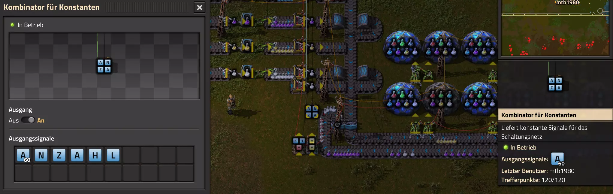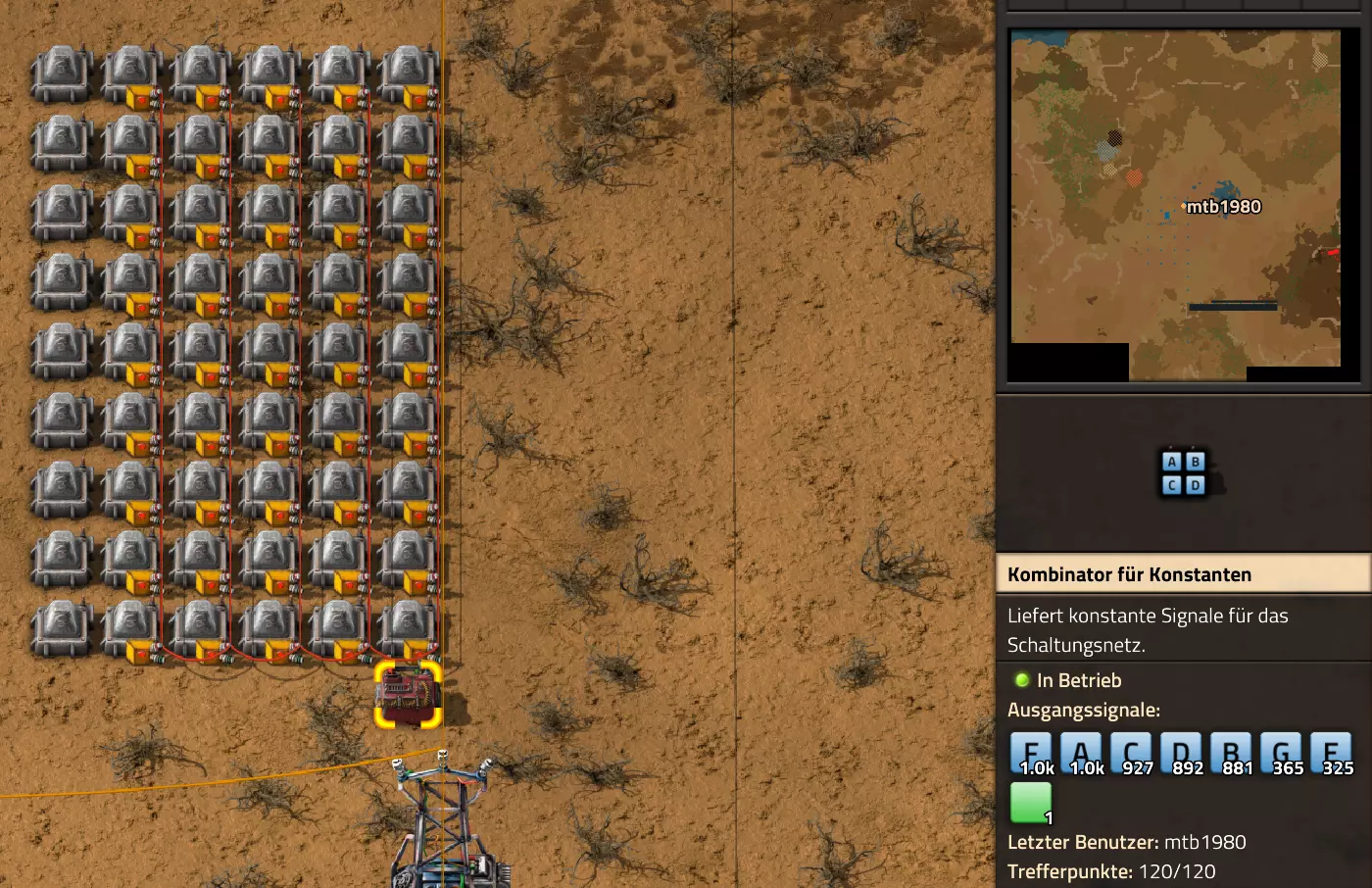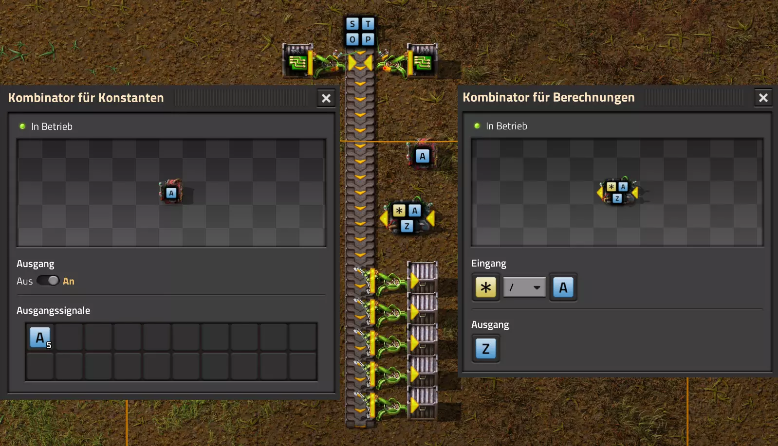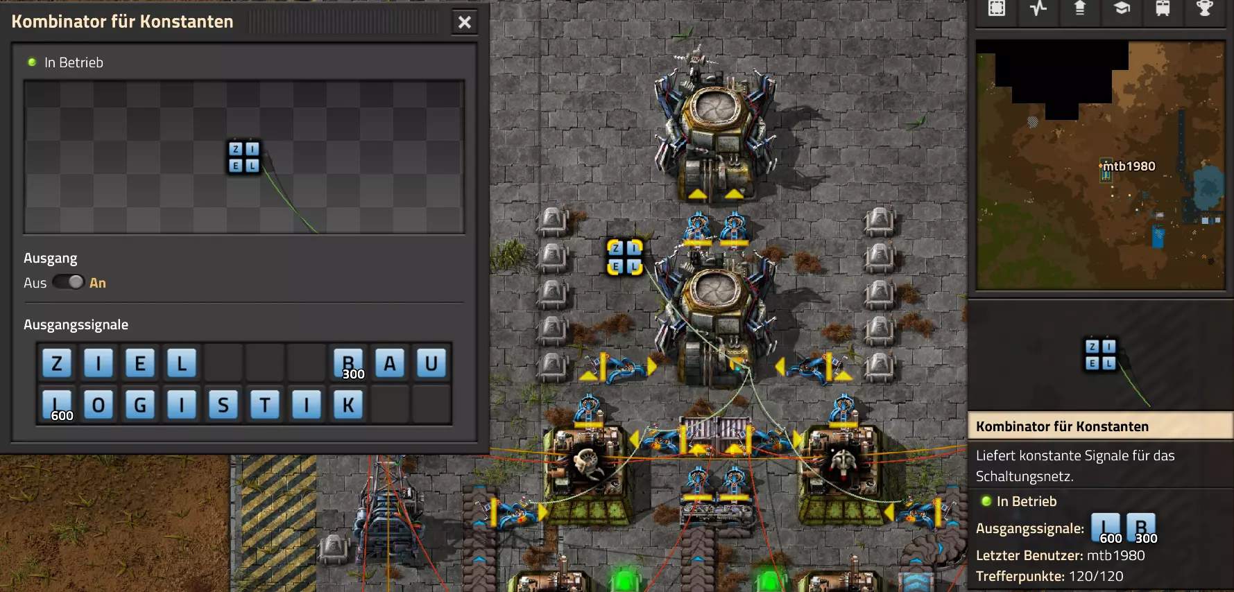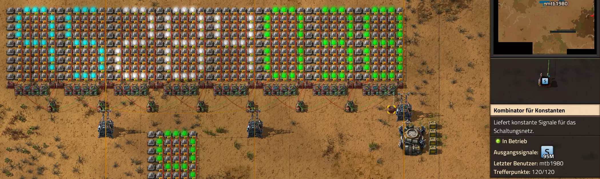 Nachtrag zur Blaupause: Ich hatte mich schon gefreut, dass der Code der Blaupause hier reingepasst hätte. Wenn der unsinnige Steam-Schimpfwortfilter in den Guides nicht mal wieder zugeschlagen hätte. Einige Passagen wurden mit Herzchen ersetzt -.- Daher auch hier wieder der Link zu einem Google-Doc: https://docs.google.com/document/d/1kGbdtH0igx5T_QMFc8MOjfhNyeQ3IJ4LIqh8s_tC6vk/edit?usp=sharing Video: Display-Schaltungen Video: Angepasste Display-Schaltung für Spielzeitanzeige Ich habe das Netz weiter nach Ideen durchforstet und stieß auf ein Video, bei dem es um die Anzeige der eigentlichen Spielzeit ging. Daher hab ich das kurzerhand übernommen, mein Video findest Du hier: In meinem Video verwende ich eine von mir veröffentlichte Tabelle, diese kannst Du hier herunterladen: https://1drv.ms/x/s!AoXhJ5_uZEt1j5VJFk91u9ZqoSAuEg?e=Tzx3tL Das Originalvideo war von Azorae mit dem Titel "Factorio - How to make a Digital Display and Game Clock", hier das Originalvideo: Guide-Playlist PlaylistBeachte bitte folgendes: Playlists werden von Steam nicht korrekt im Steam-Browser übertragen (beziehungsweise auf der Steam-Website nicht korrekt abgespielt): es wird immer nur das erste Video abgespielt. Öffne daher die Playlist in einem richtigen Browser nach Wahl. Die komplette YouTube-Playlist findest Du hier: https://www.youtube.com/watch?v=M8p5x1Z5Gdo&list=PLHcncrCCN2W5VAeaeb2bESmjmVw0klAli Einzel-Video-AufstellungFür die reinen Steam-User hier nochmal alle Einzelvideos aufgereiht; soweit ich das mitbekommen hab, kann Steam keine Playlists abspielen: (Update 2024: Änderungen seit meiner Basisversion des Guides) (Zusatz: Erz- und Ölfeld-Alarme wenn leer) (#6) (#8) (#12) Projekte: (Zusatzvideo zu Bahnübergänge) (Zusatzvideo zu Tankbefüllungen) (Ölverarbeitung) (Forschungsanlage 2 v3) (Forschungsanlage 3 v1) (Robo-Fertigung) Zeitschaltungs-Videos: (Einleitung zu Ticks) (Zeitschaltung bauen: Tage, Stunden, Minuten, Sekunden) (Berechnung und Hilfe zur Bitmaske, Vorbereitung für Displayschaltung) Dazugehörige Microsoft Excel Arbeitsmappe: https://1drv.ms/x/s!AoXhJ5_uZEt1j5VEGjgfHBEaet2vJw (Video zur Displayschaltung und verschiedene Anwendungen) (Displayschaltung mit echter Spielzeitanzeige) Versionsänderungen 11/2024:Neue Inhalte: Abschnitt für Forschungsanlage 3 (v1) eingebaut, speziell an "Space Age" DLC angepasst Video zu Forschungsanlage 3 (v1) eingebaut Video zu neuen Schaltungselementen eingebaut, welche seit der Guide-Erstellung dazugekommen sind Inhalte angepasst: Information bezüglich der neuen Funktionen seit der Guide-Erstellung bei verschiedenen, bisher bestehenden Kombinatoren eingebaut 06/2022:Neue Inhalte: Video zu angepassten Displays angefügt - die echte Spielzeit anzeigen Zusatzvideo zu Bahnübergängen eingebaut Neuen Abschnitt für Erzabbau-Infos eingebaut, enthält nur Video und keine schriftliche Anleitung. Grüße gehen raus an @Sneak0r! Video zum Projekt "Displayschaltung" eingefügt: Displays Video von SeeNo zu "Forschung 1" eingefügt (seine Idee!) Videos zum Projekt "Displayschaltung" eingefügt: Referenzschaltung (inkl. Support-Material) Video "Zeitzähler-Schaltung" eingefügt Video "Einleitung Ticks" eingefügt Video zum Projekt "Robo-Fertigung" eingefügt Video zum Projekt "Forschung 2 (v3)" eingefügt Video zum Projekt "Ölverarbeitung" eingefügt Neuer Abschnitt: "Da fehlt noch was?" eingebaut, direkt über den Kommentaren Inhalte angepasst: Hinweis auf SeeNo's Video zur Forschung 1 im Einleitungstext zum Abschnitt eingefügt Versionsänderung überarbeitet: Anzeige auf Monatsblöcke umgestellt 05/2022:Neue Inhalte: Video über dem Ölverarbeitungsbeispiel eingefügt, warum ich bei Tanks immer den Durchschnitt rechne 08/2021:Neue Inhalte: Video zur Füllstandsanzeige Spezial eingebaut (Beispiel Lampen Füllstandsanzeige) Video zur FlipFlop-/RS-/SR-Schaltung eingebaut (Auto-Abschaltung) Inhalte angepasst: Bei den YouTube-Videos die Kommentar-Funktion aktiviert 07/2021:Neue Inhalte: Video zu Lautsprecher und Alarmen eingebautVideo zur Einstellung von Filtergreifarmen eingebaut Video zu den Basis-Kombinatoren erstellt Video zu den Stern-Variablen erstellt Video zu Greifarm-Einstellungen und Lampen erstellt Video-Playlist für alle Guide-Videos eingesetzt Neuen Bereich zu Ansichtsoptionen in Factorio nach dem vergleichenden Kombinator eingefügt Video zur Einleitung bereitgestellt Neue Beispiele eingefügt: Automatisierte, teilintelligente Roboter-Fertigung eingebaut Neue Beispiele eingefügt: Display-Stückzahl-Anzeige (groß) eingebaut Timer-Anzeige hh:mm:ss (kompakt) eingebaut Bahnübergänge sichern Abschnitt über Detailinfo zu den Gruppenvariablen hinzugefügtVorwort ergänzt: Neuen Abschnitt angelegt mit Hinweis, dass nicht jedes Problem mit einer Schaltung optimal gelöst werden sollte ;) Beispiele für verschiedene Forschungskomplexe eingebaut SR-Latch (Flipflop) Schaltung hinzugefügt -> Anlagenteile abschalten Inhalte angepasst: Einige Rechtschreib- und Satzfehler behoben Einleitung ergänzt Playlist-Abschnitt überarbeitet, im Steam-Guide lässt sich keine Playlist direkt abspielen. Daher zusätzlich alle bisherigen Einzelvideos zusätzlich einzeln nochmal angeführt Hinweis zu Bildern in der Einleitung hinzugefügt (Bild-Collagen) Überschriften der Beispiele umgeschrieben und gekürzt für bessere Lesbarkeit in der Seitenspalte Mehrere Rechtschreibfehler korrigiert, Einleitungsabsatz mit Splitter-Beispiel überarbeitet Einige Materialwortfehler ersetzt (habe ab und an Rohöl statt Schweröl geschrieben) Übersicht bei Versionsänderungen neu aufgebaut 06/2021:Neue Inhalte: Abschnitt für Zeitschaltung eingebaut Filtereinstellung eingebaut Beispielprojekt Kisten gleichmäßig befüllen eingebaut Abschnitt für verbesserte Ölversorgung fertiggestellt Lampen-Schaltungen fertiggestellt Beleuchtungsskala für Füllstände (Projektbeispiele) eingebaut Beispiele für Hinweismitteilungen eingebaut Miditorio-Abschnitt (Musik in Factorio) eingesetzt G