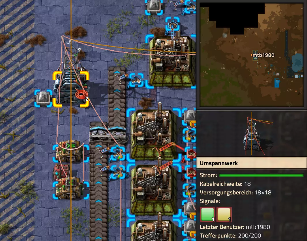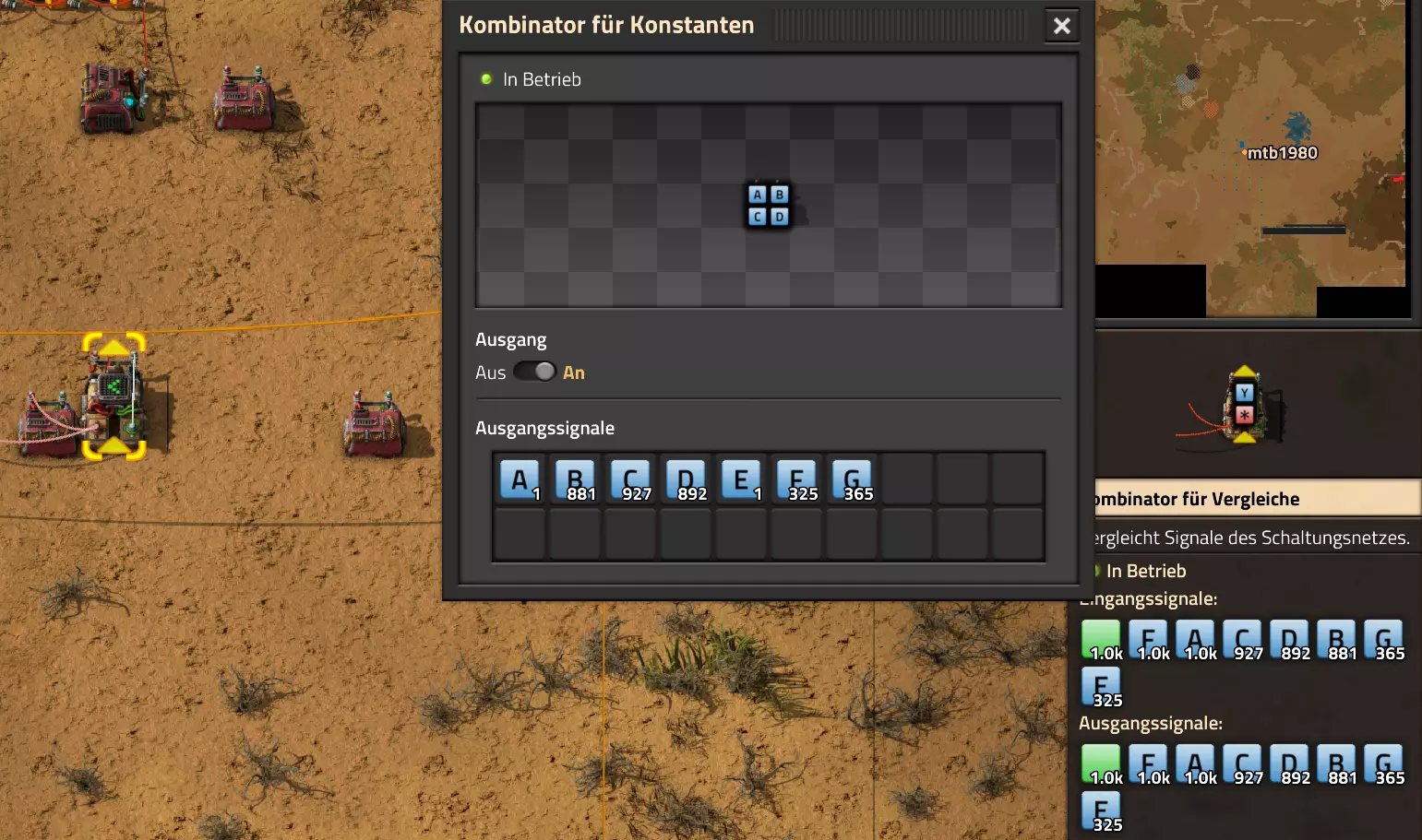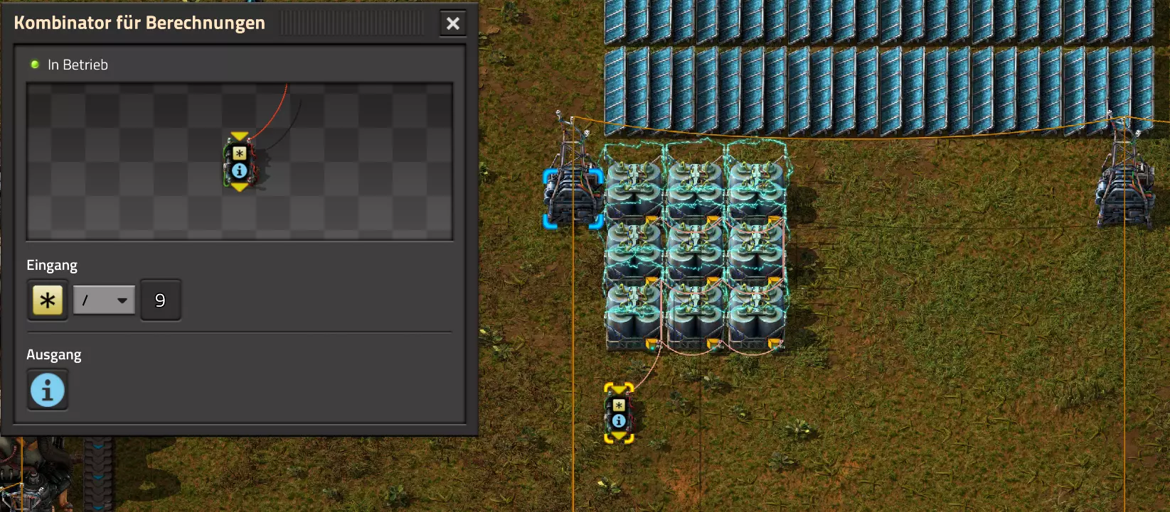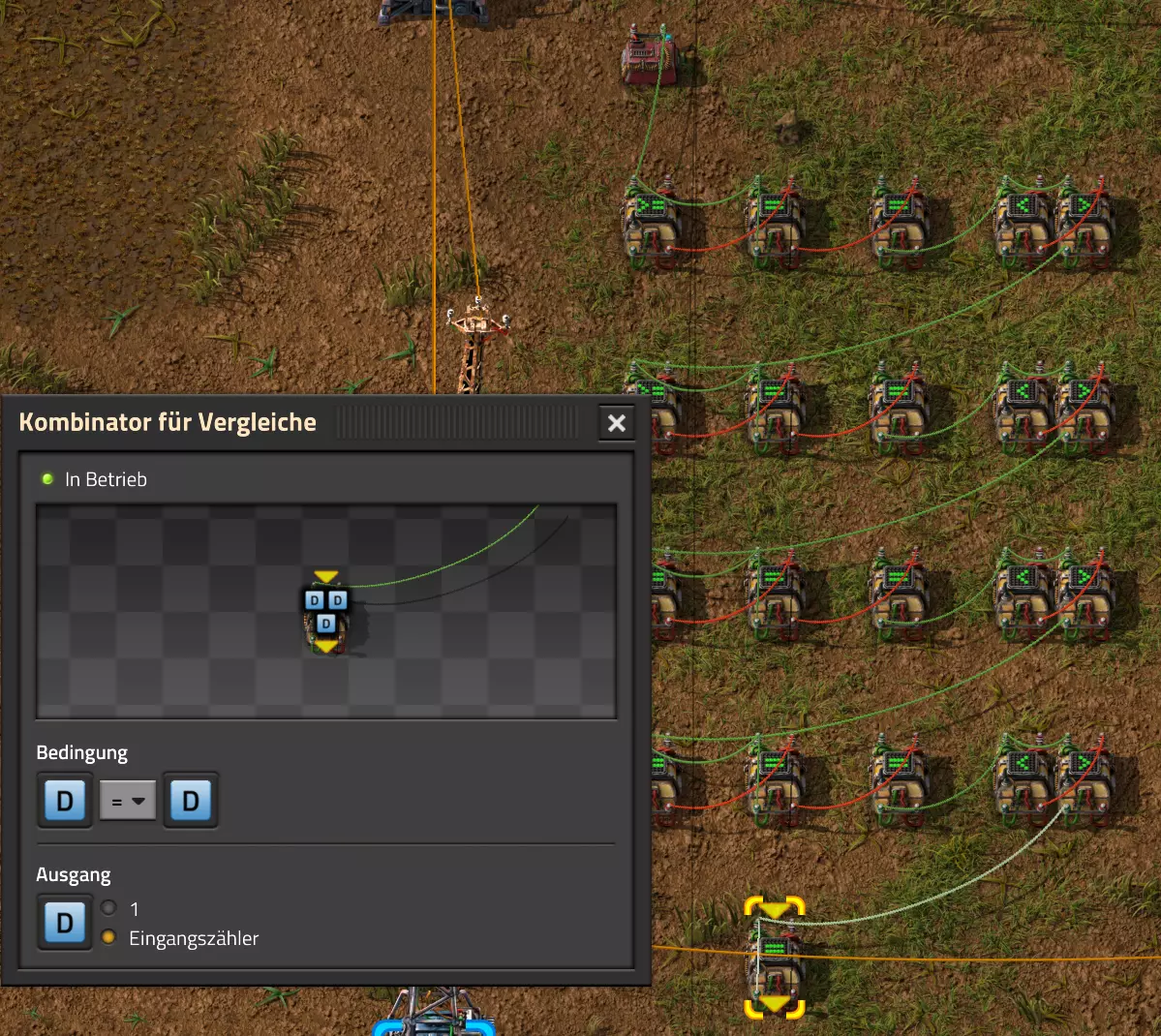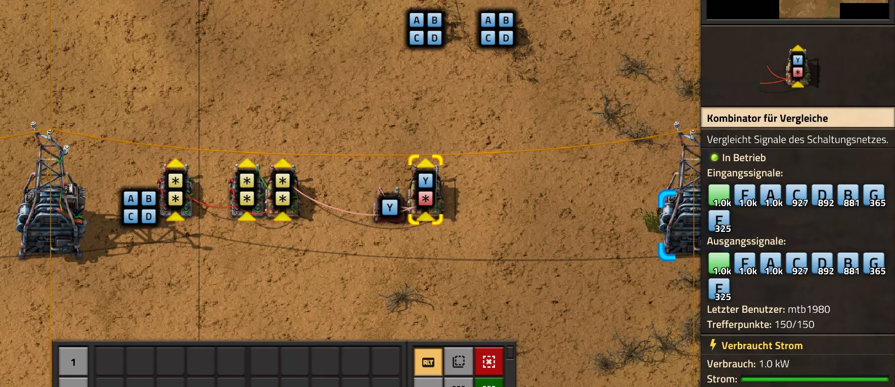 Nachtrag zur Blaupause: Ich hatte mich schon gefreut, dass der Code der Blaupause hier reingepasst hätte. Wenn der unsinnige Steam-Schimpfwortfilter in den Guides nicht mal wieder zugeschlagen hätte. Einige Passagen wurden mit Herzchen ersetzt -.- Daher auch hier wieder der Link zu einem Google-Doc: https://docs.google.com/document/d/1kGbdtH0igx5T_QMFc8MOjfhNyeQ3IJ4LIqh8s_tC6vk/edit?usp=sharing Video: Display-Schaltungen Video: Angepasste Display-Schaltung für Spielzeitanzeige Ich habe das Netz weiter nach Ideen durchforstet und stieß auf ein Video, bei dem es um die Anzeige der eigentlichen Spielzeit ging. Daher hab ich das kurzerhand übernommen, mein Video findest Du hier: In meinem Video verwende ich eine von mir veröffentlichte Tabelle, diese kannst Du hier herunterladen: https://1drv.ms/x/s!AoXhJ5_uZEt1j5VJFk91u9ZqoSAuEg?e=Tzx3tL Das Originalvideo war von Azorae mit dem Titel "Factorio - How to make a Digital Display and Game Clock", hier das Originalvideo: Guide-Playlist PlaylistBeachte bitte folgendes: Playlists werden von Steam nicht korrekt im Steam-Browser übertragen (beziehungsweise auf der Steam-Website nicht korrekt abgespielt): es wird immer nur das erste Video abgespielt. Öffne daher die Playlist in einem richtigen Browser nach Wahl. Die komplette YouTube-Playlist findest Du hier: https://www.youtube.com/watch?v=M8p5x1Z5Gdo&list=PLHcncrCCN2W5VAeaeb2bESmjmVw0klAli Einzel-Video-AufstellungFür die reinen Steam-User hier nochmal alle Einzelvideos aufgereiht; soweit ich das mitbekommen hab, kann Steam keine Playlists abspielen: (Update 2024: Änderungen seit meiner Basisversion des Guides) (Zusatz: Erz- und Ölfeld-Alarme wenn leer) (#6) (#8) (#12) Projekte: (Zusatzvideo zu Bahnübergänge) (Zusatzvideo zu Tankbefüllungen) (Ölverarbeitung) (Forschungsanlage 2 v3) (Forschungsanlage 3 v1) (Robo-Fertigung) Zeitschaltungs-Videos: (Einleitung zu Ticks) (Zeitschaltung bauen: Tage, Stunden, Minuten, Sekunden) (Berechnung und Hilfe zur Bitmaske, Vorbereitung für Displayschaltung) Dazugehörige Microsoft Excel Arbeitsmappe: https://1drv.ms/x/s!AoXhJ5_uZEt1j5VEGjgfHBEaet2vJw (Video zur Displayschaltung und verschiedene Anwendungen) (Displayschaltung mit echter Spielzeitanzeige) Versionsänderungen 11/2024:Neue Inhalte: Abschnitt für Forschungsanlage 3 (v1) eingebaut, speziell an "Space Age" DLC angepasst Video zu Forschungsanlage 3 (v1) eingebaut Video zu neuen Schaltungselementen eingebaut, welche seit der Guide-Erstellung dazugekommen sind Inhalte angepasst: Information bezüglich der neuen Funktionen seit der Guide-Erstellung bei verschiedenen, bisher bestehenden Kombinatoren eingebaut 06/2022:Neue Inhalte: Video zu angepassten Displays angefügt - die echte Spielzeit anzeigen Zusatzvideo zu Bahnübergängen eingebaut Neuen Abschnitt für Erzabbau-Infos eingebaut, enthält nur Video und keine schriftliche Anleitung. Grüße gehen raus an @Sneak0r! Video zum Projekt "Displayschaltung" eingefügt: Displays Video von SeeNo zu "Forschung 1" eingefügt (seine Idee!) Videos zum Projekt "Displayschaltung" eingefügt: Referenzschaltung (inkl. Support-Material) Video "Zeitzähler-Schaltung" eingefügt Video "Einleitung Ticks" eingefügt Video zum Projekt "Robo-Fertigung" eingefügt Video zum Projekt "Forschung 2 (v3)" eingefügt Video zum Projekt "Ölverarbeitung" eingefügt Neuer Abschnitt: "Da fehlt noch was?" eingebaut, direkt über den Kommentaren Inhalte angepasst: Hinweis auf SeeNo's Video zur Forschung 1 im Einleitungstext zum Abschnitt eingefügt Versionsänderung überarbeitet: Anzeige auf Monatsblöcke umgestellt 05/2022:Neue Inhalte: Video über dem Ölverarbeitungsbeispiel eingefügt, warum ich bei Tanks immer den Durchschnitt rechne 08/2021:Neue Inhalte: Video zur Füllstandsanzeige Spezial eingebaut (Beispiel Lampen Füllstandsanzeige) Video zur FlipFlop-/RS-/SR-Schaltung eingebaut (Auto-Abschaltung) Inhalte angepasst: Bei den YouTube-Videos die Kommentar-Funktion aktiviert 07/2021:Neue Inhalte: Video zu Lautsprecher und Alarmen eingebautVideo zur Einstellung von Filtergreifarmen eingebaut Video zu den Basis-Kombinatoren erstellt Video zu den Stern-Variablen erstellt Video zu Greifarm-Einstellungen und Lampen erstellt Video-Playlist für alle Guide-Videos eingesetzt Neuen Bereich zu Ansichtsoptionen in Factorio nach dem vergleichenden Kombinator eingefügt Video zur Einleitung bereitgestellt Neue Beispiele eingefügt: Automatisierte, teilintelligente Roboter-Fertigung eingebaut Neue Beispiele eingefügt: Display-Stückzahl-Anzeige (groß) eingebaut Timer-Anzeige hh:mm:ss (kompakt) eingebaut Bahnübergänge sichern Abschnitt über Detailinfo zu den Gruppenvariablen hinzugefügtVorwort ergänzt: Neuen Abschnitt angelegt mit Hinweis, dass nicht jedes Problem mit einer Schaltung optimal gelöst werden sollte ;) Beispiele für verschiedene Forschungskomplexe eingebaut SR-Latch (Flipflop) Schaltung hinzugefügt -> Anlagenteile abschalten Inhalte angepasst: Einige Rechtschreib- und Satzfehler behoben Einleitung ergänzt Playlist-Abschnitt überarbeitet, im Steam-Guide lässt sich keine Playlist direkt abspielen. Daher zusätzlich alle bisherigen Einzelvideos zusätzlich einzeln nochmal angeführt Hinweis zu Bildern in der Einleitung hinzugefügt (Bild-Collagen) Überschriften der Beispiele umgeschrieben und gekürzt für bessere Lesbarkeit in der Seitenspalte Mehrere Rechtschreibfehler korrigiert, Einleitungsabsatz mit Splitter-Beispiel überarbeitet Einige Materialwortfehler ersetzt (habe ab und an Rohöl statt Schweröl geschrieben) Übersicht bei Versionsänderungen neu aufgebaut 06/2021:Neue Inhalte: Abschnitt für Zeitschaltung eingebaut Filtereinstellung eingebaut Beispielprojekt Kisten gleichmäßig befüllen eingebaut Abschnitt für verbesserte Ölversorgung fertiggestellt Lampen-Schaltungen fertiggestellt Beleuchtungsskala für Füllstände (Projektbeispiele) eingebaut Beispiele für Hinweismitteilungen eingebaut Miditorio-Abschnitt (Musik in Factorio) eingesetzt G