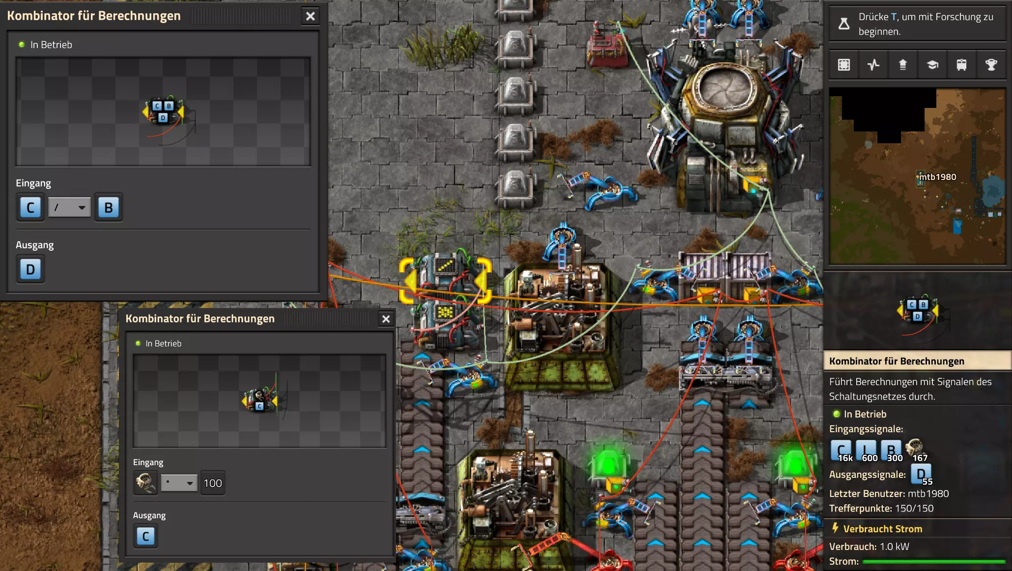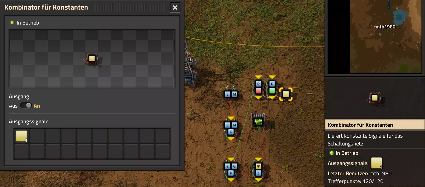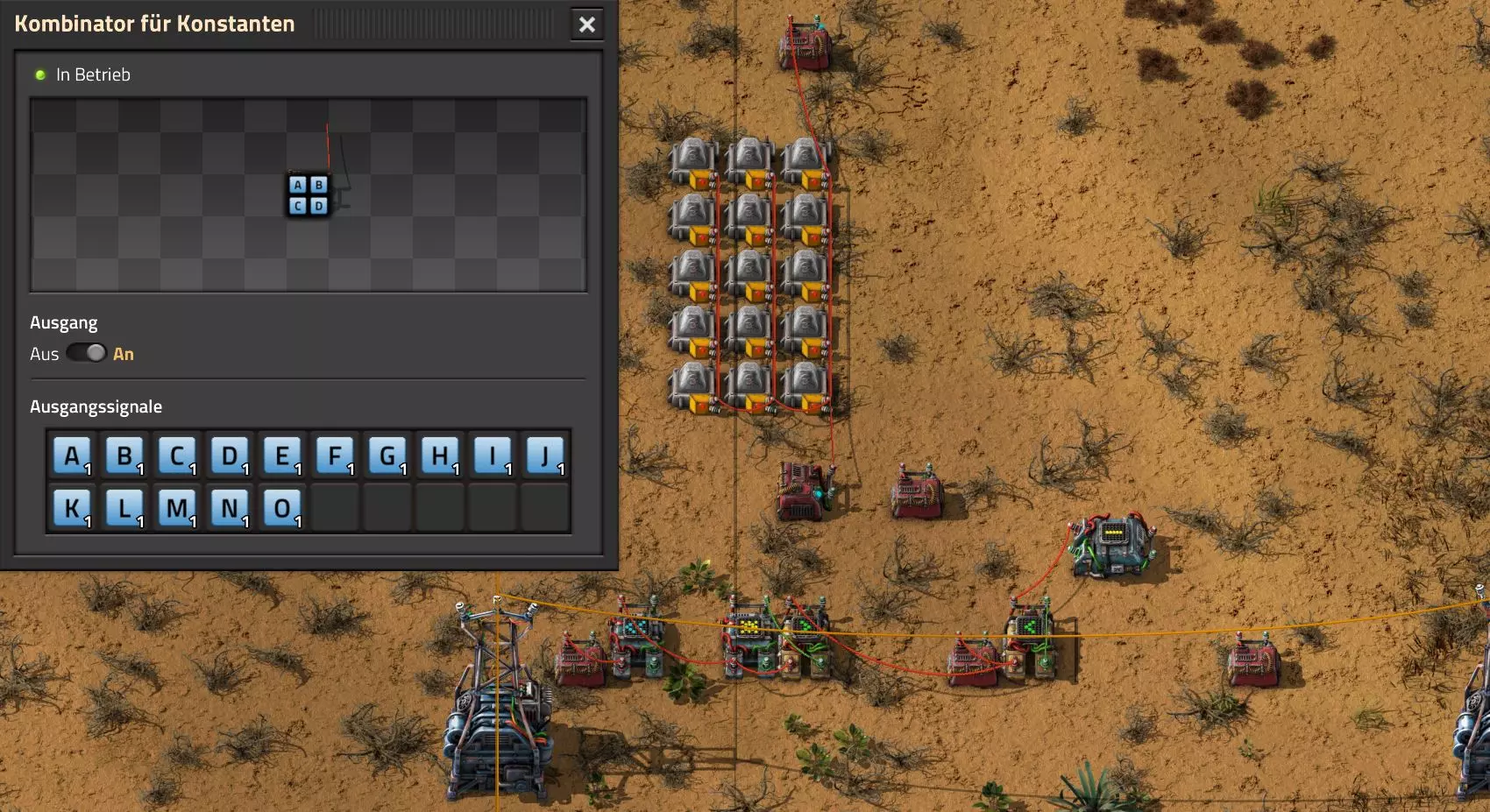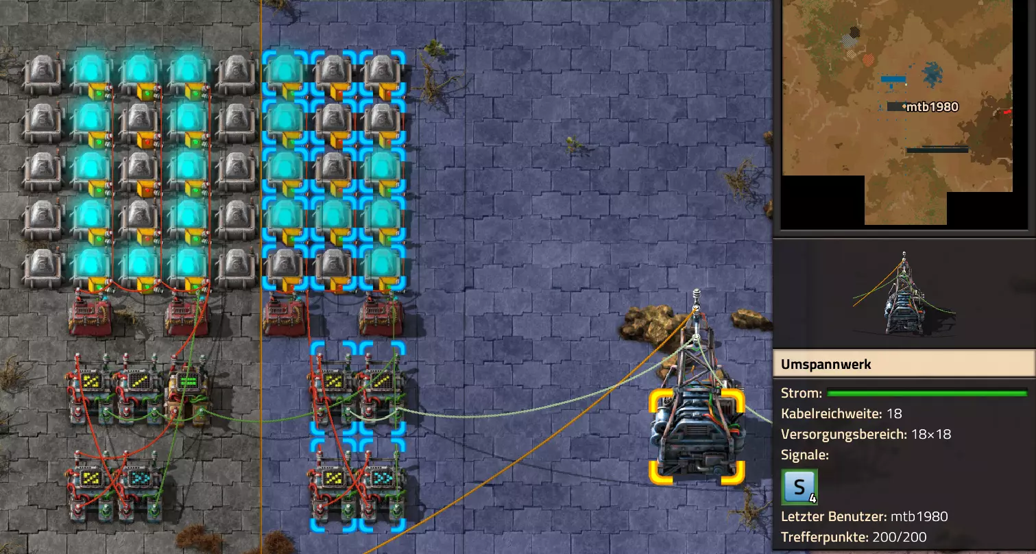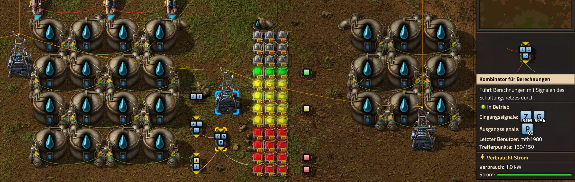 Nachtrag zur Blaupause: Ich hatte mich schon gefreut, dass der Code der Blaupause hier reingepasst hätte. Wenn der unsinnige Steam-Schimpfwortfilter in den Guides nicht mal wieder zugeschlagen hätte. Einige Passagen wurden mit Herzchen ersetzt -.- Daher auch hier wieder der Link zu einem Google-Doc: https://docs.google.com/document/d/1kGbdtH0igx5T_QMFc8MOjfhNyeQ3IJ4LIqh8s_tC6vk/edit?usp=sharing Video: Display-Schaltungen Video: Angepasste Display-Schaltung für Spielzeitanzeige Ich habe das Netz weiter nach Ideen durchforstet und stieß auf ein Video, bei dem es um die Anzeige der eigentlichen Spielzeit ging. Daher hab ich das kurzerhand übernommen, mein Video findest Du hier: In meinem Video verwende ich eine von mir veröffentlichte Tabelle, diese kannst Du hier herunterladen: https://1drv.ms/x/s!AoXhJ5_uZEt1j5VJFk91u9ZqoSAuEg?e=Tzx3tL Das Originalvideo war von Azorae mit dem Titel "Factorio - How to make a Digital Display and Game Clock", hier das Originalvideo: Guide-Playlist PlaylistBeachte bitte folgendes: Playlists werden von Steam nicht korrekt im Steam-Browser übertragen (beziehungsweise auf der Steam-Website nicht korrekt abgespielt): es wird immer nur das erste Video abgespielt. Öffne daher die Playlist in einem richtigen Browser nach Wahl. Die komplette YouTube-Playlist findest Du hier: https://www.youtube.com/watch?v=M8p5x1Z5Gdo&list=PLHcncrCCN2W5VAeaeb2bESmjmVw0klAli Einzel-Video-AufstellungFür die reinen Steam-User hier nochmal alle Einzelvideos aufgereiht; soweit ich das mitbekommen hab, kann Steam keine Playlists abspielen: (Update 2024: Änderungen seit meiner Basisversion des Guides) (Zusatz: Erz- und Ölfeld-Alarme wenn leer) (#6) (#8) (#12) Projekte: (Zusatzvideo zu Bahnübergänge) (Zusatzvideo zu Tankbefüllungen) (Ölverarbeitung) (Forschungsanlage 2 v3) (Forschungsanlage 3 v1) (Robo-Fertigung) Zeitschaltungs-Videos: (Einleitung zu Ticks) (Zeitschaltung bauen: Tage, Stunden, Minuten, Sekunden) (Berechnung und Hilfe zur Bitmaske, Vorbereitung für Displayschaltung) Dazugehörige Microsoft Excel Arbeitsmappe: https://1drv.ms/x/s!AoXhJ5_uZEt1j5VEGjgfHBEaet2vJw (Video zur Displayschaltung und verschiedene Anwendungen) (Displayschaltung mit echter Spielzeitanzeige) Versionsänderungen 11/2024:Neue Inhalte: Abschnitt für Forschungsanlage 3 (v1) eingebaut, speziell an "Space Age" DLC angepasst Video zu Forschungsanlage 3 (v1) eingebaut Video zu neuen Schaltungselementen eingebaut, welche seit der Guide-Erstellung dazugekommen sind Inhalte angepasst: Information bezüglich der neuen Funktionen seit der Guide-Erstellung bei verschiedenen, bisher bestehenden Kombinatoren eingebaut 06/2022:Neue Inhalte: Video zu angepassten Displays angefügt - die echte Spielzeit anzeigen Zusatzvideo zu Bahnübergängen eingebaut Neuen Abschnitt für Erzabbau-Infos eingebaut, enthält nur Video und keine schriftliche Anleitung. Grüße gehen raus an @Sneak0r! Video zum Projekt "Displayschaltung" eingefügt: Displays Video von SeeNo zu "Forschung 1" eingefügt (seine Idee!) Videos zum Projekt "Displayschaltung" eingefügt: Referenzschaltung (inkl. Support-Material) Video "Zeitzähler-Schaltung" eingefügt Video "Einleitung Ticks" eingefügt Video zum Projekt "Robo-Fertigung" eingefügt Video zum Projekt "Forschung 2 (v3)" eingefügt Video zum Projekt "Ölverarbeitung" eingefügt Neuer Abschnitt: "Da fehlt noch was?" eingebaut, direkt über den Kommentaren Inhalte angepasst: Hinweis auf SeeNo's Video zur Forschung 1 im Einleitungstext zum Abschnitt eingefügt Versionsänderung überarbeitet: Anzeige auf Monatsblöcke umgestellt 05/2022:Neue Inhalte: Video über dem Ölverarbeitungsbeispiel eingefügt, warum ich bei Tanks immer den Durchschnitt rechne 08/2021:Neue Inhalte: Video zur Füllstandsanzeige Spezial eingebaut (Beispiel Lampen Füllstandsanzeige) Video zur FlipFlop-/RS-/SR-Schaltung eingebaut (Auto-Abschaltung) Inhalte angepasst: Bei den YouTube-Videos die Kommentar-Funktion aktiviert 07/2021:Neue Inhalte: Video zu Lautsprecher und Alarmen eingebautVideo zur Einstellung von Filtergreifarmen eingebaut Video zu den Basis-Kombinatoren erstellt Video zu den Stern-Variablen erstellt Video zu Greifarm-Einstellungen und Lampen erstellt Video-Playlist für alle Guide-Videos eingesetzt Neuen Bereich zu Ansichtsoptionen in Factorio nach dem vergleichenden Kombinator eingefügt Video zur Einleitung bereitgestellt Neue Beispiele eingefügt: Automatisierte, teilintelligente Roboter-Fertigung eingebaut Neue Beispiele eingefügt: Display-Stückzahl-Anzeige (groß) eingebaut Timer-Anzeige hh:mm:ss (kompakt) eingebaut Bahnübergänge sichern Abschnitt über Detailinfo zu den Gruppenvariablen hinzugefügtVorwort ergänzt: Neuen Abschnitt angelegt mit Hinweis, dass nicht jedes Problem mit einer Schaltung optimal gelöst werden sollte ;) Beispiele für verschiedene Forschungskomplexe eingebaut SR-Latch (Flipflop) Schaltung hinzugefügt -> Anlagenteile abschalten Inhalte angepasst: Einige Rechtschreib- und Satzfehler behoben Einleitung ergänzt Playlist-Abschnitt überarbeitet, im Steam-Guide lässt sich keine Playlist direkt abspielen. Daher zusätzlich alle bisherigen Einzelvideos zusätzlich einzeln nochmal angeführt Hinweis zu Bildern in der Einleitung hinzugefügt (Bild-Collagen) Überschriften der Beispiele umgeschrieben und gekürzt für bessere Lesbarkeit in der Seitenspalte Mehrere Rechtschreibfehler korrigiert, Einleitungsabsatz mit Splitter-Beispiel überarbeitet Einige Materialwortfehler ersetzt (habe ab und an Rohöl statt Schweröl geschrieben) Übersicht bei Versionsänderungen neu aufgebaut 06/2021:Neue Inhalte: Abschnitt für Zeitschaltung eingebaut Filtereinstellung eingebaut Beispielprojekt Kisten gleichmäßig befüllen eingebaut Abschnitt für verbesserte Ölversorgung fertiggestellt Lampen-Schaltungen fertiggestellt Beleuchtungsskala für Füllstände (Projektbeispiele) eingebaut Beispiele für Hinweismitteilungen eingebaut Miditorio-Abschnitt (Musik in Factorio) eingesetzt G