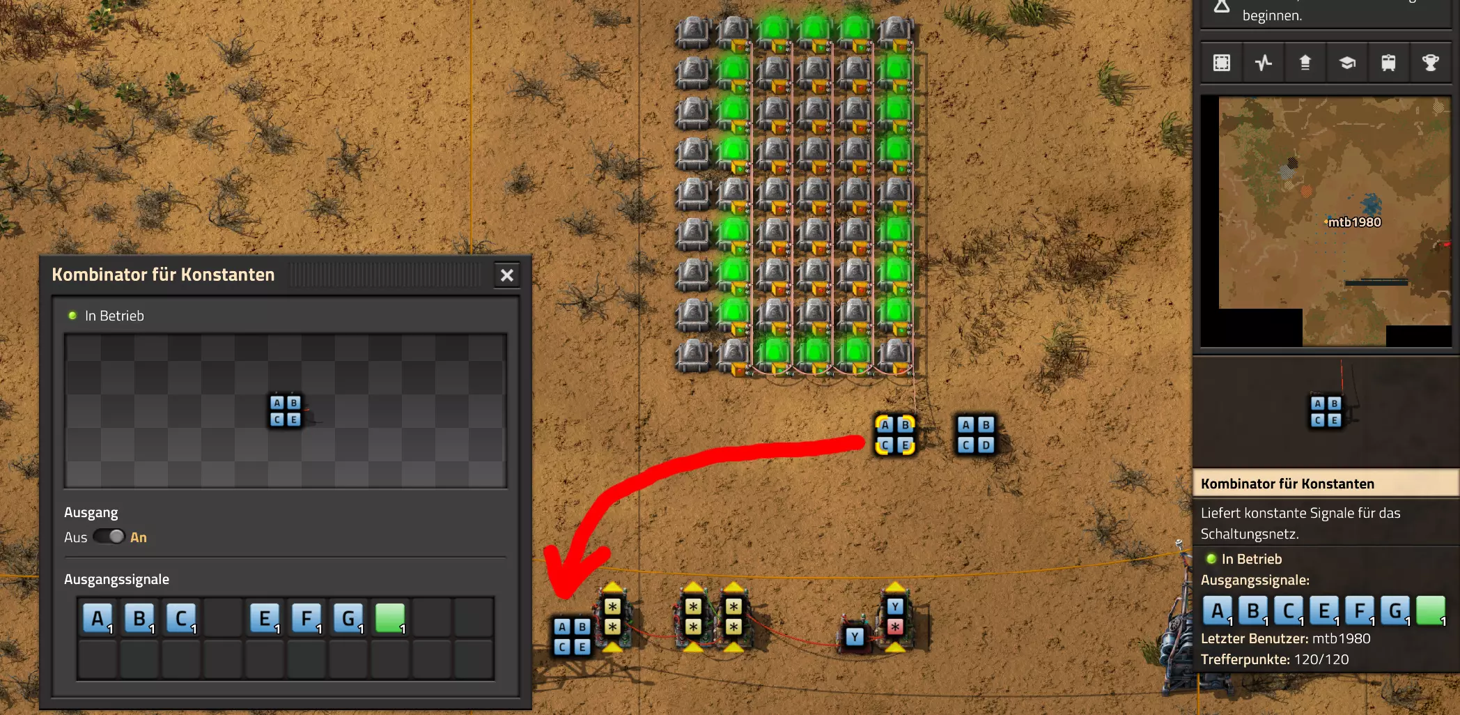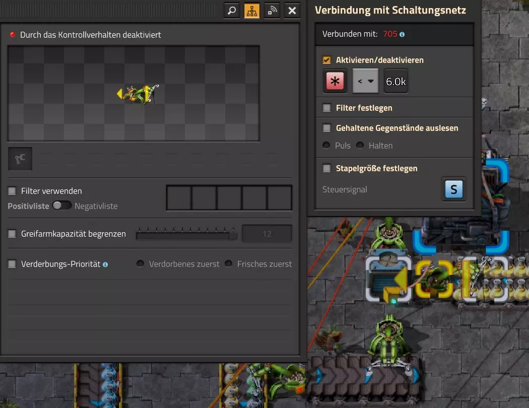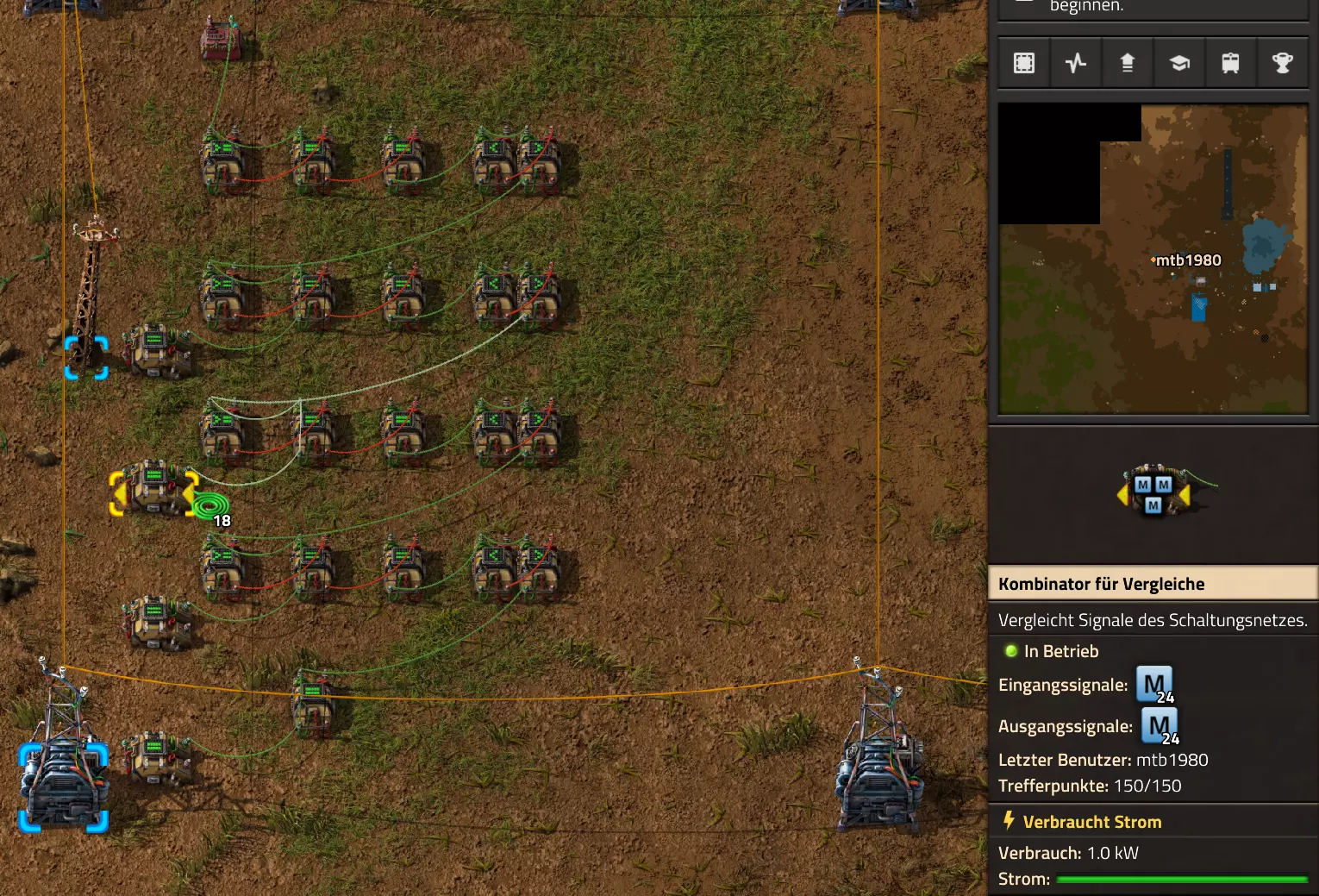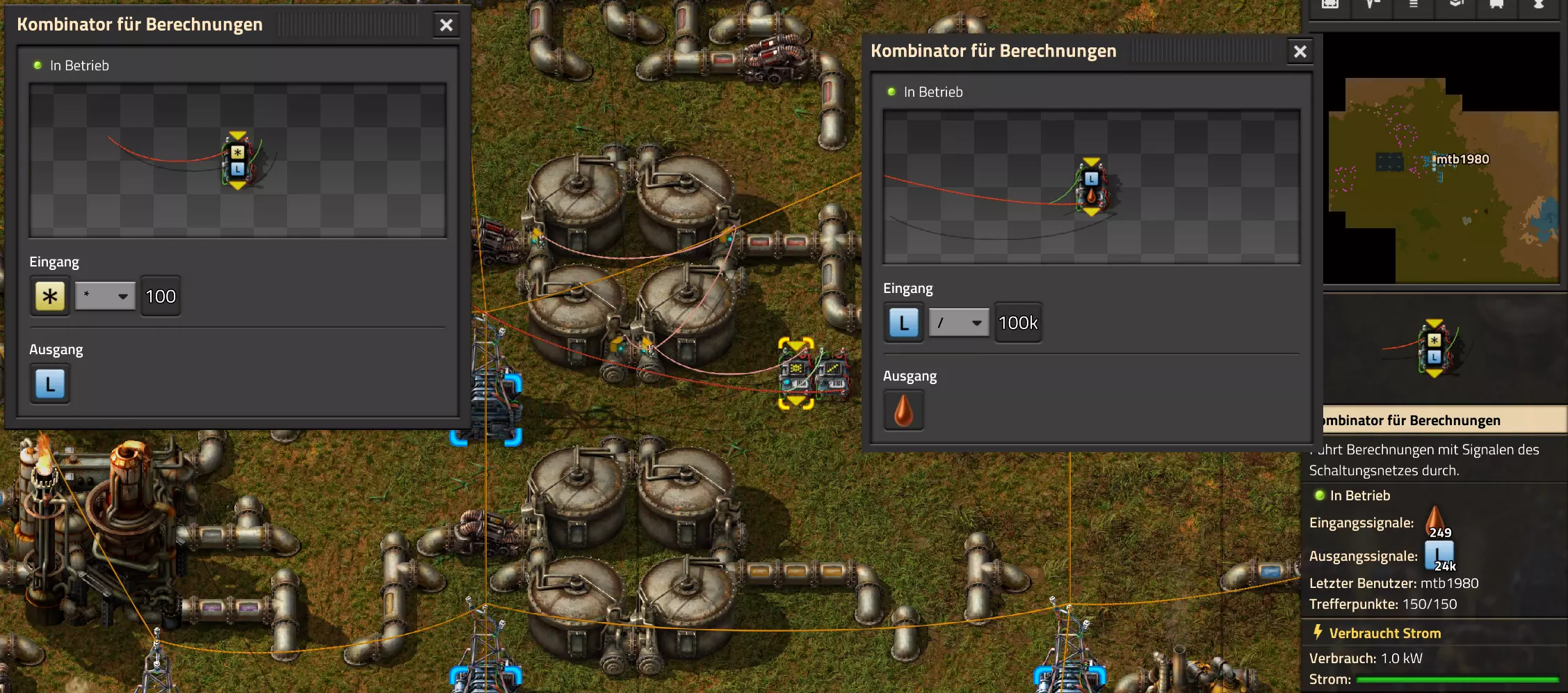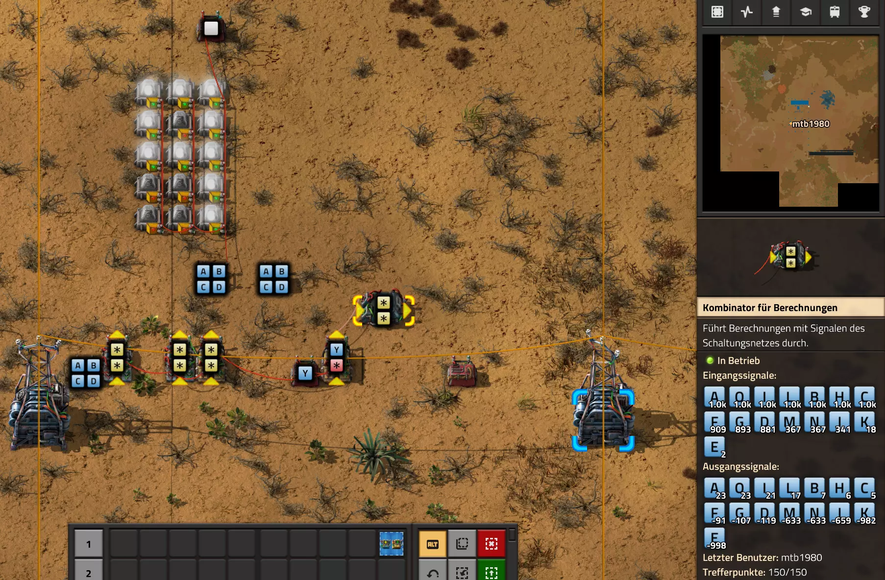 Nachtrag zur Blaupause: Ich hatte mich schon gefreut, dass der Code der Blaupause hier reingepasst hätte. Wenn der unsinnige Steam-Schimpfwortfilter in den Guides nicht mal wieder zugeschlagen hätte. Einige Passagen wurden mit Herzchen ersetzt -.- Daher auch hier wieder der Link zu einem Google-Doc: https://docs.google.com/document/d/1kGbdtH0igx5T_QMFc8MOjfhNyeQ3IJ4LIqh8s_tC6vk/edit?usp=sharing Video: Display-Schaltungen Video: Angepasste Display-Schaltung für Spielzeitanzeige Ich habe das Netz weiter nach Ideen durchforstet und stieß auf ein Video, bei dem es um die Anzeige der eigentlichen Spielzeit ging. Daher hab ich das kurzerhand übernommen, mein Video findest Du hier: In meinem Video verwende ich eine von mir veröffentlichte Tabelle, diese kannst Du hier herunterladen: https://1drv.ms/x/s!AoXhJ5_uZEt1j5VJFk91u9ZqoSAuEg?e=Tzx3tL Das Originalvideo war von Azorae mit dem Titel "Factorio - How to make a Digital Display and Game Clock", hier das Originalvideo: Guide-Playlist PlaylistBeachte bitte folgendes: Playlists werden von Steam nicht korrekt im Steam-Browser übertragen (beziehungsweise auf der Steam-Website nicht korrekt abgespielt): es wird immer nur das erste Video abgespielt. Öffne daher die Playlist in einem richtigen Browser nach Wahl. Die komplette YouTube-Playlist findest Du hier: https://www.youtube.com/watch?v=M8p5x1Z5Gdo&list=PLHcncrCCN2W5VAeaeb2bESmjmVw0klAli Einzel-Video-AufstellungFür die reinen Steam-User hier nochmal alle Einzelvideos aufgereiht; soweit ich das mitbekommen hab, kann Steam keine Playlists abspielen: (Update 2024: Änderungen seit meiner Basisversion des Guides) (Zusatz: Erz- und Ölfeld-Alarme wenn leer) (#6) (#8) (#12) Projekte: (Zusatzvideo zu Bahnübergänge) (Zusatzvideo zu Tankbefüllungen) (Ölverarbeitung) (Forschungsanlage 2 v3) (Forschungsanlage 3 v1) (Robo-Fertigung) Zeitschaltungs-Videos: (Einleitung zu Ticks) (Zeitschaltung bauen: Tage, Stunden, Minuten, Sekunden) (Berechnung und Hilfe zur Bitmaske, Vorbereitung für Displayschaltung) Dazugehörige Microsoft Excel Arbeitsmappe: https://1drv.ms/x/s!AoXhJ5_uZEt1j5VEGjgfHBEaet2vJw (Video zur Displayschaltung und verschiedene Anwendungen) (Displayschaltung mit echter Spielzeitanzeige) Versionsänderungen 11/2024:Neue Inhalte: Abschnitt für Forschungsanlage 3 (v1) eingebaut, speziell an "Space Age" DLC angepasst Video zu Forschungsanlage 3 (v1) eingebaut Video zu neuen Schaltungselementen eingebaut, welche seit der Guide-Erstellung dazugekommen sind Inhalte angepasst: Information bezüglich der neuen Funktionen seit der Guide-Erstellung bei verschiedenen, bisher bestehenden Kombinatoren eingebaut 06/2022:Neue Inhalte: Video zu angepassten Displays angefügt - die echte Spielzeit anzeigen Zusatzvideo zu Bahnübergängen eingebaut Neuen Abschnitt für Erzabbau-Infos eingebaut, enthält nur Video und keine schriftliche Anleitung. Grüße gehen raus an @Sneak0r! Video zum Projekt "Displayschaltung" eingefügt: Displays Video von SeeNo zu "Forschung 1" eingefügt (seine Idee!) Videos zum Projekt "Displayschaltung" eingefügt: Referenzschaltung (inkl. Support-Material) Video "Zeitzähler-Schaltung" eingefügt Video "Einleitung Ticks" eingefügt Video zum Projekt "Robo-Fertigung" eingefügt Video zum Projekt "Forschung 2 (v3)" eingefügt Video zum Projekt "Ölverarbeitung" eingefügt Neuer Abschnitt: "Da fehlt noch was?" eingebaut, direkt über den Kommentaren Inhalte angepasst: Hinweis auf SeeNo's Video zur Forschung 1 im Einleitungstext zum Abschnitt eingefügt Versionsänderung überarbeitet: Anzeige auf Monatsblöcke umgestellt 05/2022:Neue Inhalte: Video über dem Ölverarbeitungsbeispiel eingefügt, warum ich bei Tanks immer den Durchschnitt rechne 08/2021:Neue Inhalte: Video zur Füllstandsanzeige Spezial eingebaut (Beispiel Lampen Füllstandsanzeige) Video zur FlipFlop-/RS-/SR-Schaltung eingebaut (Auto-Abschaltung) Inhalte angepasst: Bei den YouTube-Videos die Kommentar-Funktion aktiviert 07/2021:Neue Inhalte: Video zu Lautsprecher und Alarmen eingebautVideo zur Einstellung von Filtergreifarmen eingebaut Video zu den Basis-Kombinatoren erstellt Video zu den Stern-Variablen erstellt Video zu Greifarm-Einstellungen und Lampen erstellt Video-Playlist für alle Guide-Videos eingesetzt Neuen Bereich zu Ansichtsoptionen in Factorio nach dem vergleichenden Kombinator eingefügt Video zur Einleitung bereitgestellt Neue Beispiele eingefügt: Automatisierte, teilintelligente Roboter-Fertigung eingebaut Neue Beispiele eingefügt: Display-Stückzahl-Anzeige (groß) eingebaut Timer-Anzeige hh:mm:ss (kompakt) eingebaut Bahnübergänge sichern Abschnitt über Detailinfo zu den Gruppenvariablen hinzugefügtVorwort ergänzt: Neuen Abschnitt angelegt mit Hinweis, dass nicht jedes Problem mit einer Schaltung optimal gelöst werden sollte ;) Beispiele für verschiedene Forschungskomplexe eingebaut SR-Latch (Flipflop) Schaltung hinzugefügt -> Anlagenteile abschalten Inhalte angepasst: Einige Rechtschreib- und Satzfehler behoben Einleitung ergänzt Playlist-Abschnitt überarbeitet, im Steam-Guide lässt sich keine Playlist direkt abspielen. Daher zusätzlich alle bisherigen Einzelvideos zusätzlich einzeln nochmal angeführt Hinweis zu Bildern in der Einleitung hinzugefügt (Bild-Collagen) Überschriften der Beispiele umgeschrieben und gekürzt für bessere Lesbarkeit in der Seitenspalte Mehrere Rechtschreibfehler korrigiert, Einleitungsabsatz mit Splitter-Beispiel überarbeitet Einige Materialwortfehler ersetzt (habe ab und an Rohöl statt Schweröl geschrieben) Übersicht bei Versionsänderungen neu aufgebaut 06/2021:Neue Inhalte: Abschnitt für Zeitschaltung eingebaut Filtereinstellung eingebaut Beispielprojekt Kisten gleichmäßig befüllen eingebaut Abschnitt für verbesserte Ölversorgung fertiggestellt Lampen-Schaltungen fertiggestellt Beleuchtungsskala für Füllstände (Projektbeispiele) eingebaut Beispiele für Hinweismitteilungen eingebaut Miditorio-Abschnitt (Musik in Factorio) eingesetzt G