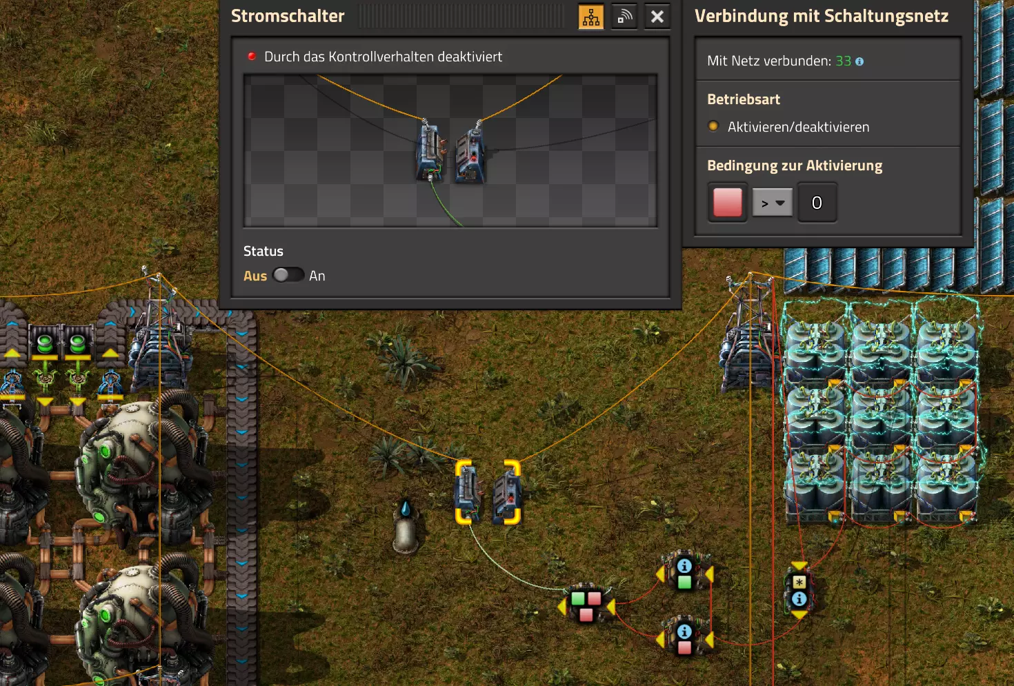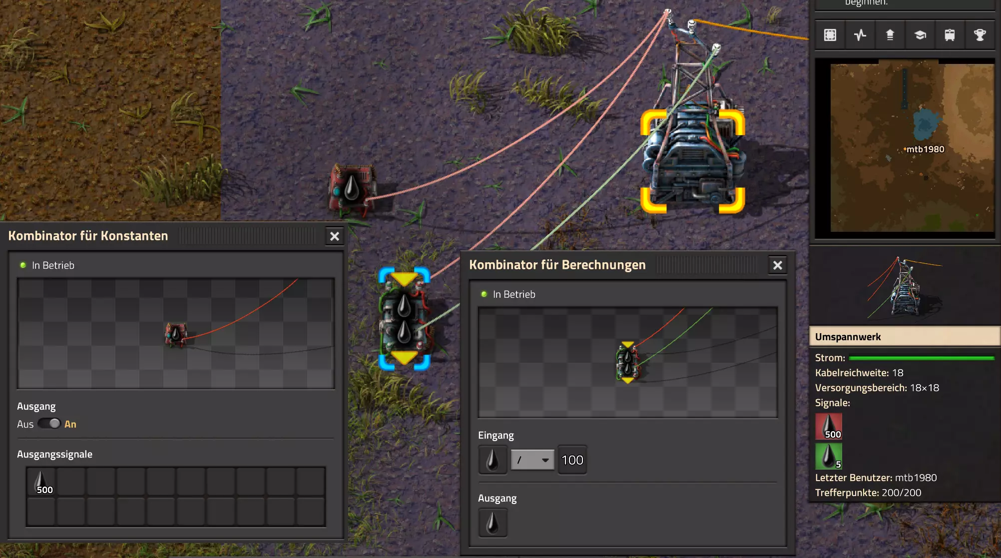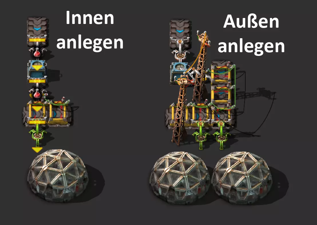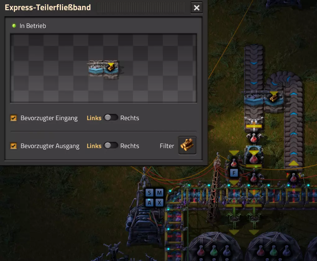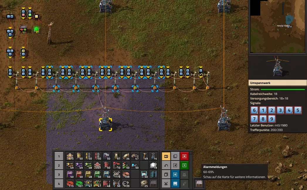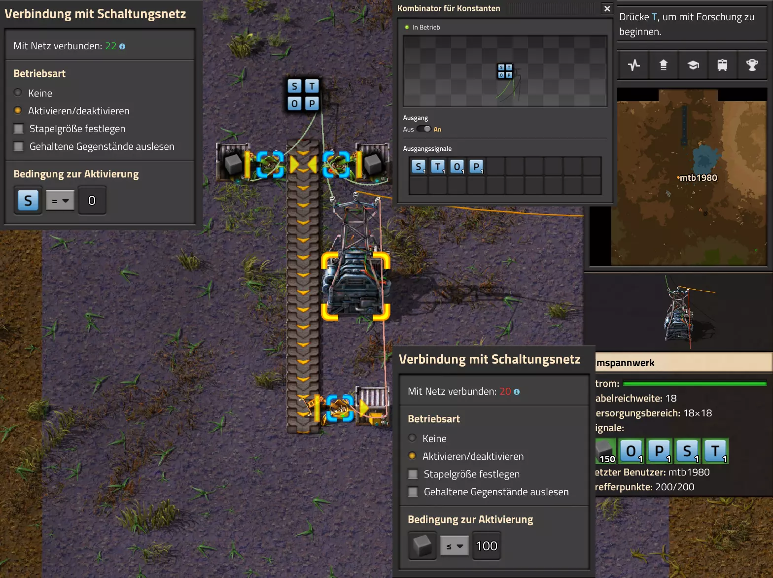 Nachtrag zur Blaupause: Ich hatte mich schon gefreut, dass der Code der Blaupause hier reingepasst hätte. Wenn der unsinnige Steam-Schimpfwortfilter in den Guides nicht mal wieder zugeschlagen hätte. Einige Passagen wurden mit Herzchen ersetzt -.- Daher auch hier wieder der Link zu einem Google-Doc: https://docs.google.com/document/d/1kGbdtH0igx5T_QMFc8MOjfhNyeQ3IJ4LIqh8s_tC6vk/edit?usp=sharing Video: Display-Schaltungen Video: Angepasste Display-Schaltung für Spielzeitanzeige Ich habe das Netz weiter nach Ideen durchforstet und stieß auf ein Video, bei dem es um die Anzeige der eigentlichen Spielzeit ging. Daher hab ich das kurzerhand übernommen, mein Video findest Du hier: In meinem Video verwende ich eine von mir veröffentlichte Tabelle, diese kannst Du hier herunterladen: https://1drv.ms/x/s!AoXhJ5_uZEt1j5VJFk91u9ZqoSAuEg?e=Tzx3tL Das Originalvideo war von Azorae mit dem Titel "Factorio - How to make a Digital Display and Game Clock", hier das Originalvideo: Guide-Playlist PlaylistBeachte bitte folgendes: Playlists werden von Steam nicht korrekt im Steam-Browser übertragen (beziehungsweise auf der Steam-Website nicht korrekt abgespielt): es wird immer nur das erste Video abgespielt. Öffne daher die Playlist in einem richtigen Browser nach Wahl. Die komplette YouTube-Playlist findest Du hier: https://www.youtube.com/watch?v=M8p5x1Z5Gdo&list=PLHcncrCCN2W5VAeaeb2bESmjmVw0klAli Einzel-Video-AufstellungFür die reinen Steam-User hier nochmal alle Einzelvideos aufgereiht; soweit ich das mitbekommen hab, kann Steam keine Playlists abspielen: (Update 2024: Änderungen seit meiner Basisversion des Guides) (Zusatz: Erz- und Ölfeld-Alarme wenn leer) (#6) (#8) (#12) Projekte: (Zusatzvideo zu Bahnübergänge) (Zusatzvideo zu Tankbefüllungen) (Ölverarbeitung) (Forschungsanlage 2 v3) (Forschungsanlage 3 v1) (Robo-Fertigung) Zeitschaltungs-Videos: (Einleitung zu Ticks) (Zeitschaltung bauen: Tage, Stunden, Minuten, Sekunden) (Berechnung und Hilfe zur Bitmaske, Vorbereitung für Displayschaltung) Dazugehörige Microsoft Excel Arbeitsmappe: https://1drv.ms/x/s!AoXhJ5_uZEt1j5VEGjgfHBEaet2vJw (Video zur Displayschaltung und verschiedene Anwendungen) (Displayschaltung mit echter Spielzeitanzeige) Versionsänderungen 11/2024:Neue Inhalte: Abschnitt für Forschungsanlage 3 (v1) eingebaut, speziell an "Space Age" DLC angepasst Video zu Forschungsanlage 3 (v1) eingebaut Video zu neuen Schaltungselementen eingebaut, welche seit der Guide-Erstellung dazugekommen sind Inhalte angepasst: Information bezüglich der neuen Funktionen seit der Guide-Erstellung bei verschiedenen, bisher bestehenden Kombinatoren eingebaut 06/2022:Neue Inhalte: Video zu angepassten Displays angefügt - die echte Spielzeit anzeigen Zusatzvideo zu Bahnübergängen eingebaut Neuen Abschnitt für Erzabbau-Infos eingebaut, enthält nur Video und keine schriftliche Anleitung. Grüße gehen raus an @Sneak0r! Video zum Projekt "Displayschaltung" eingefügt: Displays Video von SeeNo zu "Forschung 1" eingefügt (seine Idee!) Videos zum Projekt "Displayschaltung" eingefügt: Referenzschaltung (inkl. Support-Material) Video "Zeitzähler-Schaltung" eingefügt Video "Einleitung Ticks" eingefügt Video zum Projekt "Robo-Fertigung" eingefügt Video zum Projekt "Forschung 2 (v3)" eingefügt Video zum Projekt "Ölverarbeitung" eingefügt Neuer Abschnitt: "Da fehlt noch was?" eingebaut, direkt über den Kommentaren Inhalte angepasst: Hinweis auf SeeNo's Video zur Forschung 1 im Einleitungstext zum Abschnitt eingefügt Versionsänderung überarbeitet: Anzeige auf Monatsblöcke umgestellt 05/2022:Neue Inhalte: Video über dem Ölverarbeitungsbeispiel eingefügt, warum ich bei Tanks immer den Durchschnitt rechne 08/2021:Neue Inhalte: Video zur Füllstandsanzeige Spezial eingebaut (Beispiel Lampen Füllstandsanzeige) Video zur FlipFlop-/RS-/SR-Schaltung eingebaut (Auto-Abschaltung) Inhalte angepasst: Bei den YouTube-Videos die Kommentar-Funktion aktiviert 07/2021:Neue Inhalte: Video zu Lautsprecher und Alarmen eingebautVideo zur Einstellung von Filtergreifarmen eingebaut Video zu den Basis-Kombinatoren erstellt Video zu den Stern-Variablen erstellt Video zu Greifarm-Einstellungen und Lampen erstellt Video-Playlist für alle Guide-Videos eingesetzt Neuen Bereich zu Ansichtsoptionen in Factorio nach dem vergleichenden Kombinator eingefügt Video zur Einleitung bereitgestellt Neue Beispiele eingefügt: Automatisierte, teilintelligente Roboter-Fertigung eingebaut Neue Beispiele eingefügt: Display-Stückzahl-Anzeige (groß) eingebaut Timer-Anzeige hh:mm:ss (kompakt) eingebaut Bahnübergänge sichern Abschnitt über Detailinfo zu den Gruppenvariablen hinzugefügtVorwort ergänzt: Neuen Abschnitt angelegt mit Hinweis, dass nicht jedes Problem mit einer Schaltung optimal gelöst werden sollte ;) Beispiele für verschiedene Forschungskomplexe eingebaut SR-Latch (Flipflop) Schaltung hinzugefügt -> Anlagenteile abschalten Inhalte angepasst: Einige Rechtschreib- und Satzfehler behoben Einleitung ergänzt Playlist-Abschnitt überarbeitet, im Steam-Guide lässt sich keine Playlist direkt abspielen. Daher zusätzlich alle bisherigen Einzelvideos zusätzlich einzeln nochmal angeführt Hinweis zu Bildern in der Einleitung hinzugefügt (Bild-Collagen) Überschriften der Beispiele umgeschrieben und gekürzt für bessere Lesbarkeit in der Seitenspalte Mehrere Rechtschreibfehler korrigiert, Einleitungsabsatz mit Splitter-Beispiel überarbeitet Einige Materialwortfehler ersetzt (habe ab und an Rohöl statt Schweröl geschrieben) Übersicht bei Versionsänderungen neu aufgebaut 06/2021:Neue Inhalte: Abschnitt für Zeitschaltung eingebaut Filtereinstellung eingebaut Beispielprojekt Kisten gleichmäßig befüllen eingebaut Abschnitt für verbesserte Ölversorgung fertiggestellt Lampen-Schaltungen fertiggestellt Beleuchtungsskala für Füllstände (Projektbeispiele) eingebaut Beispiele für Hinweismitteilungen eingebaut Miditorio-Abschnitt (Musik in Factorio) eingesetzt G