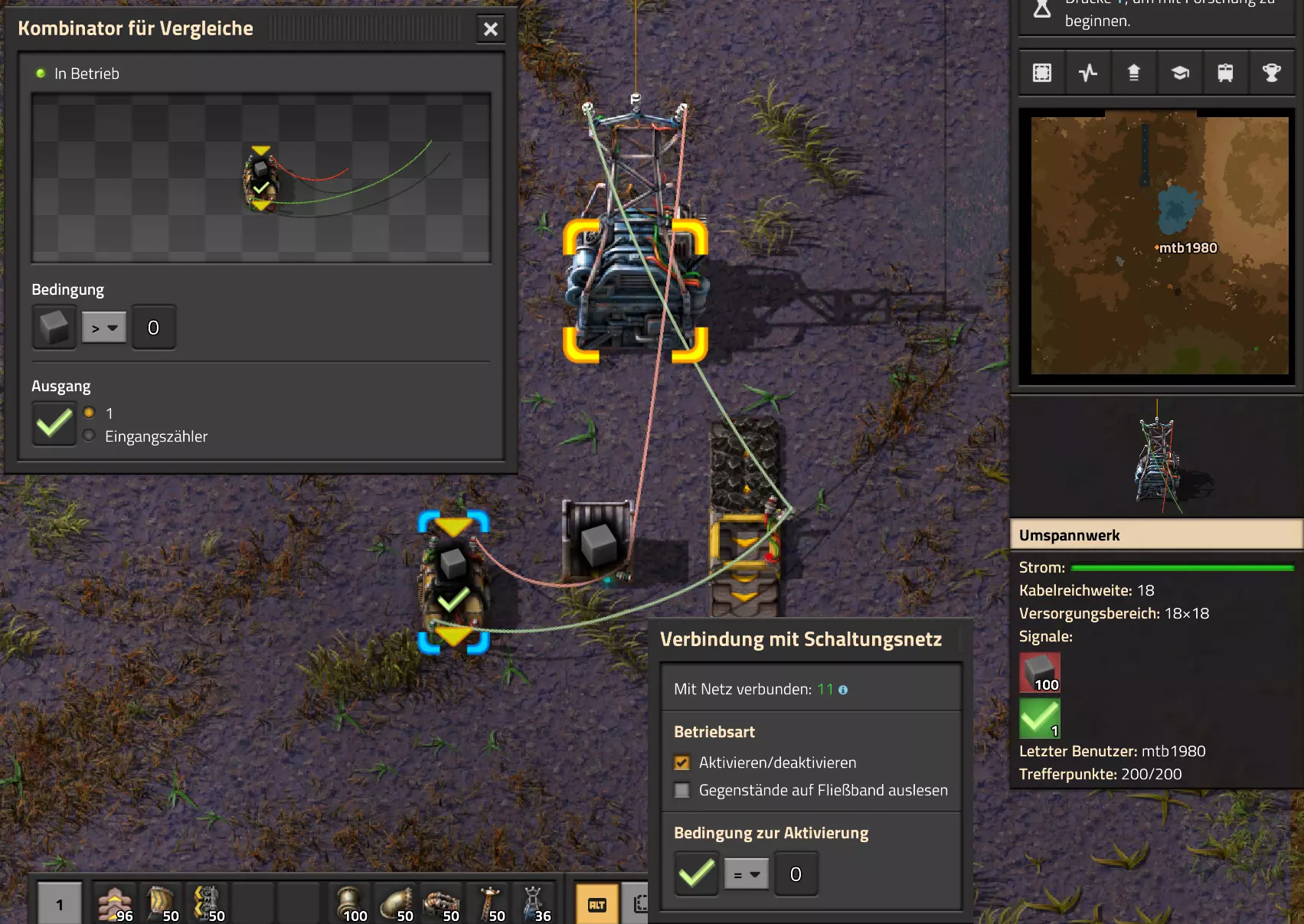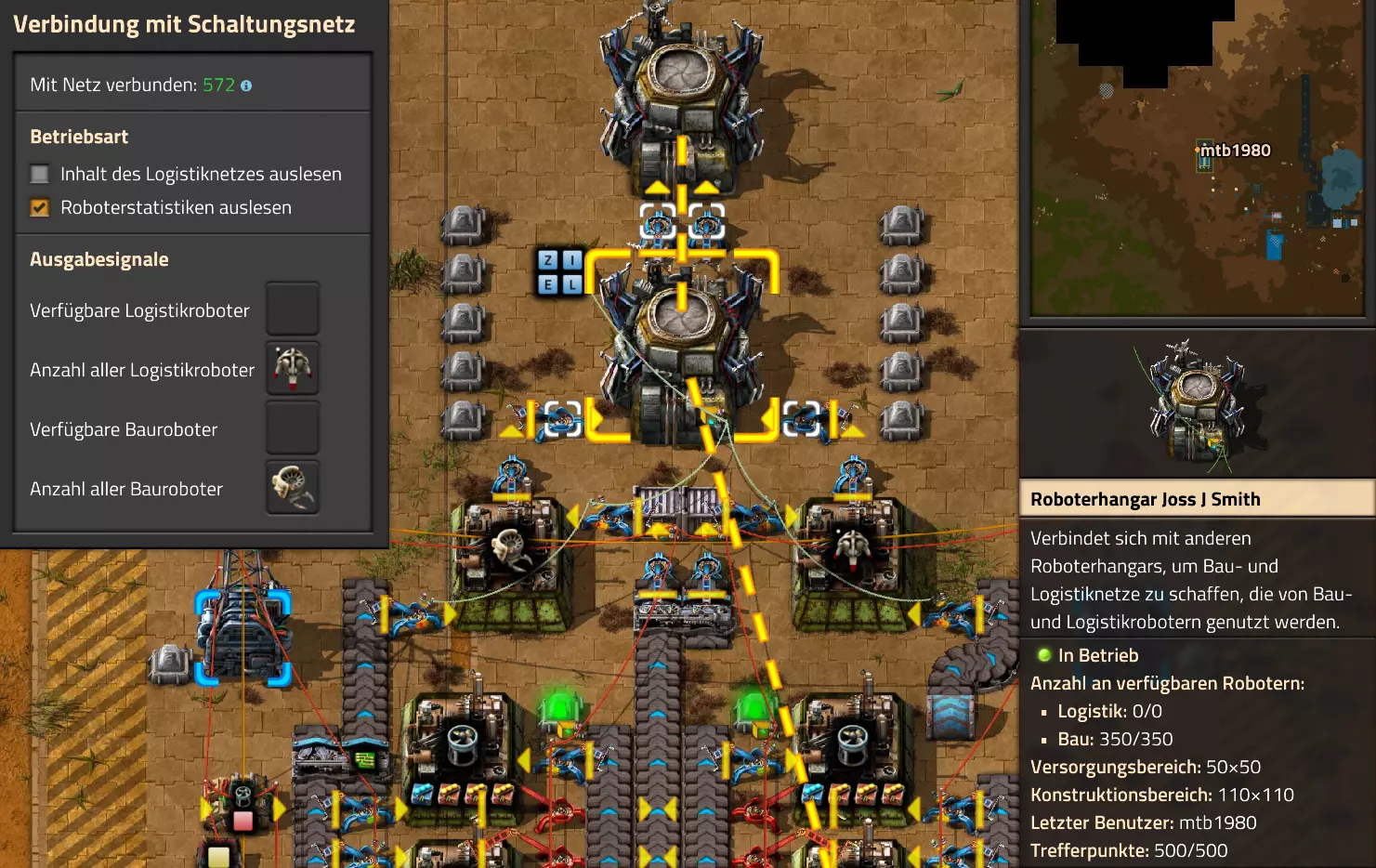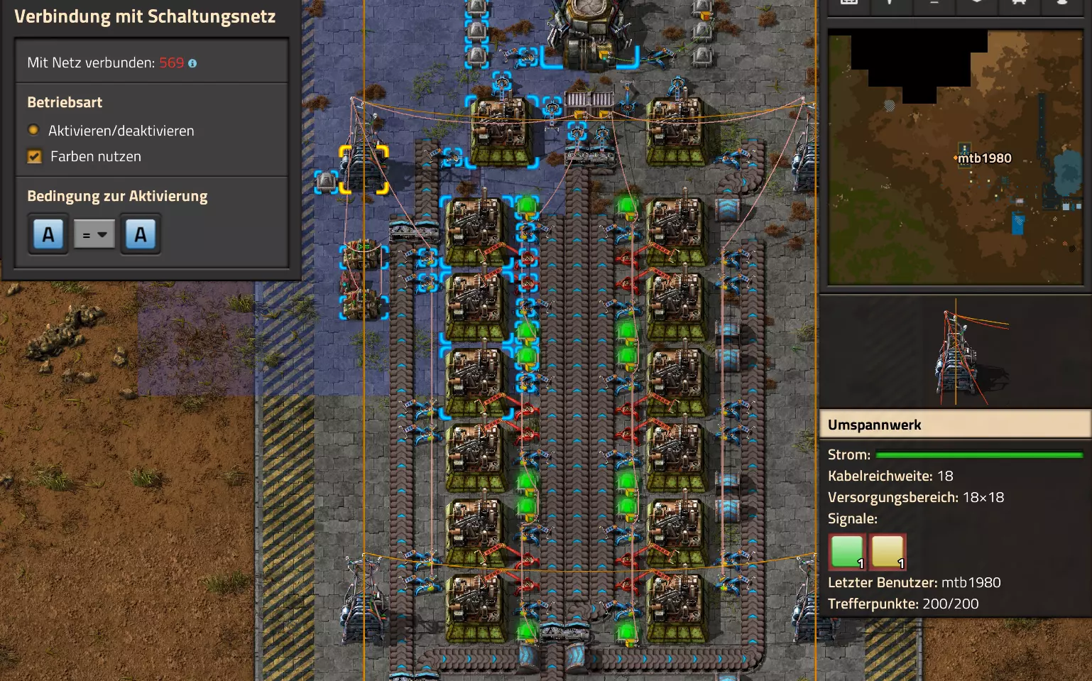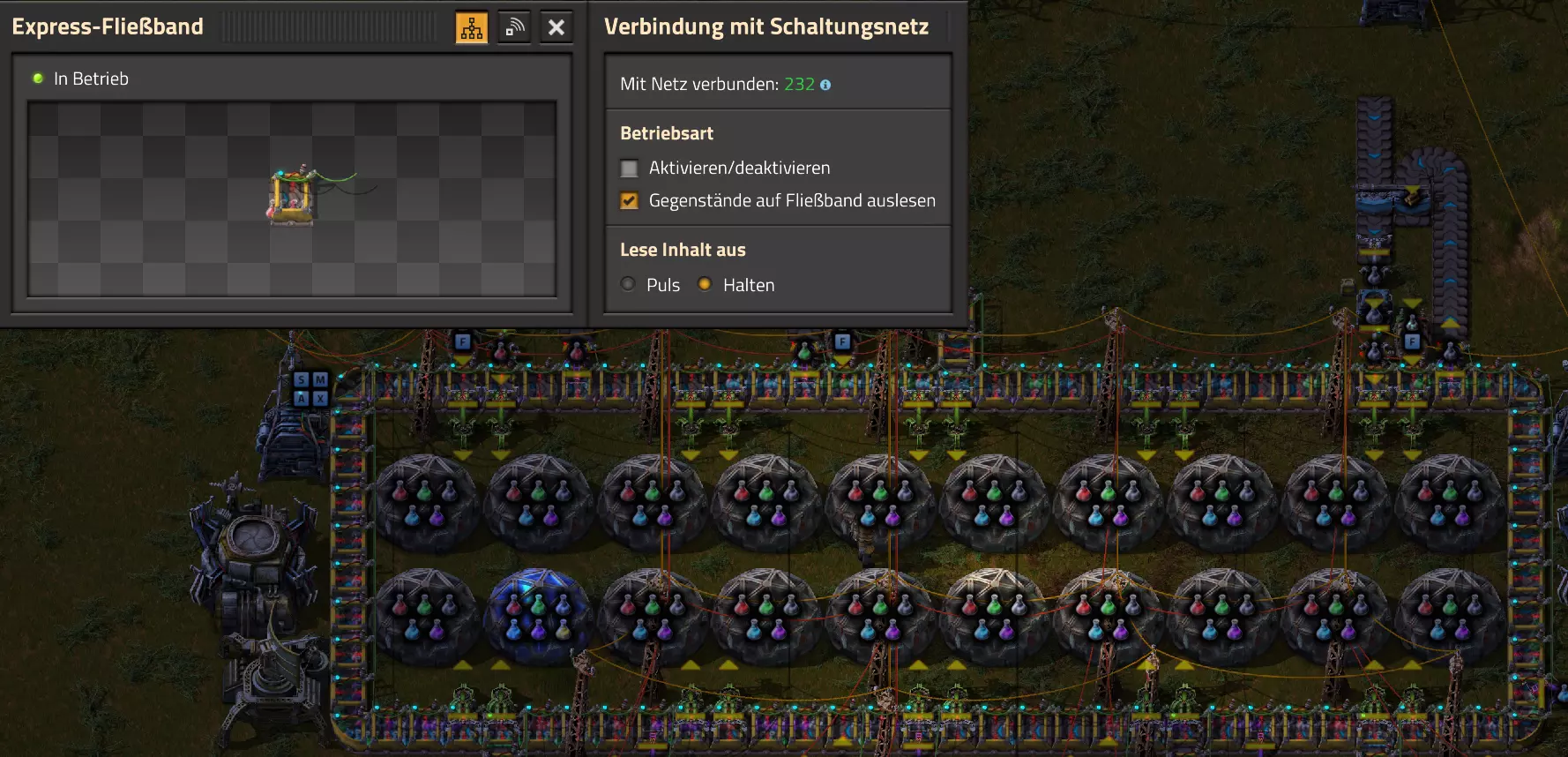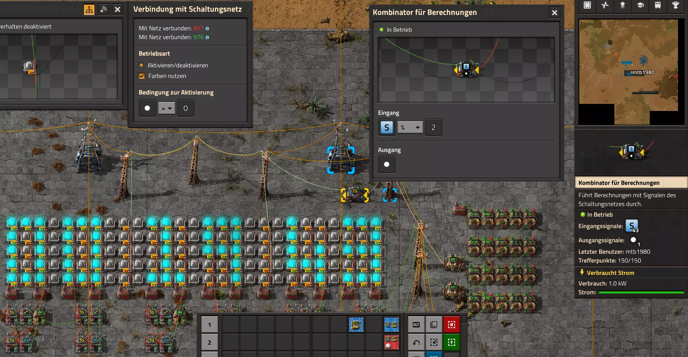 Nachtrag zur Blaupause: Ich hatte mich schon gefreut, dass der Code der Blaupause hier reingepasst hätte. Wenn der unsinnige Steam-Schimpfwortfilter in den Guides nicht mal wieder zugeschlagen hätte. Einige Passagen wurden mit Herzchen ersetzt -.- Daher auch hier wieder der Link zu einem Google-Doc: https://docs.google.com/document/d/1kGbdtH0igx5T_QMFc8MOjfhNyeQ3IJ4LIqh8s_tC6vk/edit?usp=sharing Video: Display-Schaltungen Video: Angepasste Display-Schaltung für Spielzeitanzeige Ich habe das Netz weiter nach Ideen durchforstet und stieß auf ein Video, bei dem es um die Anzeige der eigentlichen Spielzeit ging. Daher hab ich das kurzerhand übernommen, mein Video findest Du hier: In meinem Video verwende ich eine von mir veröffentlichte Tabelle, diese kannst Du hier herunterladen: https://1drv.ms/x/s!AoXhJ5_uZEt1j5VJFk91u9ZqoSAuEg?e=Tzx3tL Das Originalvideo war von Azorae mit dem Titel "Factorio - How to make a Digital Display and Game Clock", hier das Originalvideo: Guide-Playlist PlaylistBeachte bitte folgendes: Playlists werden von Steam nicht korrekt im Steam-Browser übertragen (beziehungsweise auf der Steam-Website nicht korrekt abgespielt): es wird immer nur das erste Video abgespielt. Öffne daher die Playlist in einem richtigen Browser nach Wahl. Die komplette YouTube-Playlist findest Du hier: https://www.youtube.com/watch?v=M8p5x1Z5Gdo&list=PLHcncrCCN2W5VAeaeb2bESmjmVw0klAli Einzel-Video-AufstellungFür die reinen Steam-User hier nochmal alle Einzelvideos aufgereiht; soweit ich das mitbekommen hab, kann Steam keine Playlists abspielen: (Update 2024: Änderungen seit meiner Basisversion des Guides) (Zusatz: Erz- und Ölfeld-Alarme wenn leer) (#6) (#8) (#12) Projekte: (Zusatzvideo zu Bahnübergänge) (Zusatzvideo zu Tankbefüllungen) (Ölverarbeitung) (Forschungsanlage 2 v3) (Forschungsanlage 3 v1) (Robo-Fertigung) Zeitschaltungs-Videos: (Einleitung zu Ticks) (Zeitschaltung bauen: Tage, Stunden, Minuten, Sekunden) (Berechnung und Hilfe zur Bitmaske, Vorbereitung für Displayschaltung) Dazugehörige Microsoft Excel Arbeitsmappe: https://1drv.ms/x/s!AoXhJ5_uZEt1j5VEGjgfHBEaet2vJw (Video zur Displayschaltung und verschiedene Anwendungen) (Displayschaltung mit echter Spielzeitanzeige) Versionsänderungen 11/2024:Neue Inhalte: Abschnitt für Forschungsanlage 3 (v1) eingebaut, speziell an "Space Age" DLC angepasst Video zu Forschungsanlage 3 (v1) eingebaut Video zu neuen Schaltungselementen eingebaut, welche seit der Guide-Erstellung dazugekommen sind Inhalte angepasst: Information bezüglich der neuen Funktionen seit der Guide-Erstellung bei verschiedenen, bisher bestehenden Kombinatoren eingebaut 06/2022:Neue Inhalte: Video zu angepassten Displays angefügt - die echte Spielzeit anzeigen Zusatzvideo zu Bahnübergängen eingebaut Neuen Abschnitt für Erzabbau-Infos eingebaut, enthält nur Video und keine schriftliche Anleitung. Grüße gehen raus an @Sneak0r! Video zum Projekt "Displayschaltung" eingefügt: Displays Video von SeeNo zu "Forschung 1" eingefügt (seine Idee!) Videos zum Projekt "Displayschaltung" eingefügt: Referenzschaltung (inkl. Support-Material) Video "Zeitzähler-Schaltung" eingefügt Video "Einleitung Ticks" eingefügt Video zum Projekt "Robo-Fertigung" eingefügt Video zum Projekt "Forschung 2 (v3)" eingefügt Video zum Projekt "Ölverarbeitung" eingefügt Neuer Abschnitt: "Da fehlt noch was?" eingebaut, direkt über den Kommentaren Inhalte angepasst: Hinweis auf SeeNo's Video zur Forschung 1 im Einleitungstext zum Abschnitt eingefügt Versionsänderung überarbeitet: Anzeige auf Monatsblöcke umgestellt 05/2022:Neue Inhalte: Video über dem Ölverarbeitungsbeispiel eingefügt, warum ich bei Tanks immer den Durchschnitt rechne 08/2021:Neue Inhalte: Video zur Füllstandsanzeige Spezial eingebaut (Beispiel Lampen Füllstandsanzeige) Video zur FlipFlop-/RS-/SR-Schaltung eingebaut (Auto-Abschaltung) Inhalte angepasst: Bei den YouTube-Videos die Kommentar-Funktion aktiviert 07/2021:Neue Inhalte: Video zu Lautsprecher und Alarmen eingebautVideo zur Einstellung von Filtergreifarmen eingebaut Video zu den Basis-Kombinatoren erstellt Video zu den Stern-Variablen erstellt Video zu Greifarm-Einstellungen und Lampen erstellt Video-Playlist für alle Guide-Videos eingesetzt Neuen Bereich zu Ansichtsoptionen in Factorio nach dem vergleichenden Kombinator eingefügt Video zur Einleitung bereitgestellt Neue Beispiele eingefügt: Automatisierte, teilintelligente Roboter-Fertigung eingebaut Neue Beispiele eingefügt: Display-Stückzahl-Anzeige (groß) eingebaut Timer-Anzeige hh:mm:ss (kompakt) eingebaut Bahnübergänge sichern Abschnitt über Detailinfo zu den Gruppenvariablen hinzugefügtVorwort ergänzt: Neuen Abschnitt angelegt mit Hinweis, dass nicht jedes Problem mit einer Schaltung optimal gelöst werden sollte ;) Beispiele für verschiedene Forschungskomplexe eingebaut SR-Latch (Flipflop) Schaltung hinzugefügt -> Anlagenteile abschalten Inhalte angepasst: Einige Rechtschreib- und Satzfehler behoben Einleitung ergänzt Playlist-Abschnitt überarbeitet, im Steam-Guide lässt sich keine Playlist direkt abspielen. Daher zusätzlich alle bisherigen Einzelvideos zusätzlich einzeln nochmal angeführt Hinweis zu Bildern in der Einleitung hinzugefügt (Bild-Collagen) Überschriften der Beispiele umgeschrieben und gekürzt für bessere Lesbarkeit in der Seitenspalte Mehrere Rechtschreibfehler korrigiert, Einleitungsabsatz mit Splitter-Beispiel überarbeitet Einige Materialwortfehler ersetzt (habe ab und an Rohöl statt Schweröl geschrieben) Übersicht bei Versionsänderungen neu aufgebaut 06/2021:Neue Inhalte: Abschnitt für Zeitschaltung eingebaut Filtereinstellung eingebaut Beispielprojekt Kisten gleichmäßig befüllen eingebaut Abschnitt für verbesserte Ölversorgung fertiggestellt Lampen-Schaltungen fertiggestellt Beleuchtungsskala für Füllstände (Projektbeispiele) eingebaut Beispiele für Hinweismitteilungen eingebaut Miditorio-Abschnitt (Musik in Factorio) eingesetzt G