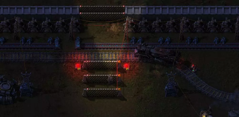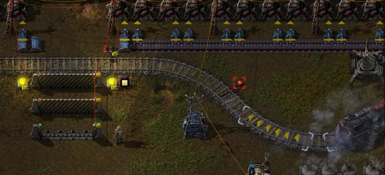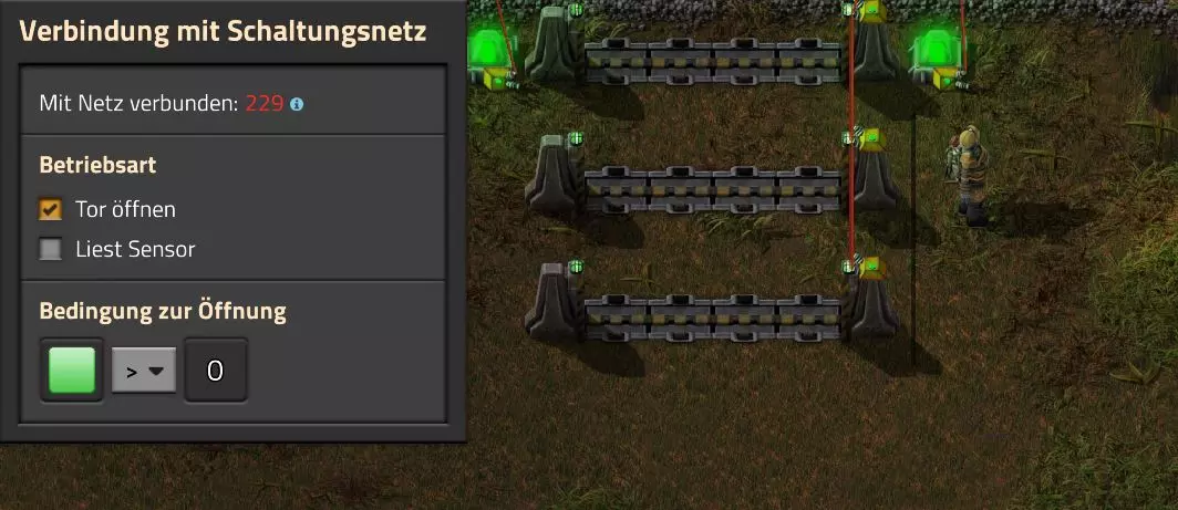 我对附近使用的列车信号进行了设置,使其能够显示信号灯颜色。建议从初始状态设置为红/黄/绿三色。 这就是第一种解决方案。 第二种方案是,当玩家进入特定区域时,自动将列车信号设为红色。虽然没有专门的“压力板”,但自动门可以实现类似功能。 因此,我在铁路道口前安装了几扇门。现在用红色电缆将这些门与现有的电路网络连接起来。但需要注意的是,必须在门旁边放置一个墙壁方块:电缆无法直接连接到门上,只能连接到门旁边的墙壁方块。虽然这一点可能难以理解,但否则可能会产生疑问。