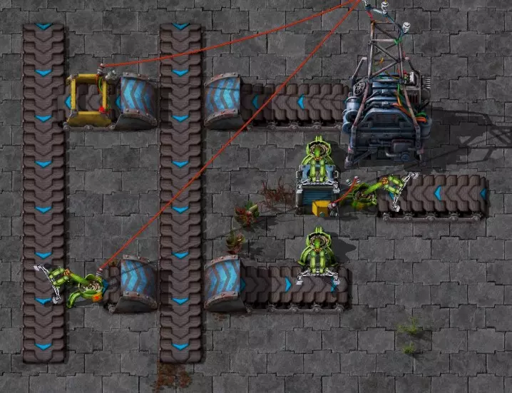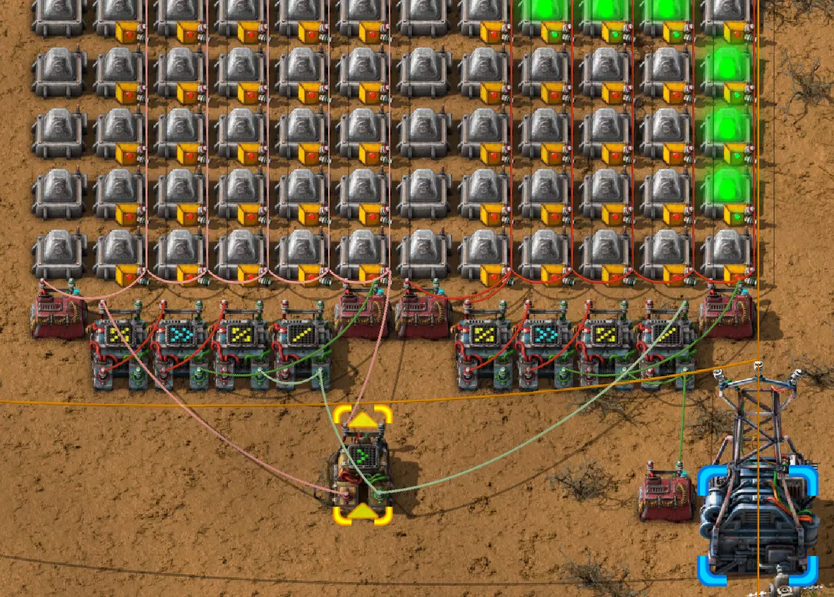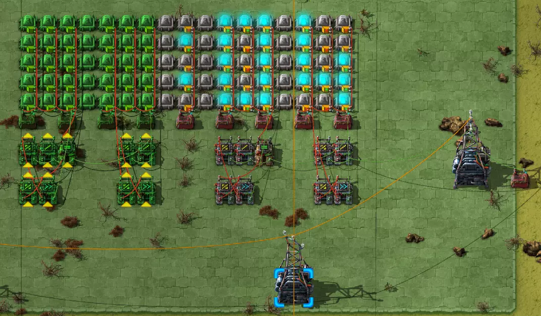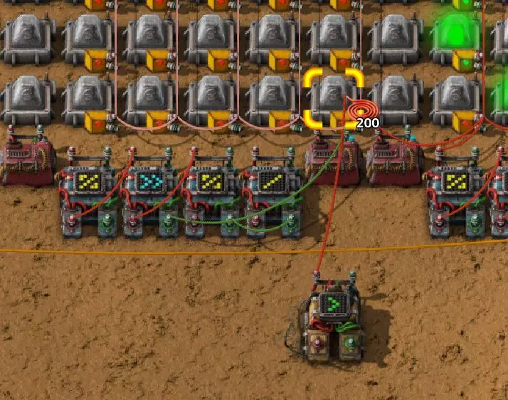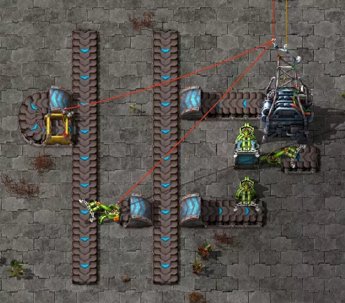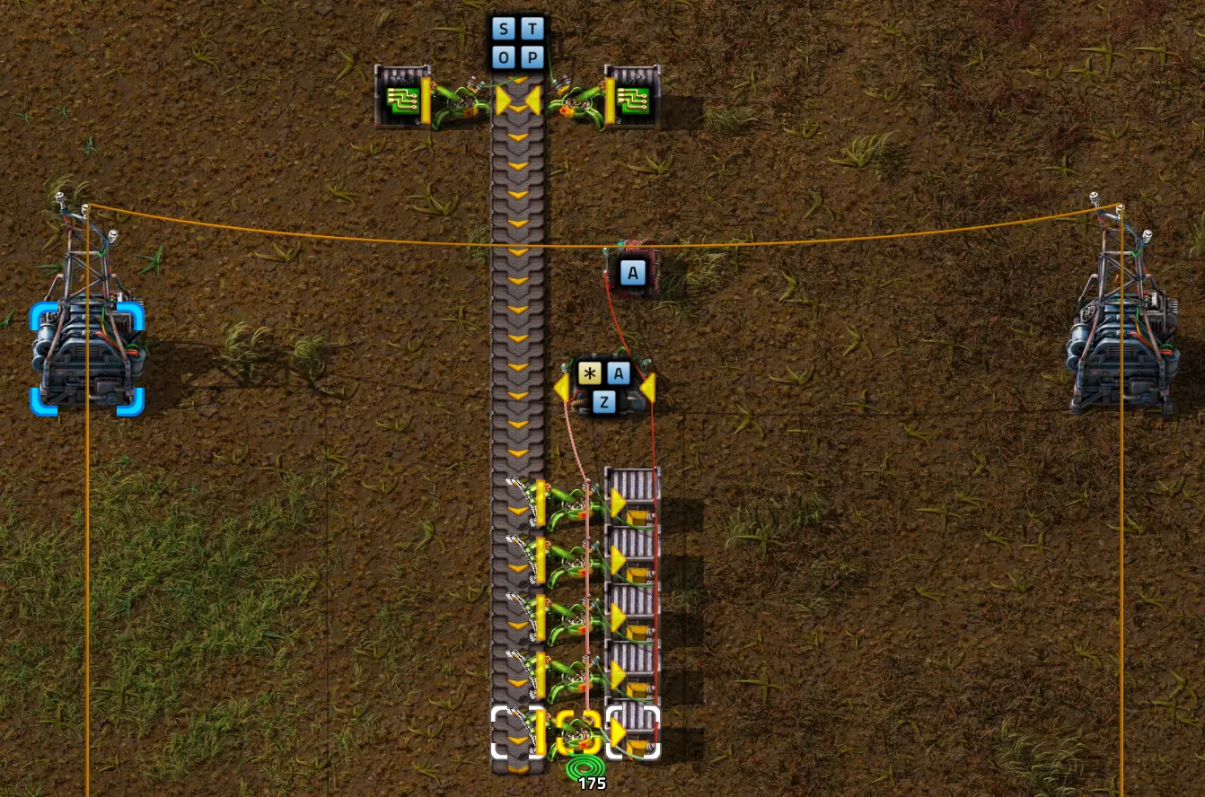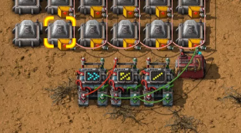不过这样电路还是无法工作,因为抓取器不知道每个箱子里有多少物品。所以现在我们必须用绿色电缆将抓取器分别连接到对应的箱子上。按Q键可以取消拉电缆时的继续连接操作。 现在我要用绿色电缆将所有抓取器分别与其对应的箱子连接起来: