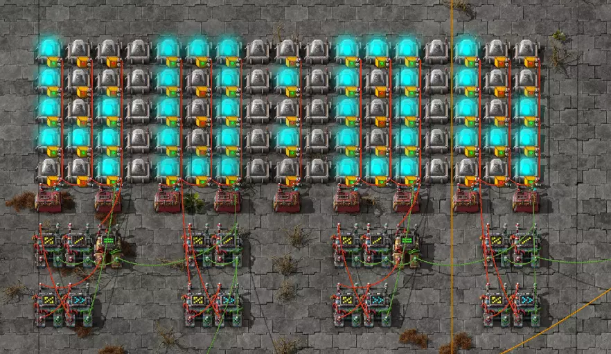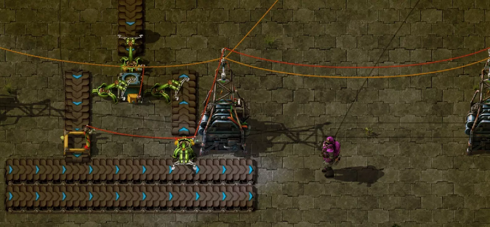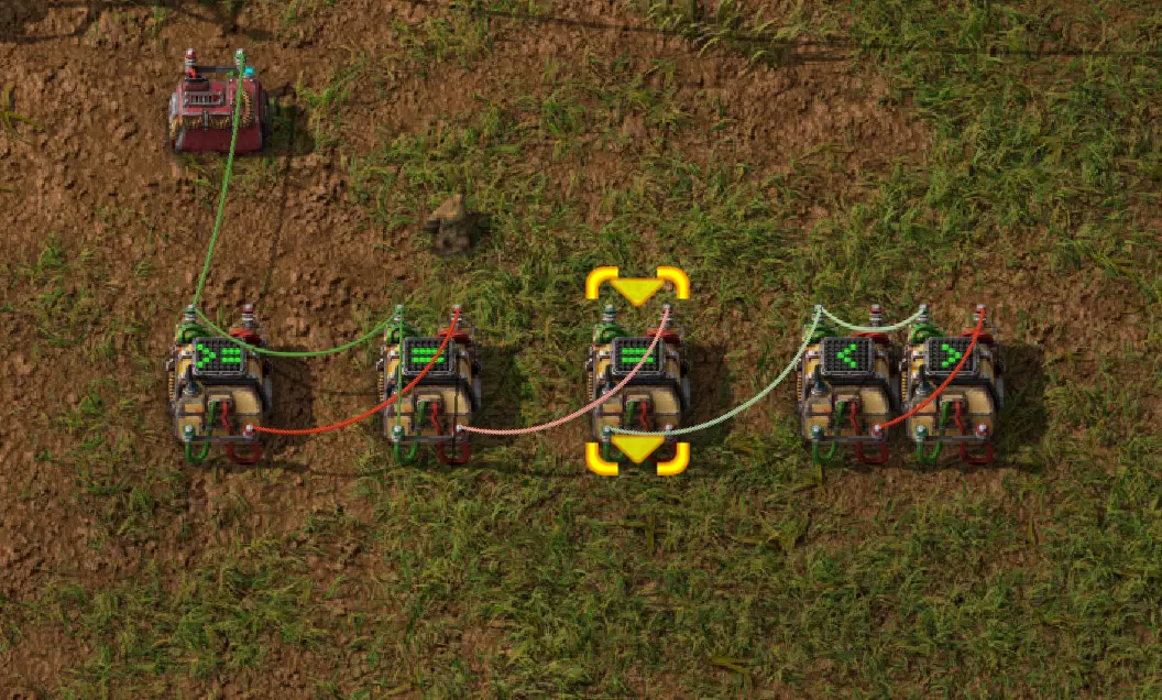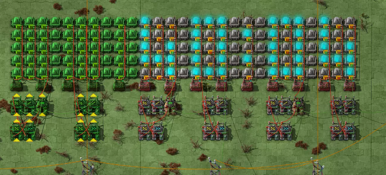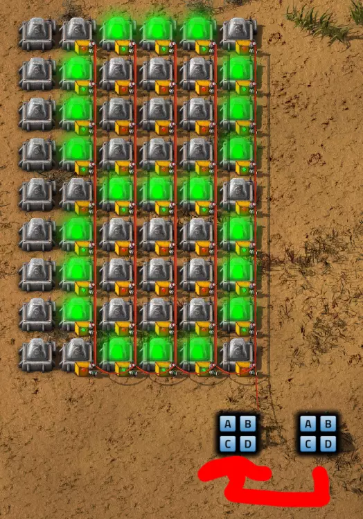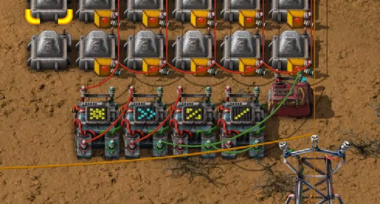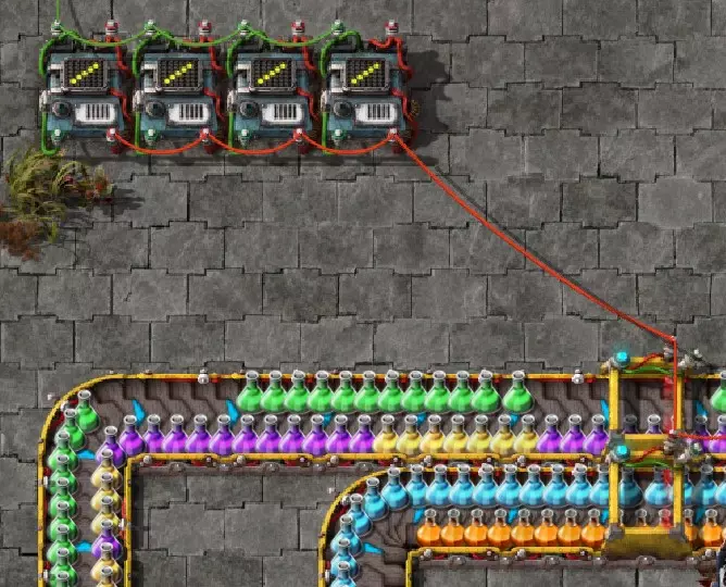 不过这样电路还是无法工作,因为抓取器不知道每个箱子里有多少物品。所以现在我们必须用绿色电缆将抓取器分别连接到对应的箱子上。按Q键可以取消拉电缆时的继续连接操作。 现在我要用绿色电缆将所有抓取器分别与其对应的箱子连接起来: