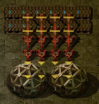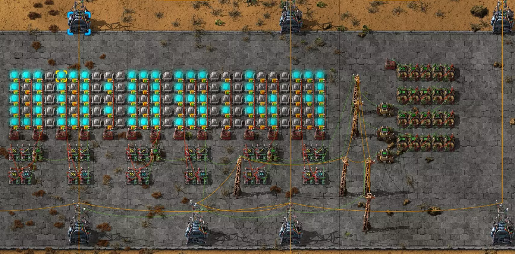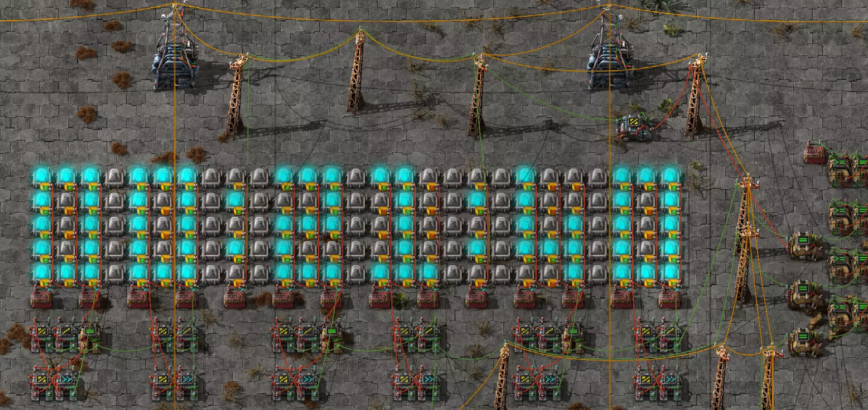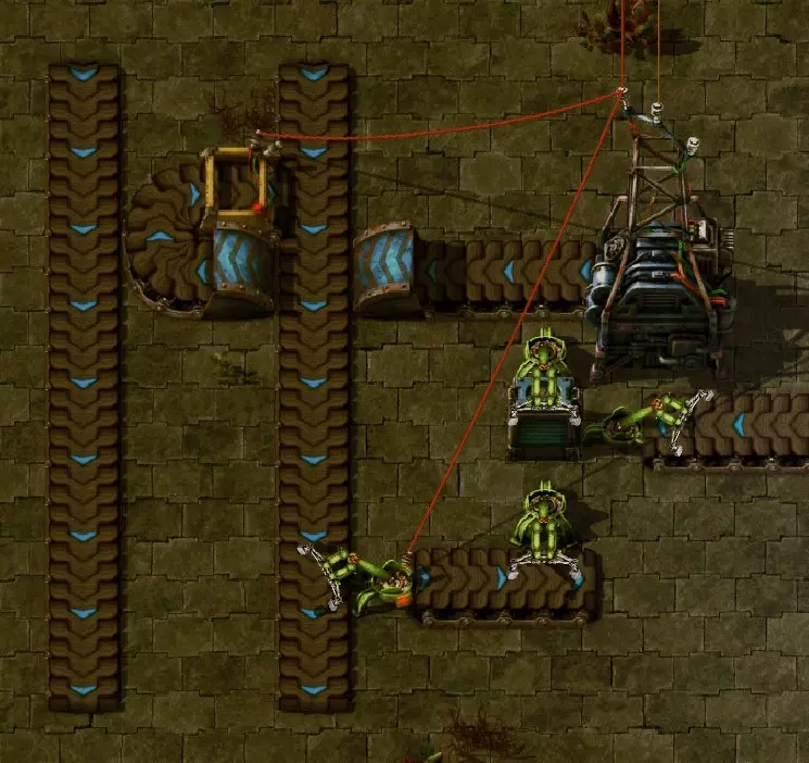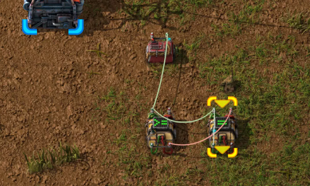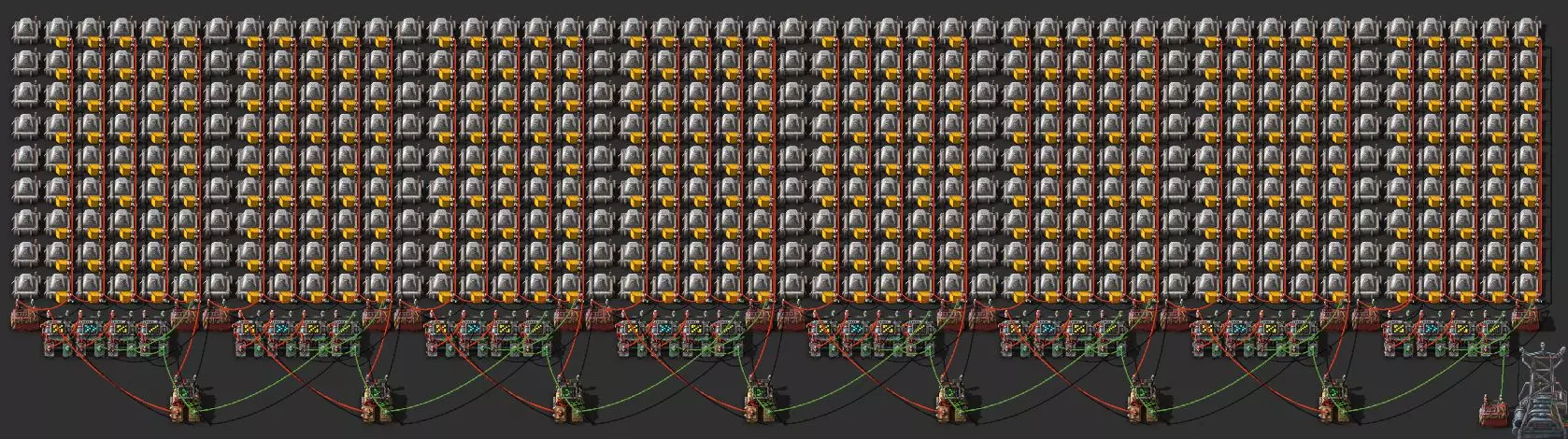 不过这样电路还是无法工作,因为抓取器不知道每个箱子里有多少物品。所以现在我们必须用绿色电缆将抓取器分别连接到对应的箱子上。按Q键可以取消拉电缆时的继续连接操作。 现在我要用绿色电缆将所有抓取器分别与其对应的箱子连接起来: